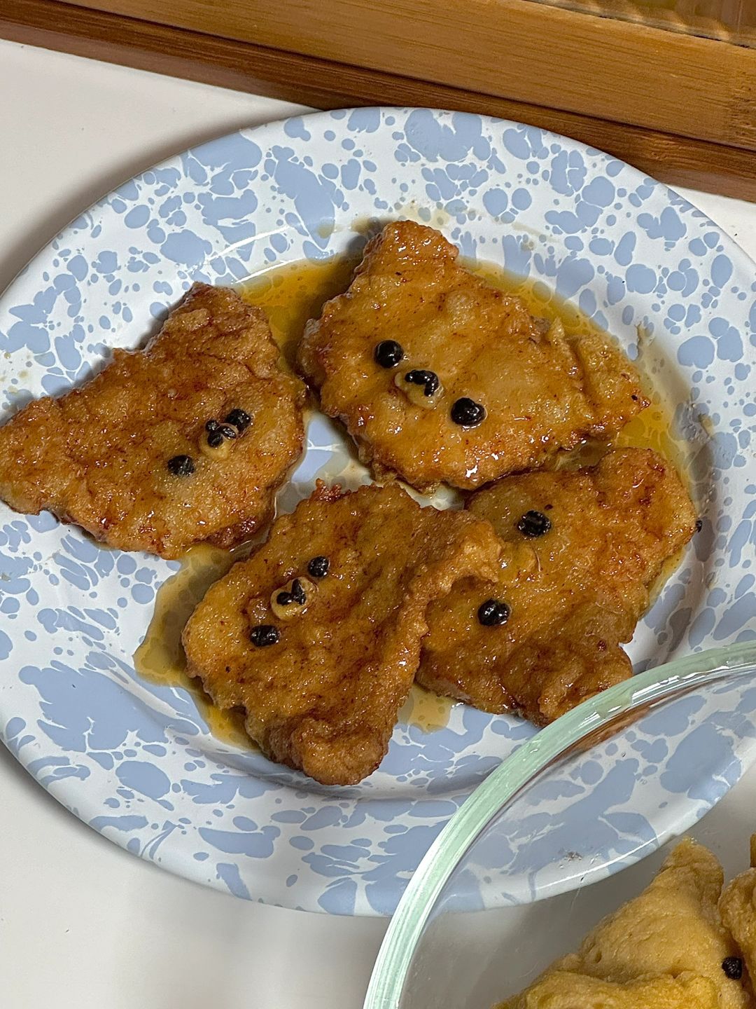 小熊锅包肉:猪肉片、盐、胡椒、土豆淀粉(提前用水泡成非牛顿液体)、油