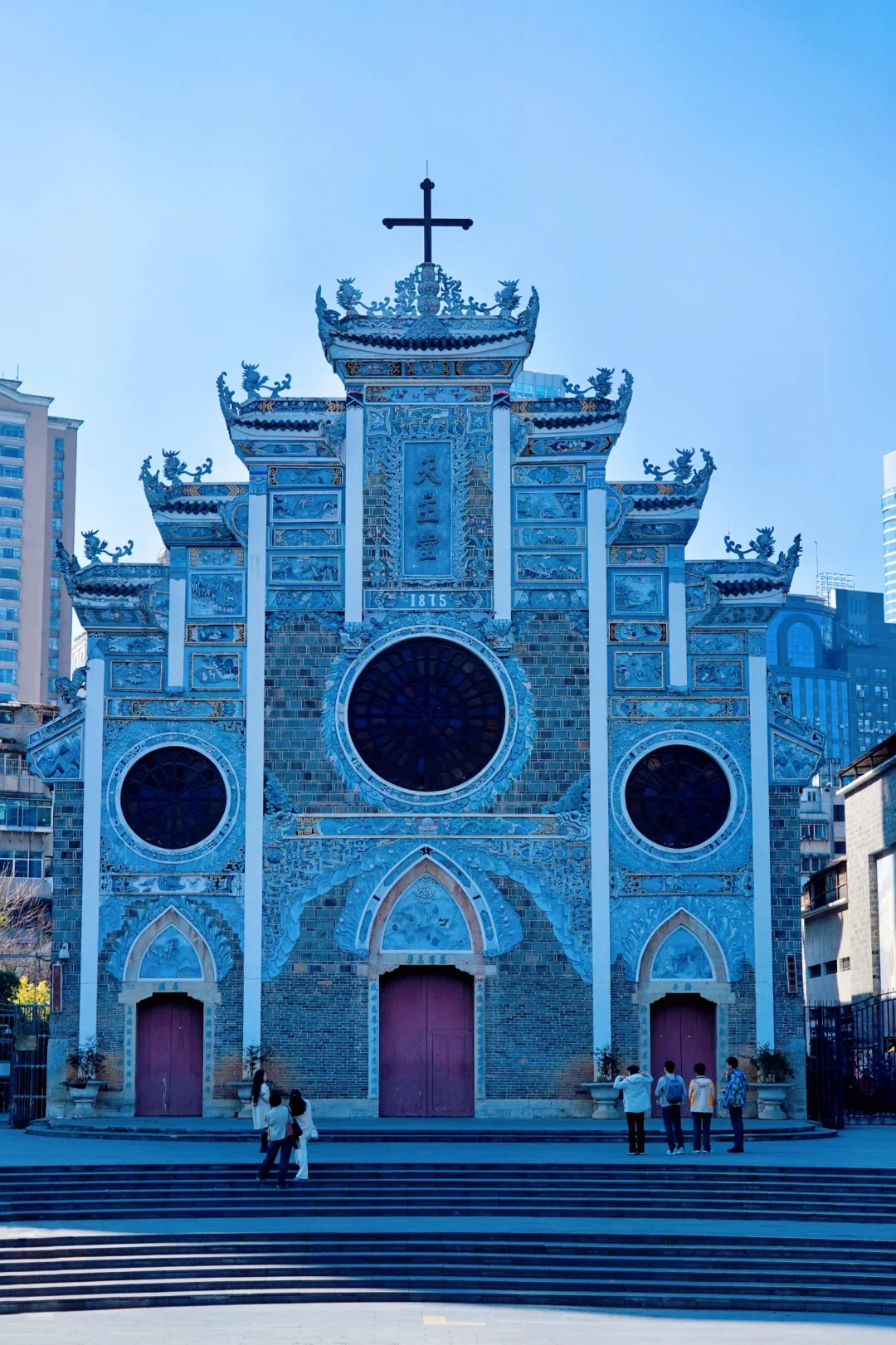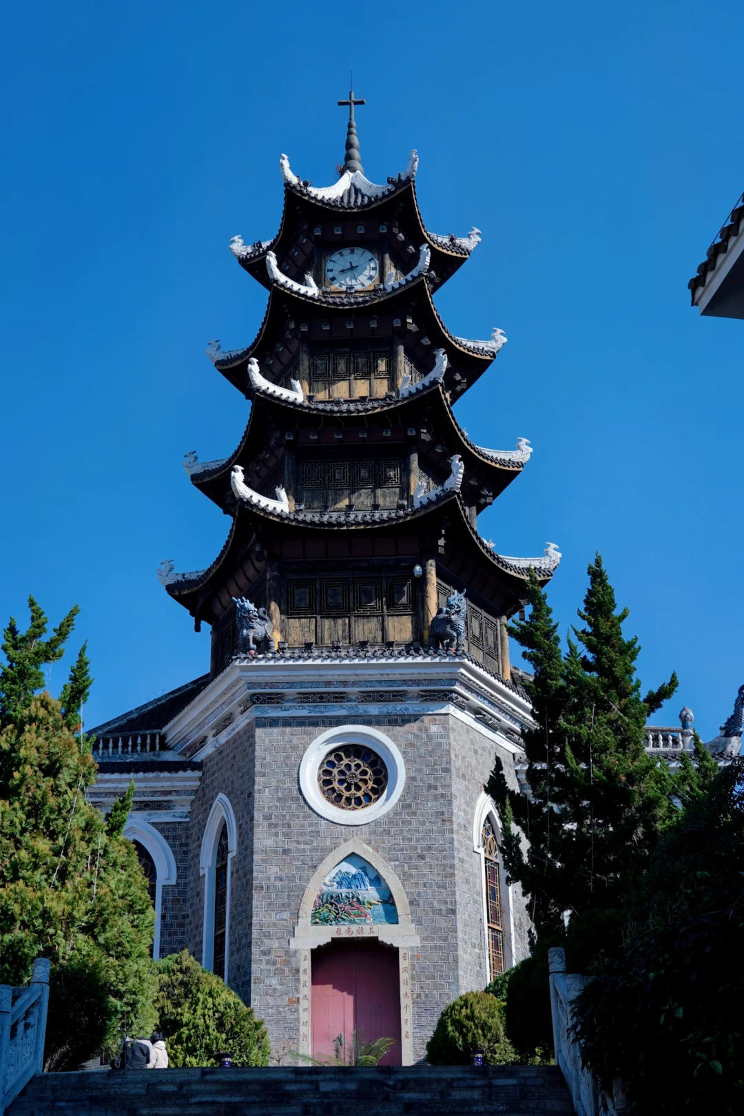 🔹北天主教堂:颇有民族特色的中西结合天主教教堂,一面是钟楼,穿过铁门走到另一面融合了民族特色的牌坊。