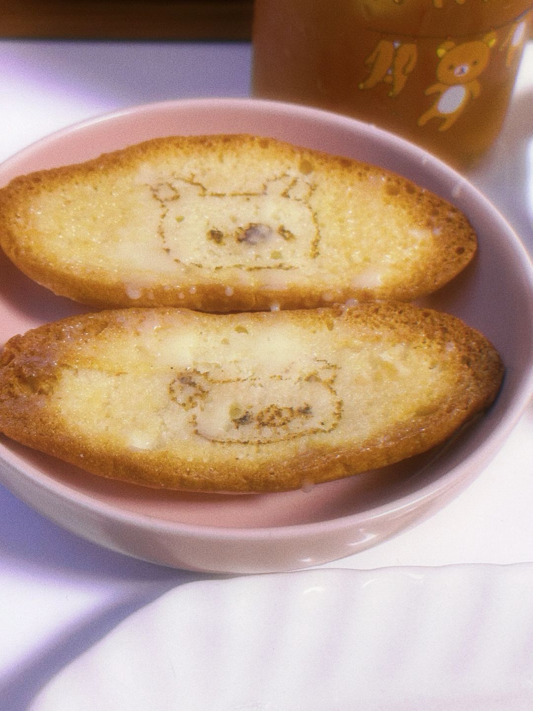 3.冷却后对半切开,抹上黄油,180度烤15分钟(仅供参考上色满意即可),用色素画上小熊淋上炼乳