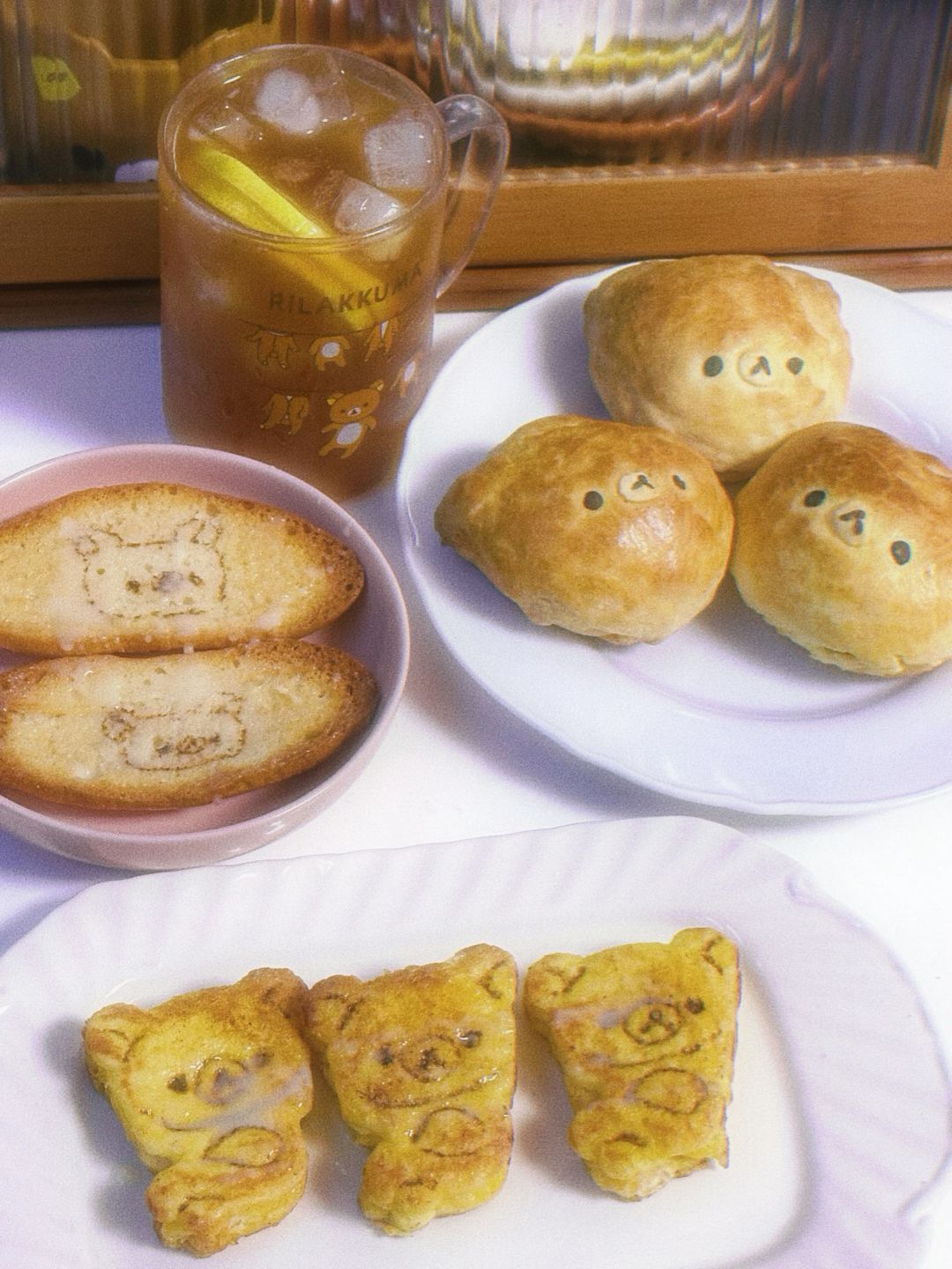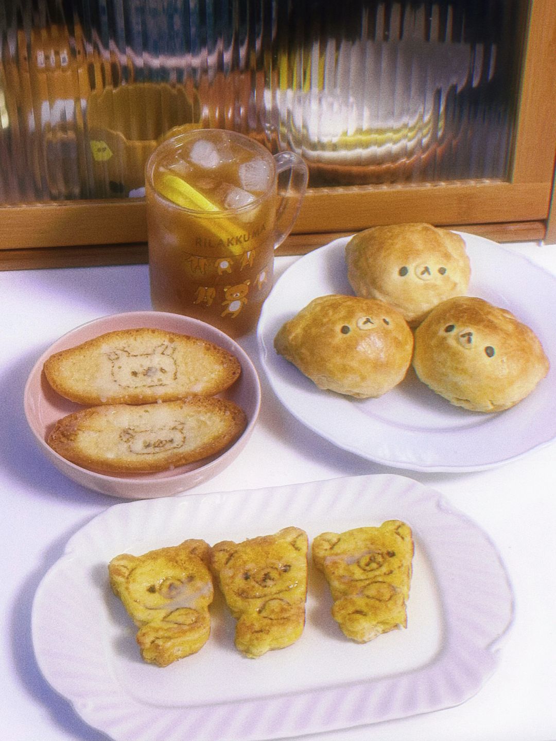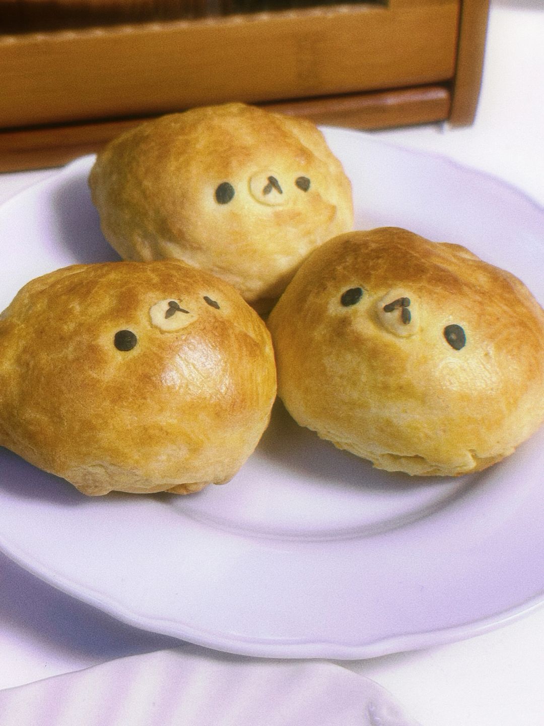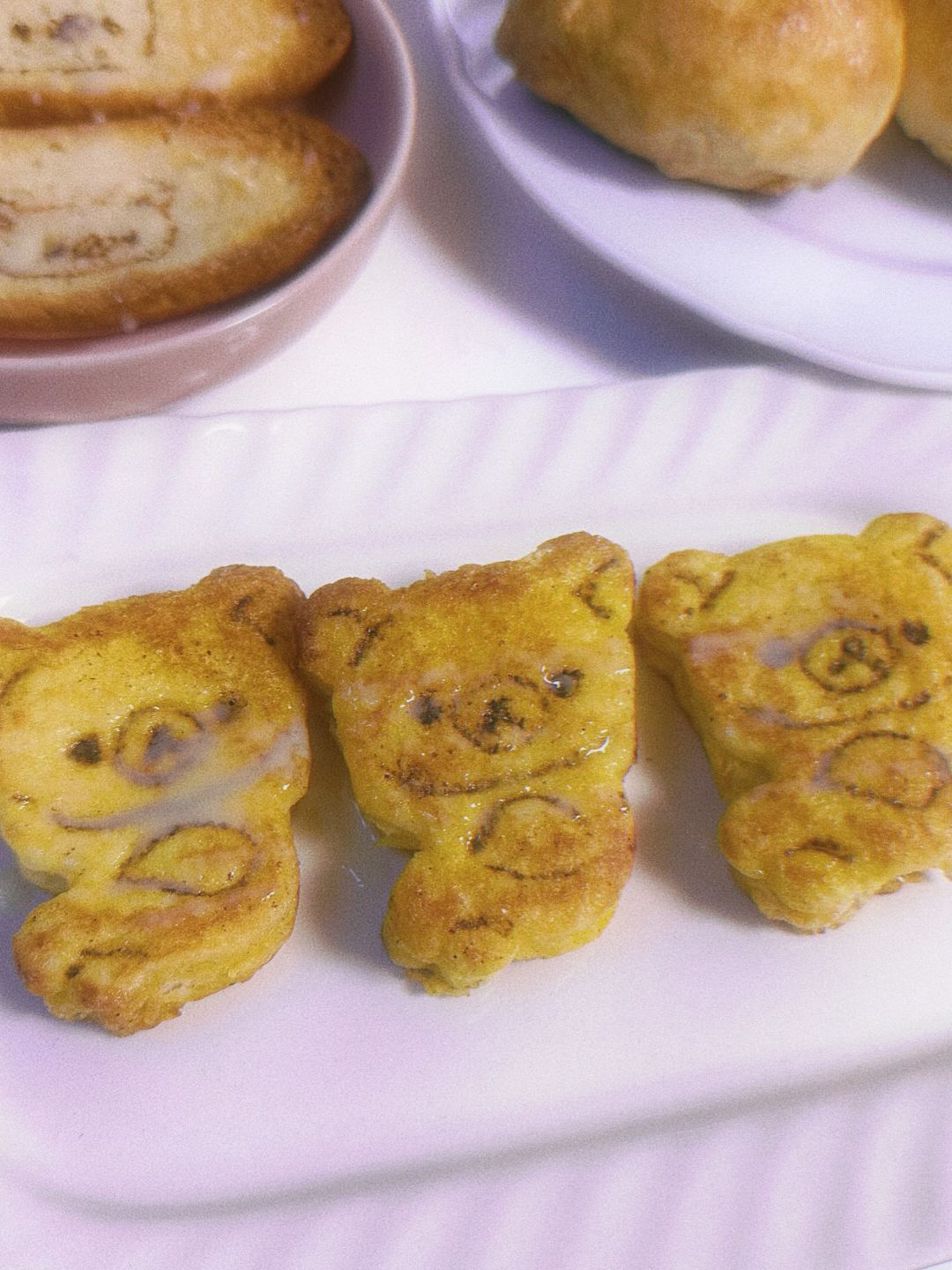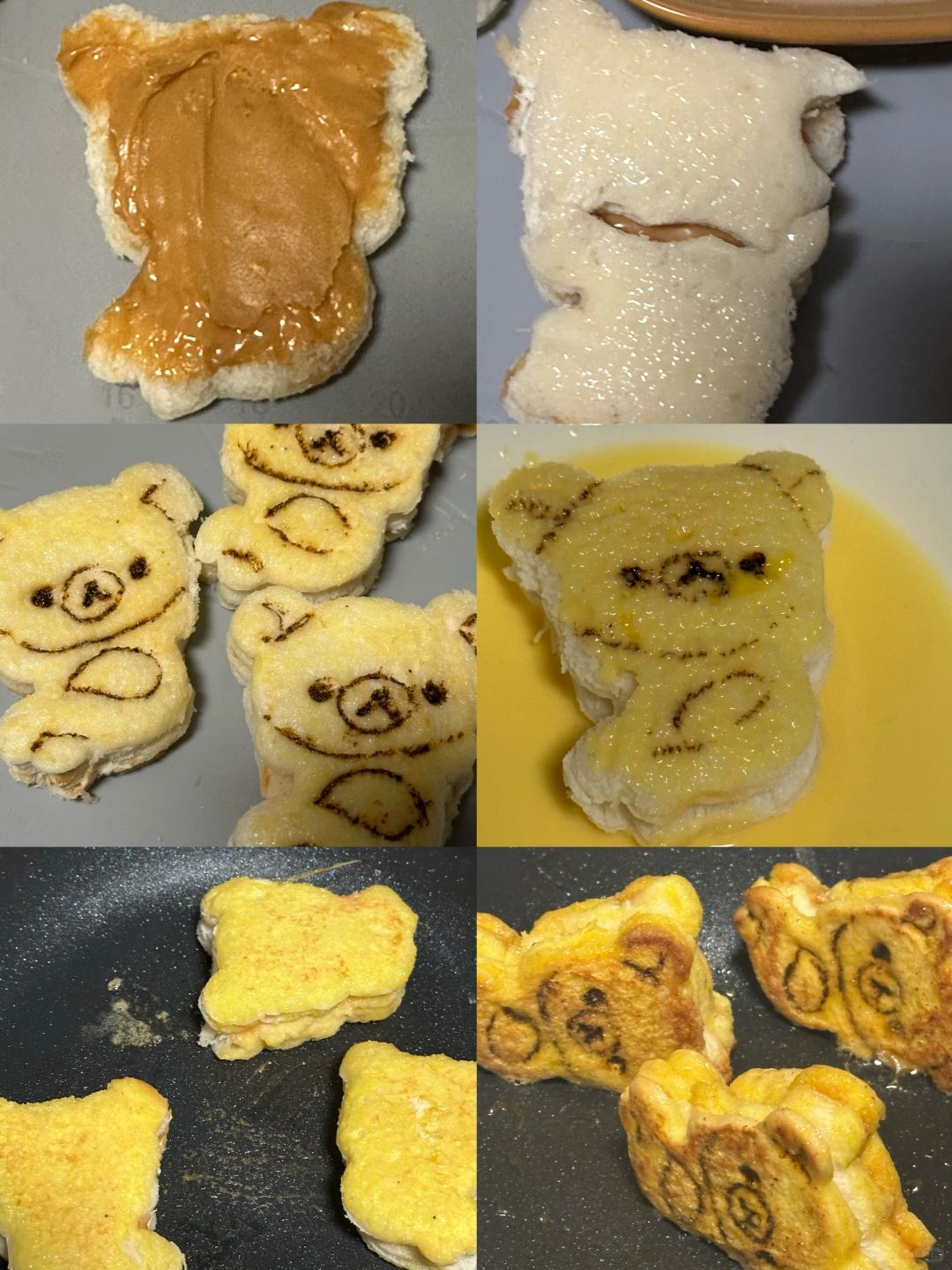 1.吐司用模具按出轻松熊,三个为一组,中间两层分别抹上花生酱和炼乳、用色素画上轻松熊表情,表面均匀沾上蛋奶液