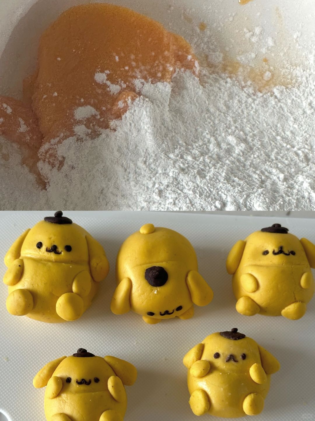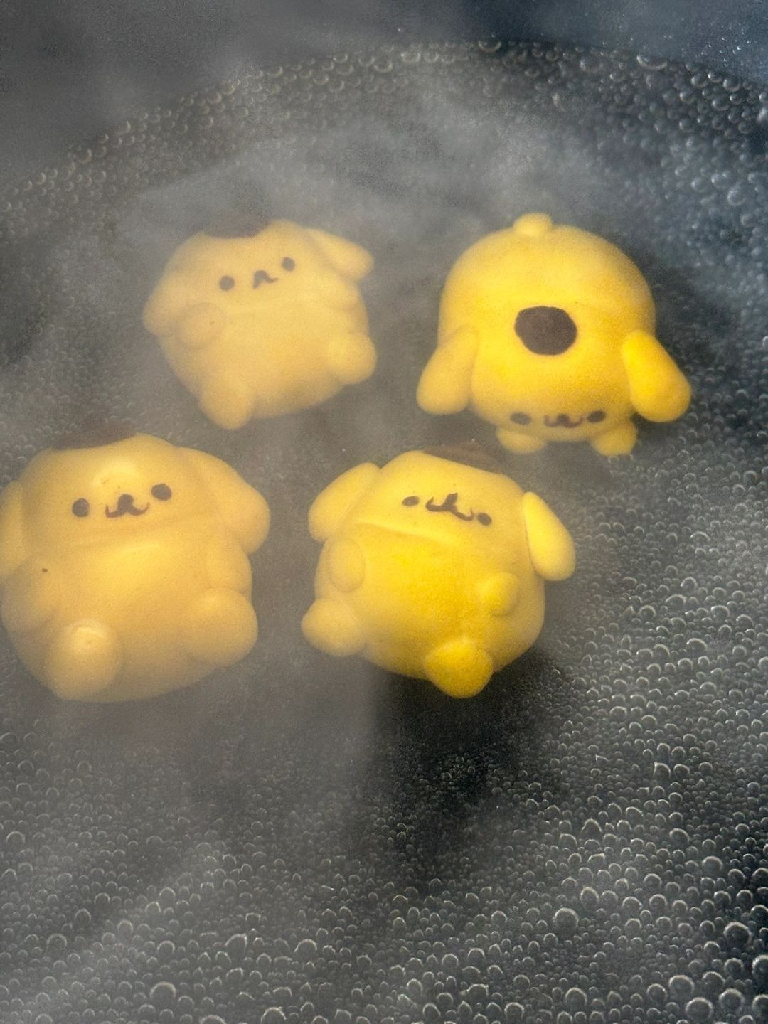 5.芒果加糯米粉揉成团,分一点加入可可粉,作出布丁狗的形象,水开下锅小火煮至浮起