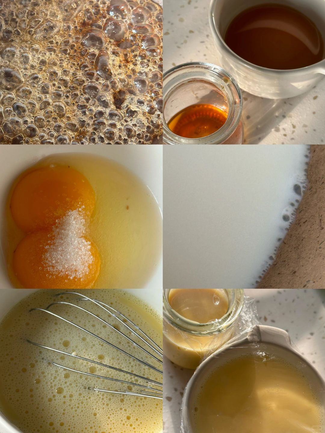 布丁:1个蛋黄、1个全蛋、180g牛奶、15g糖、10g糖