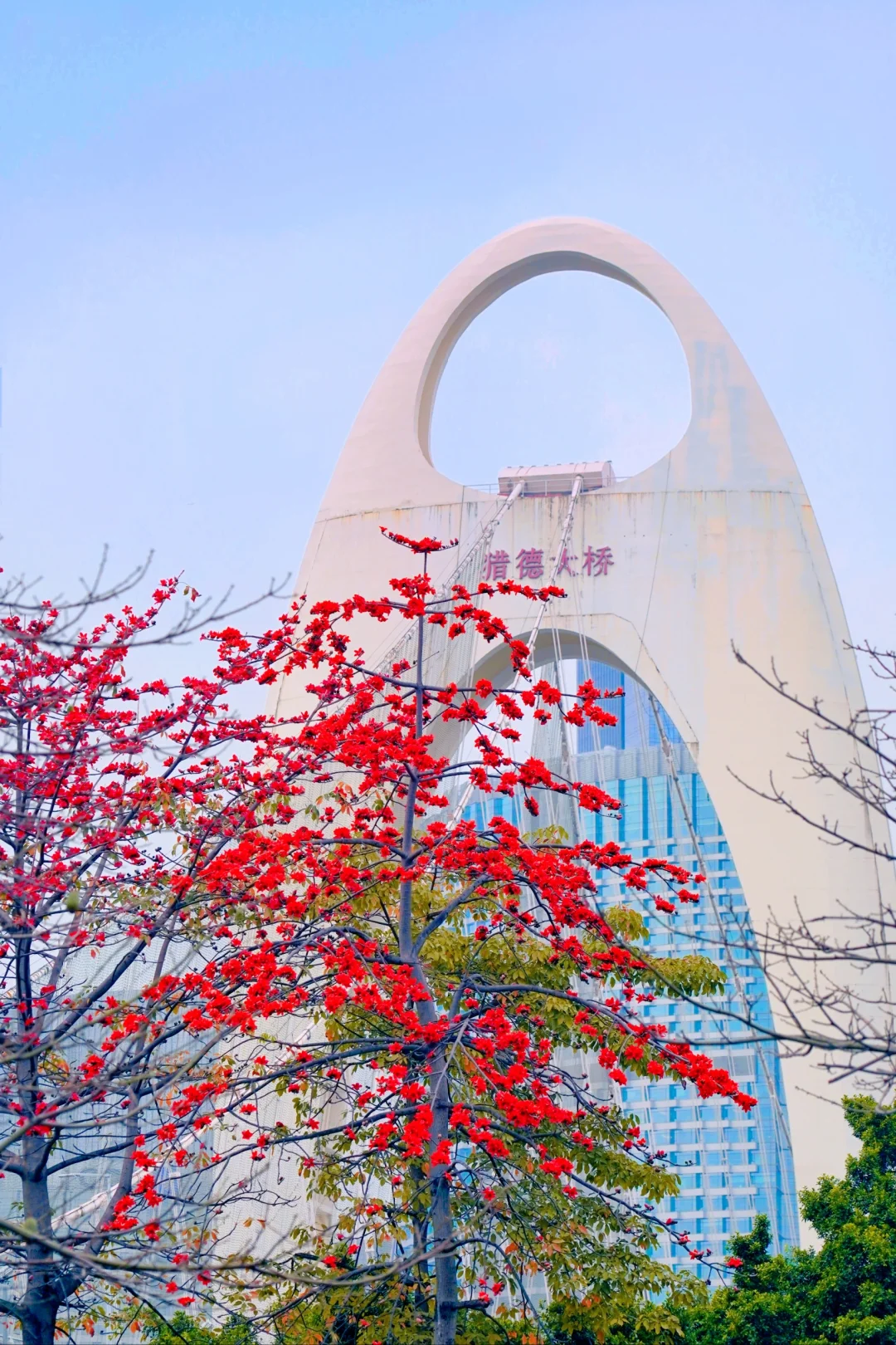 马路对面可以拍到猎德大桥与木棉花的同框图