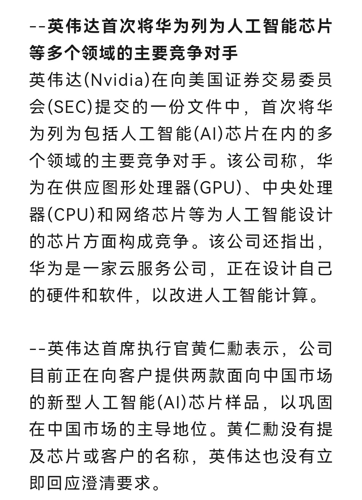 昨天《环球时报》写社评时,采访了我,我相信英伟达是守不住中国市场的。