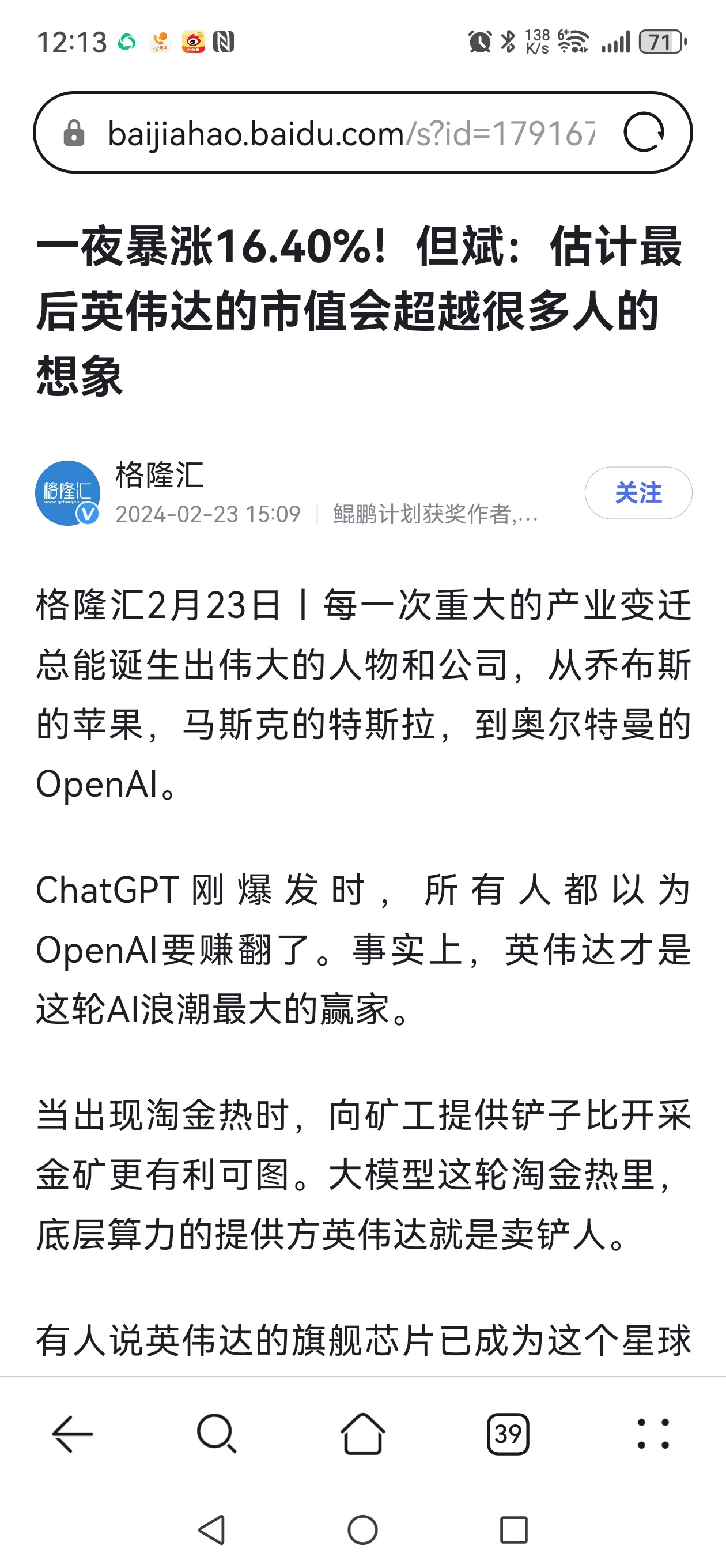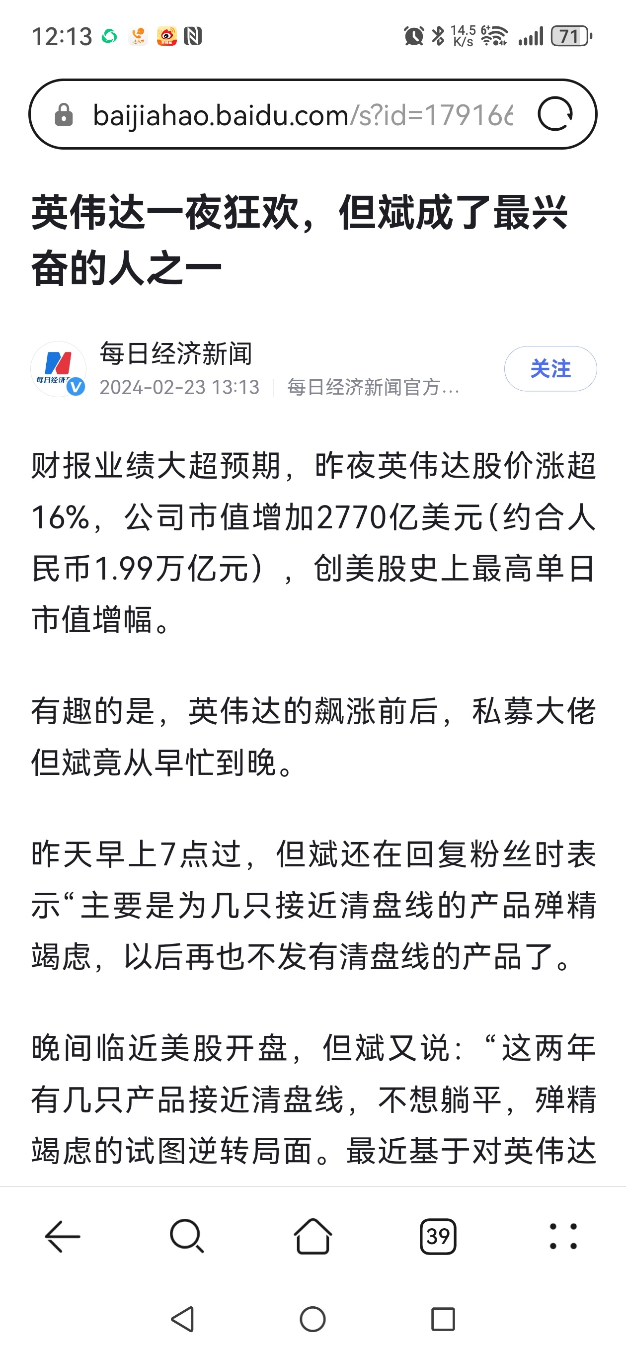 早晨一篇说英伟达的文章,就有很多人给我留言说但斌很看好英伟达,我好奇去翻了翻,有若干媒体都报道了但斌对英伟达的兴奋,以及他微博上的内容。