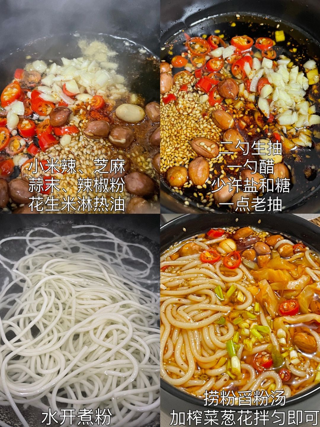 3⃣️水开煮粉煮熟,捞粉舀粉汤到碗中,加榨菜葱花拌匀即可。