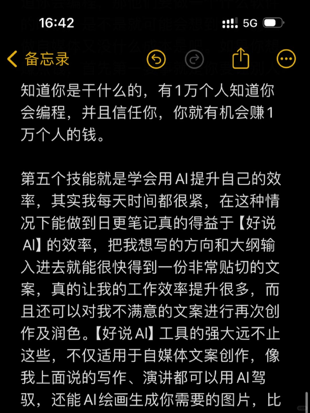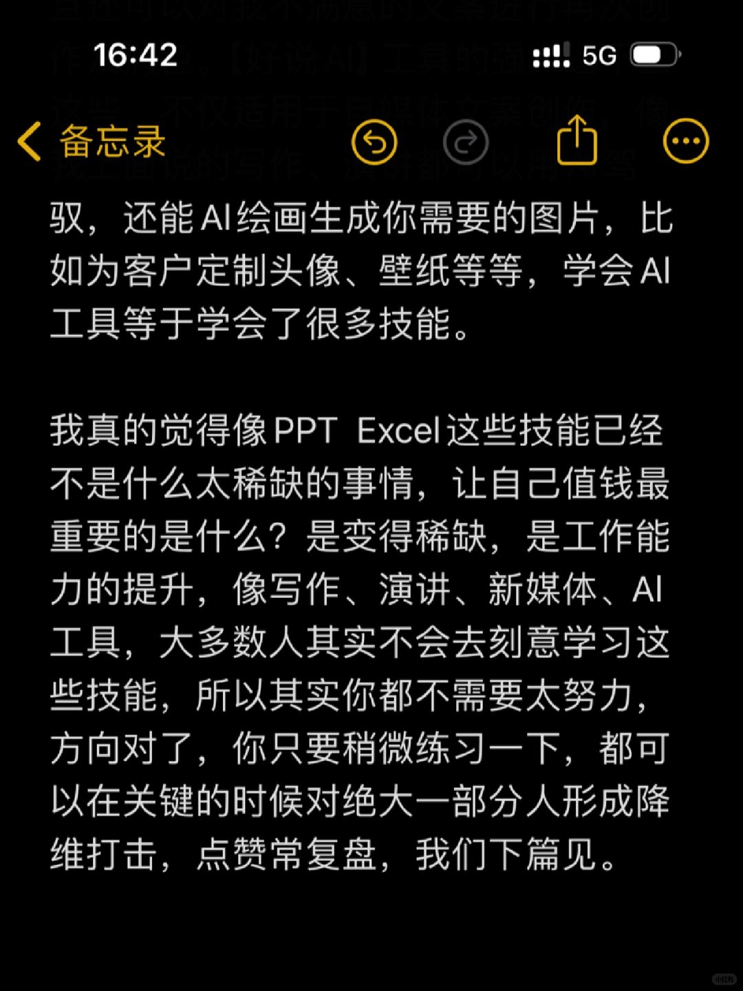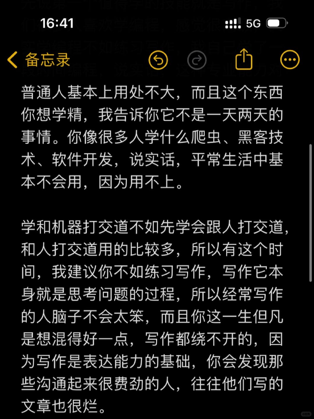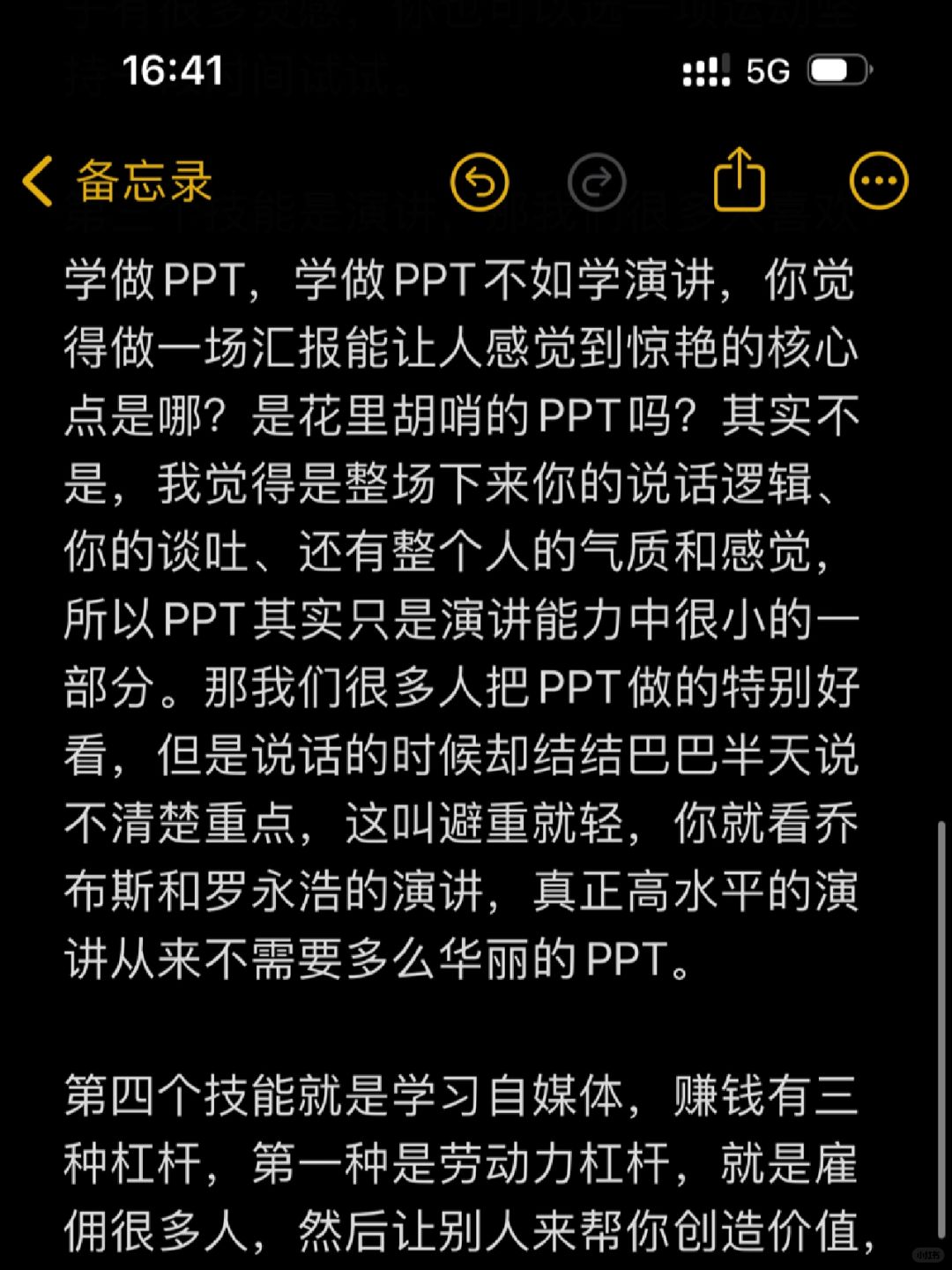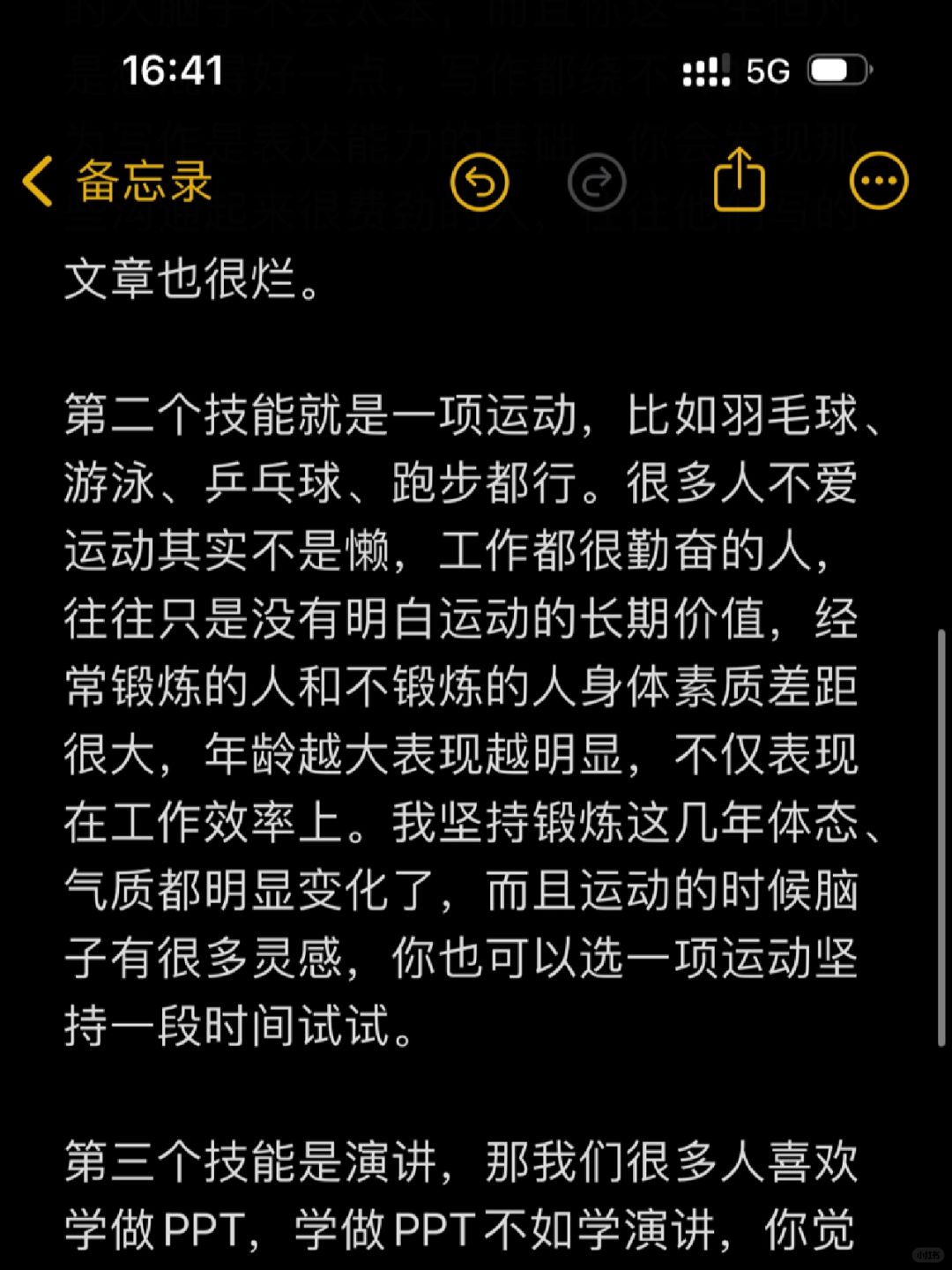 第一个值得学的技能就是写作 第二个技能就是一项运动,比如羽毛球、游泳、乒乓球、跑步 第三个技能是演讲 第四个技能就是学习自媒体 第五个技能就是学好说Al提升自己的效率
