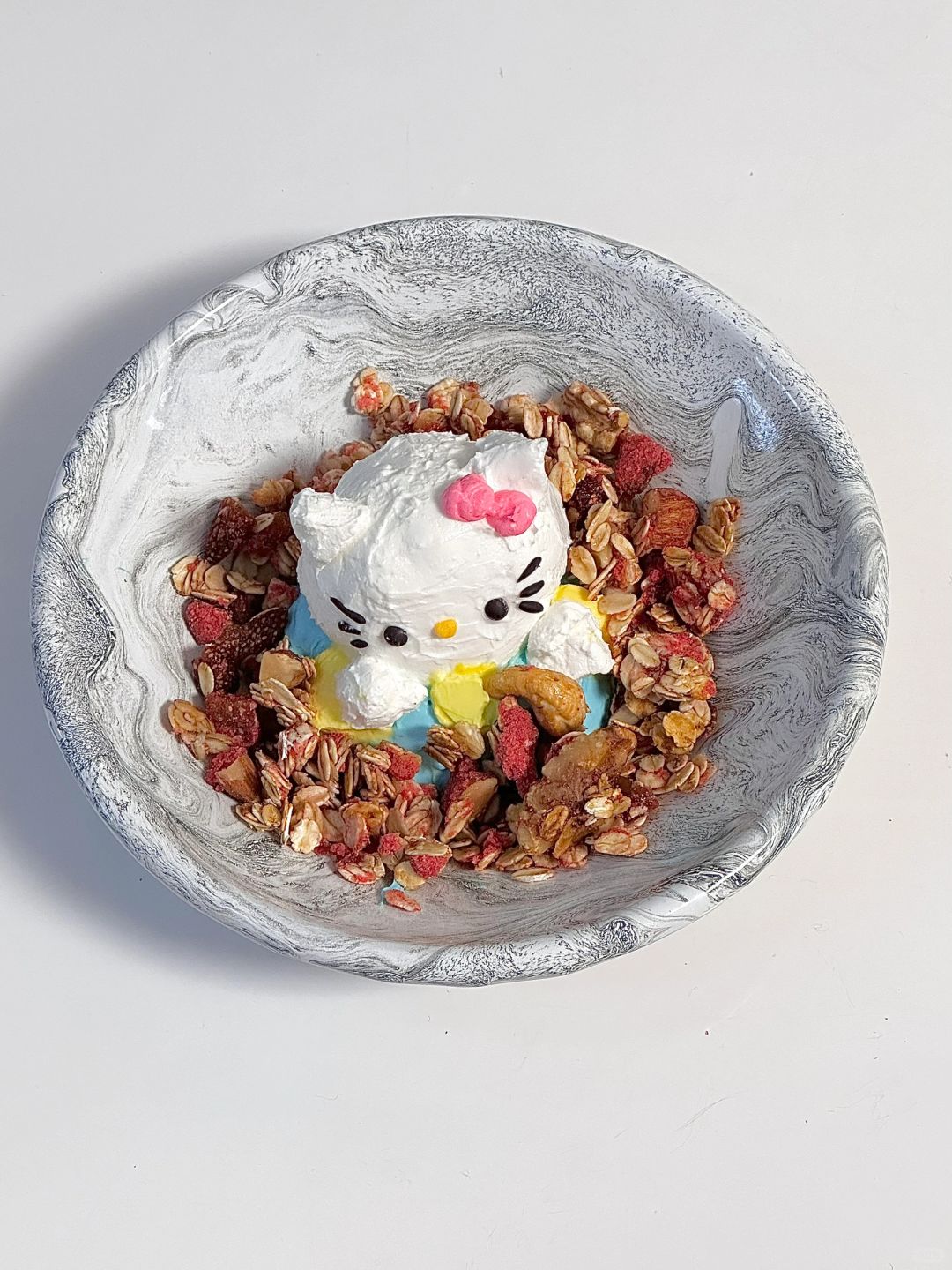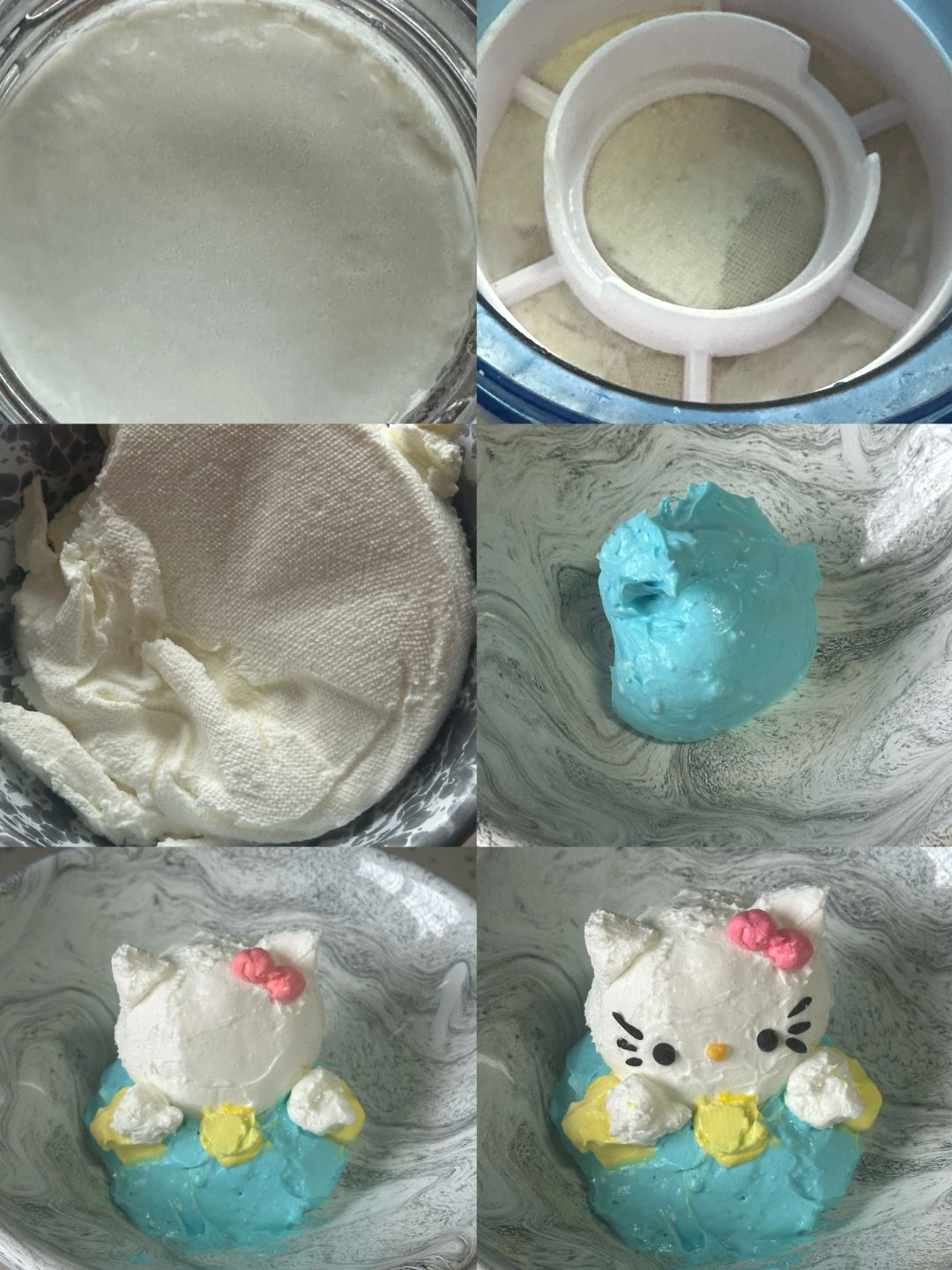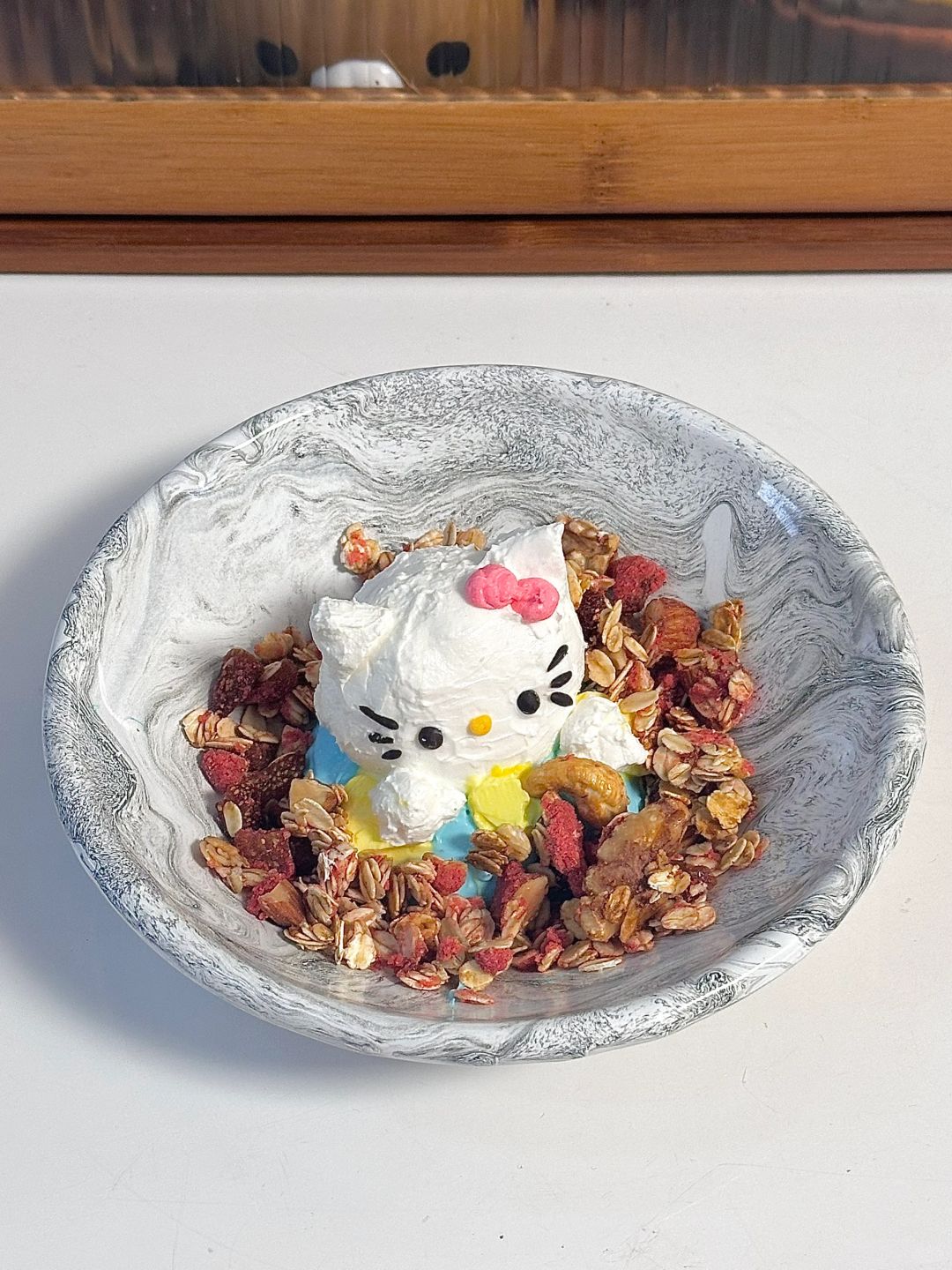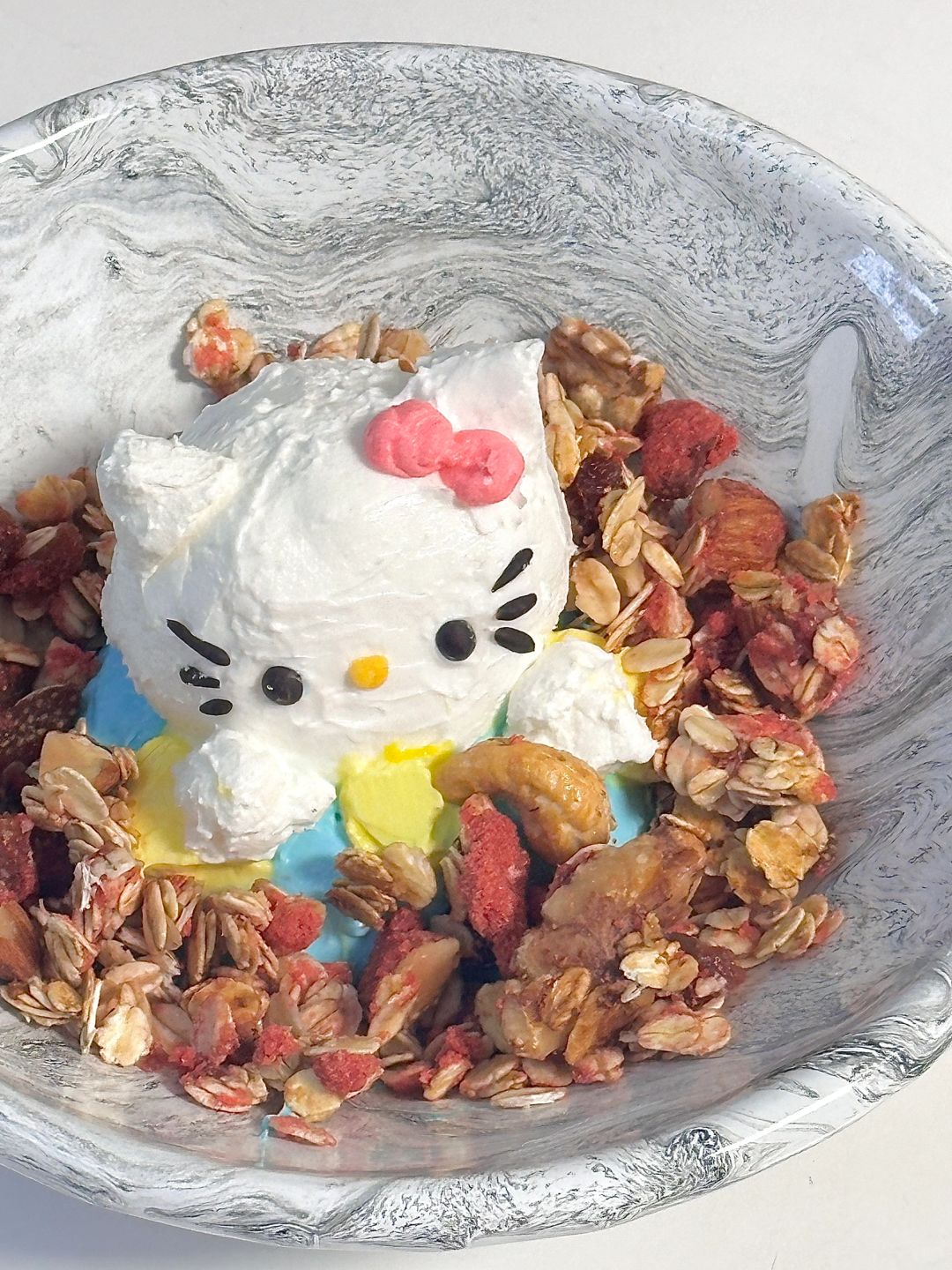 6.过滤好的酸奶分份调色,想象你是雕塑家开始塑形,巧克力隔水融化画上表情,撒上刚刚做的granola
