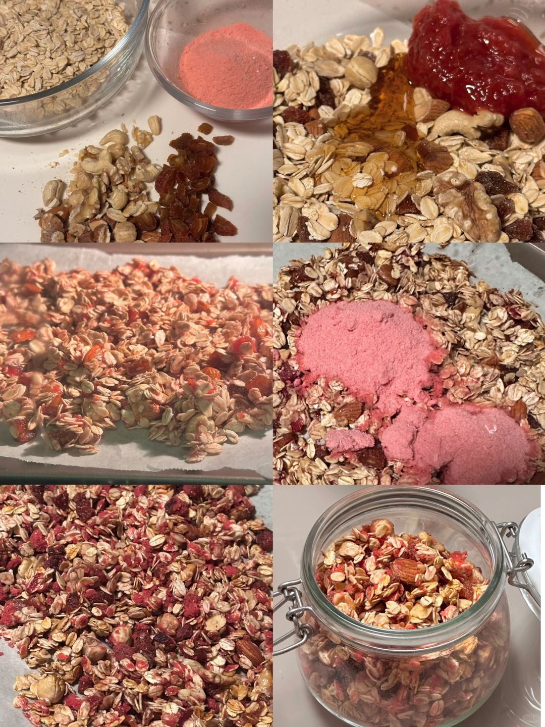 5.草莓冻干打成粉,拌入烤好的麦片中,冷却后装罐保存