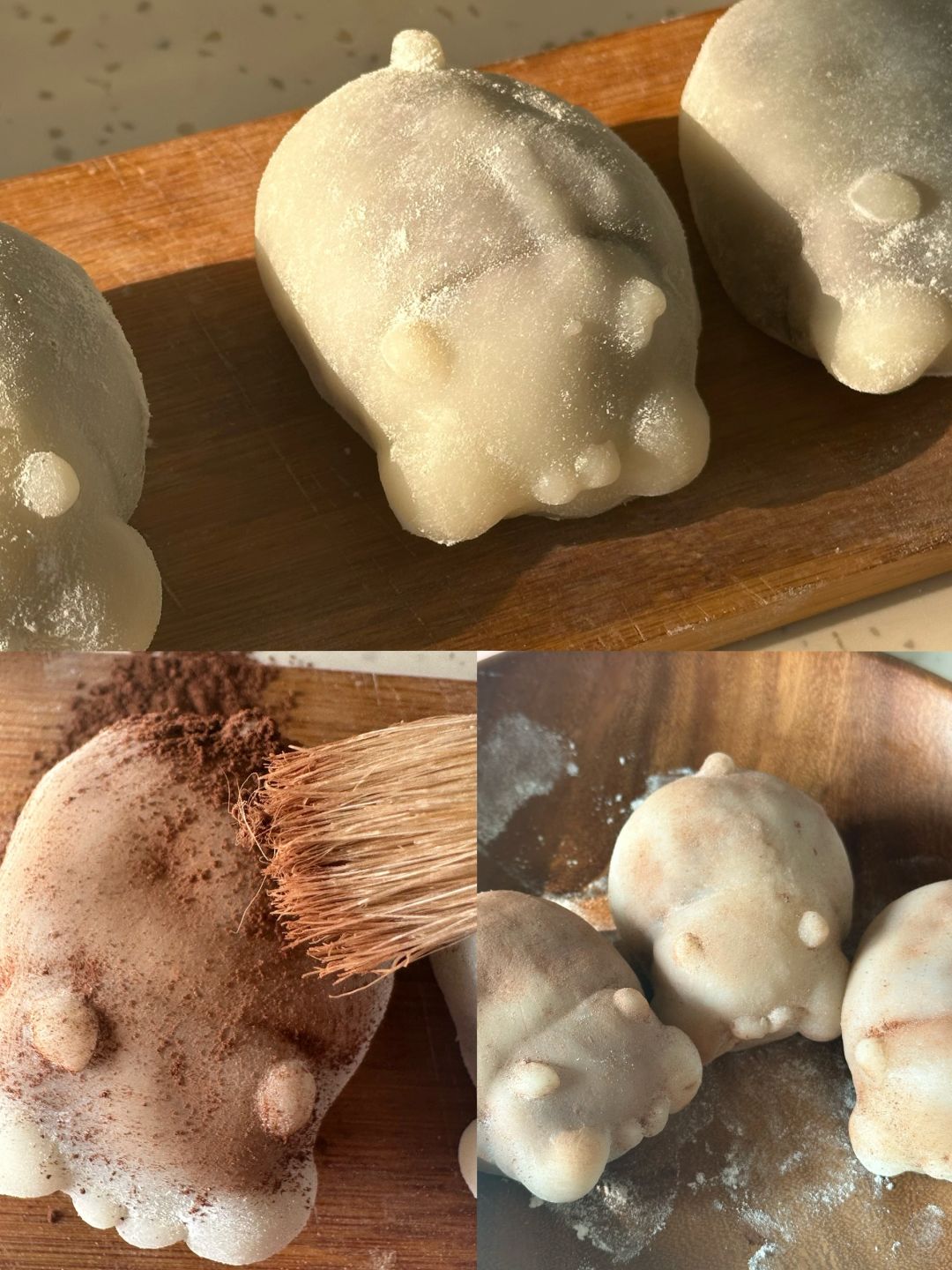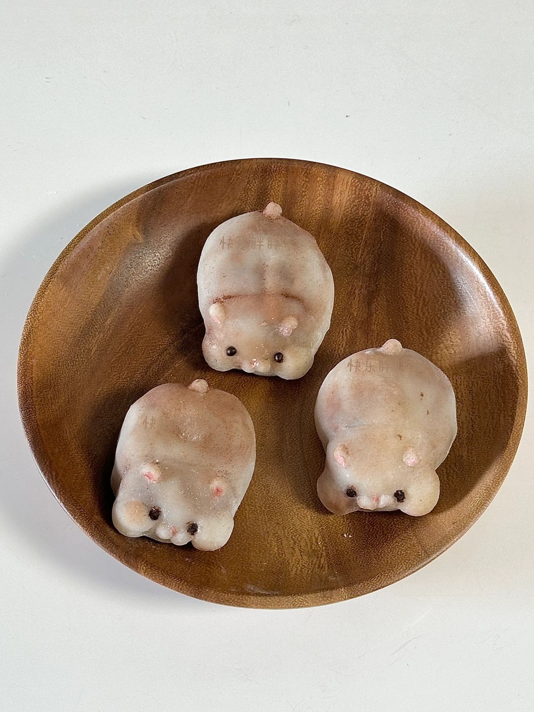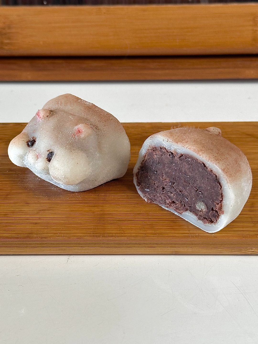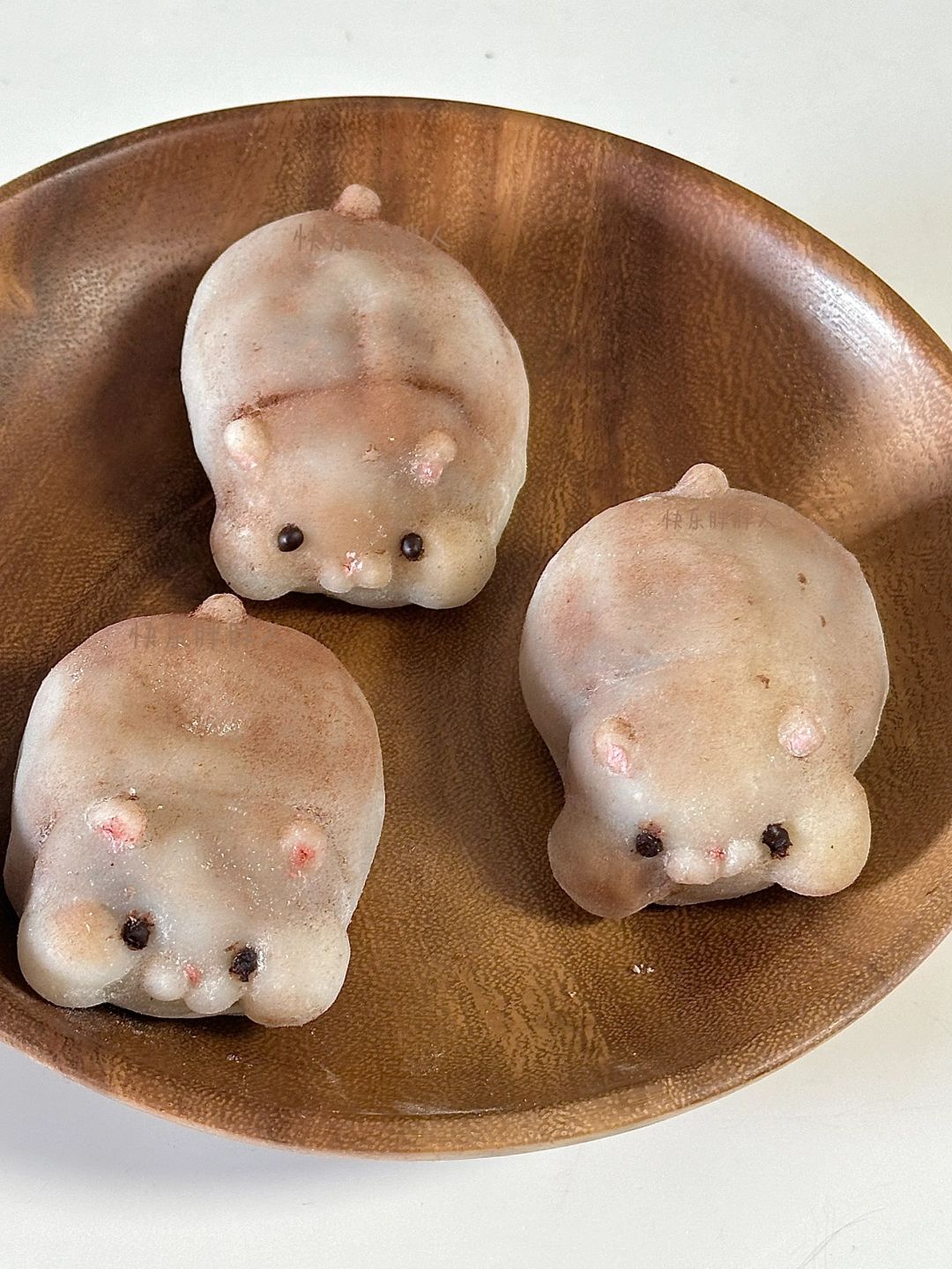 3.红豆泥分成55g一个,皮40g一个,皮包上馅,表面沾上脸部细节和尾巴,给表面沾上熟淀粉,再刷上可可粉,耳朵和鼻子沾上少许粉色,融化巧克力画上眼睛