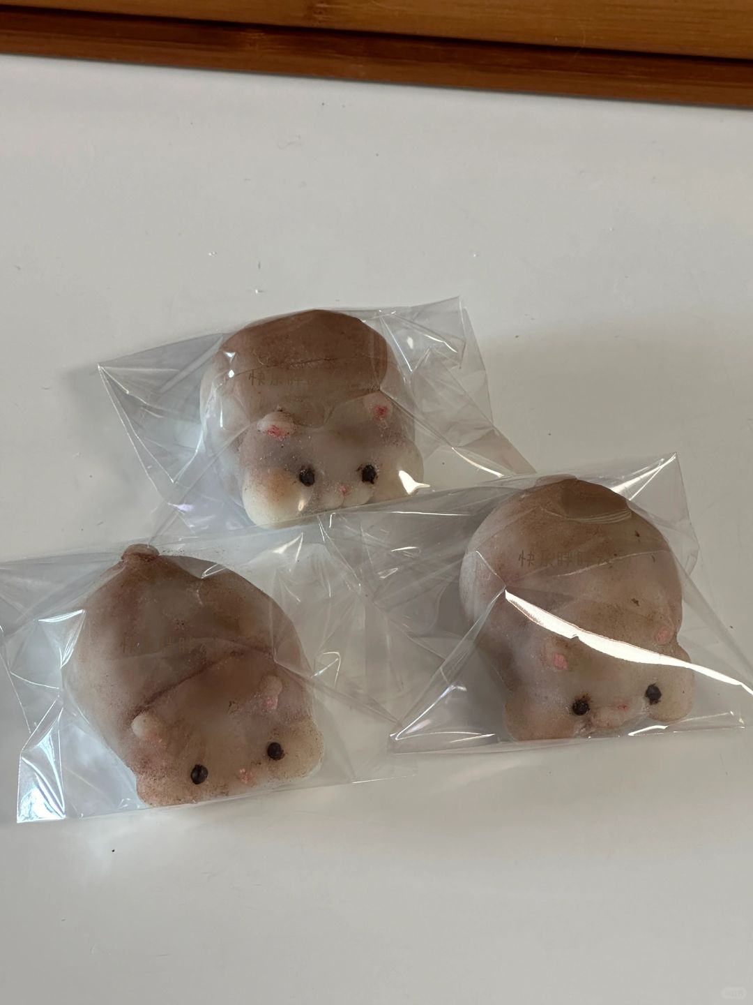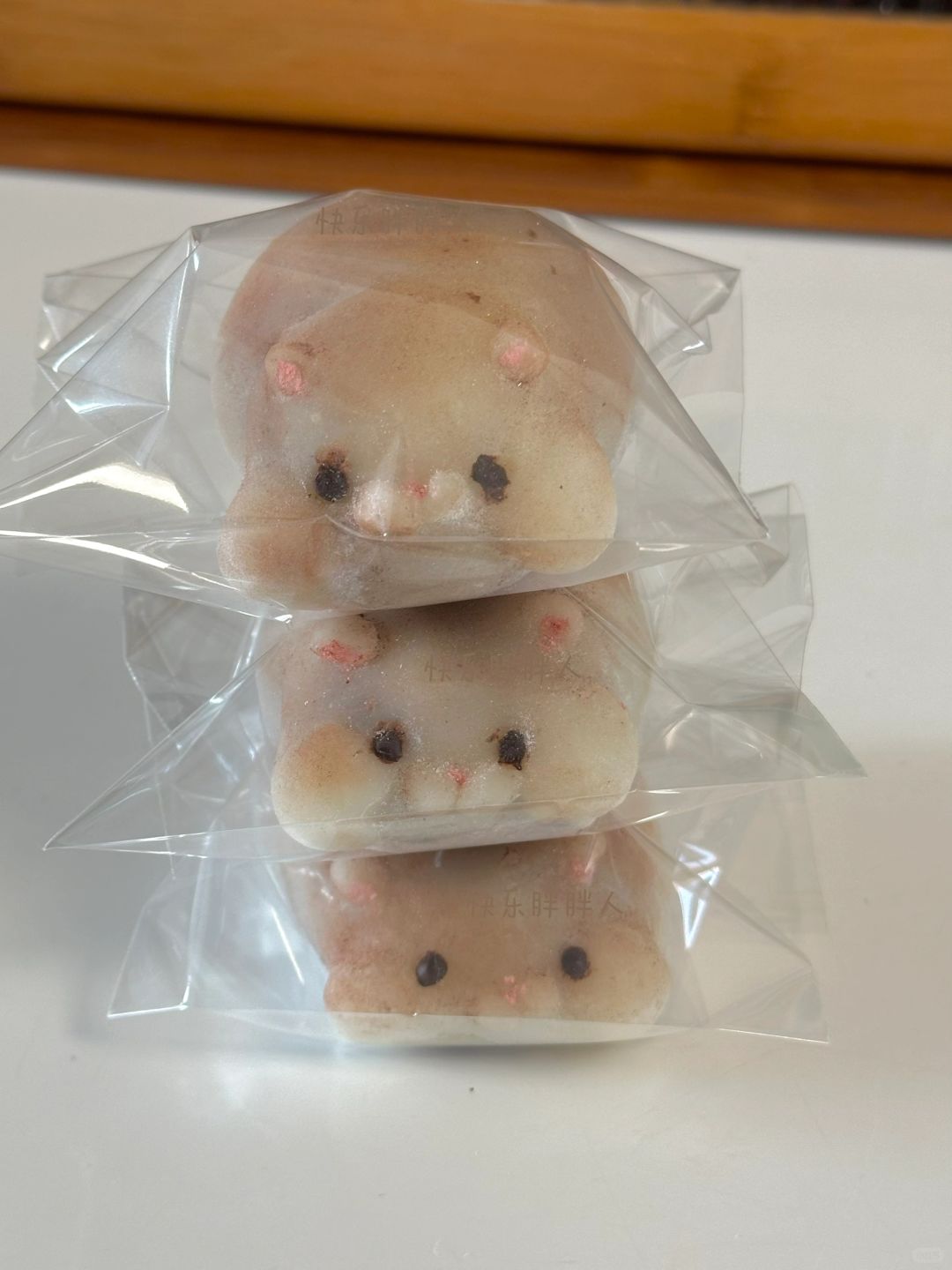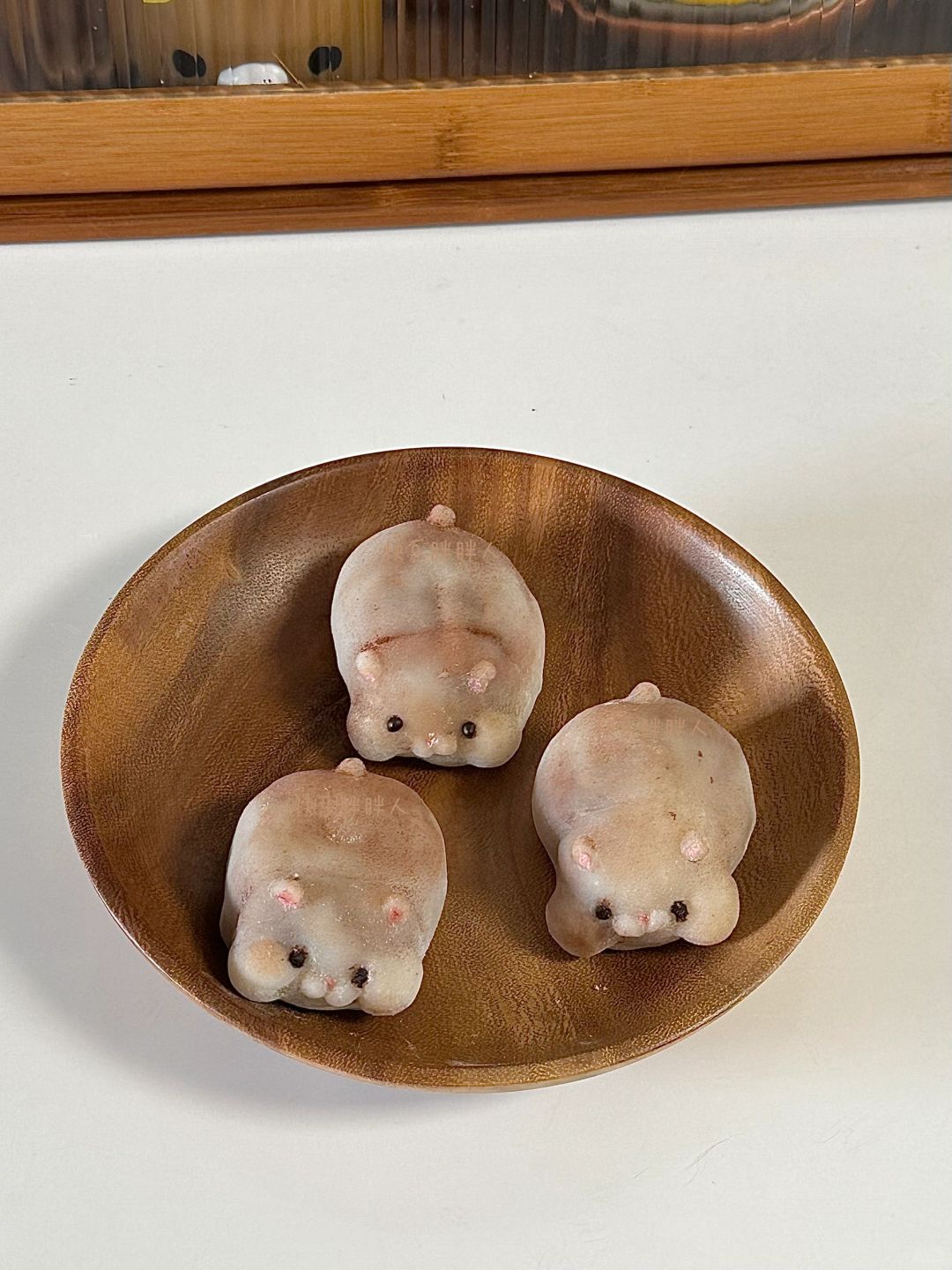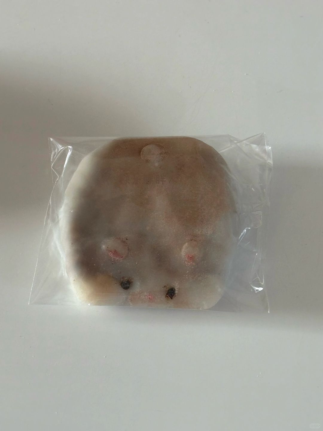 3.红豆泥分成55g一个,皮40g一个,皮包上馅,表面沾上脸部细节和尾巴,给表面沾上熟淀粉,再刷上可可粉,耳朵和鼻子沾上少许粉色,融化巧克力画上眼睛
