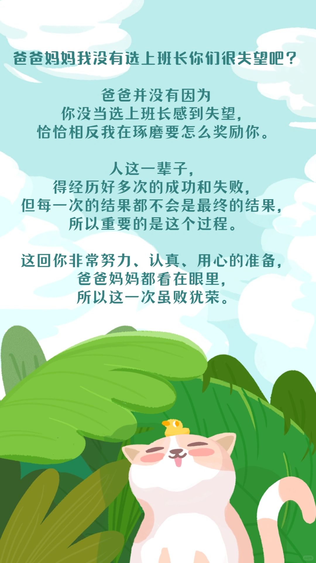 1️⃣如何安慰孩子低落的情绪? 果宁👦🏻:爸爸妈妈我没有选上班长你们很失望吧? 爸爸👨🏻:爸爸绝并没有因为你没当选上班长感到失望,恰恰相反我在琢磨怎么奖励你。 人这一辈子,得经历好多次的成功和失败,但每一次的结果都不会是最终的结果,所以重要的是这个过程。 这一次,你非常努力、认真、用心的准备,爸爸妈妈都看在眼里,所以这一次虽败犹荣。 ⭕核心:父母鼓励的语言,是孩子自信的基石。 · 2️⃣如何开展关键对话:霸凌是什么? 她们虽然会为自己错误承担后果,但以后你也要警惕起来。 有一种欺负叫做变相欺凌,就是有人会利用我们的弱点,变相的要挟你听从他们的使唤,这也是一种霸凌。 这些人呢,表面上看起来很善良,实际上是在践踏别人的尊严。 你遇到这种事情要大胆的跟老师说,跟家长说! 真正的朋友应该是相互帮助,而不是一味的索取。 ⭕核心:正面准确的解释含义,睿智引导。 · 3️⃣如何解答问题? 果宁👦🏻:我们为什么要学习? 爸爸👨🏻:丰富的知识可以加深你的底蕴,让你拓展视野,打开格局。 学到的知识就像输入的功法一样,留在你体内,随时可以弥补你的不足。 ⭕核心:分享观点,减少爹味说教。 · 4️⃣小孩国相处的真相: 🍬 一旦你触发了那个叛逆的小宇宙, 你越拦着他,他就越跟你对着干。 🍬 大人的世界实在太过世故, 什么都想按照自己设置的规矩来, 但其实你除了自己,谁也左右不了。 · 5️⃣小小随感: 🍓好的父母语言不仅能鼓励孩子,给予ta们安全感,增加自信心; 🍓更能引导孩子进行独立思考,培养ta们解决问题的能力,逐渐成长为有勇气面对困境的人。 🌿而倾听则是良性沟通的重要前提! 🌿卡尔·罗杰斯曾说:「如果有人倾听你,不对你评头论足,不替你担惊受怕,也不想改变你,这多美好啊; 🌿每当我得到人们的倾听和理解,我就可以用新的眼光看世界,并继续前进,这真神奇! 🌿一旦有人倾听,看起来无法解决的问题就有了解决办法,千头万绪的思路也会变得清晰起来。」 🍊众所周知,孩子是通过思考和提问来认知这个世界的。 🍊而有时候,孩子也是通过父母的语言来确定父母的爱意的! 🍊别让你的真心被误解,高质量的亲子关系就从沟通开始吧。