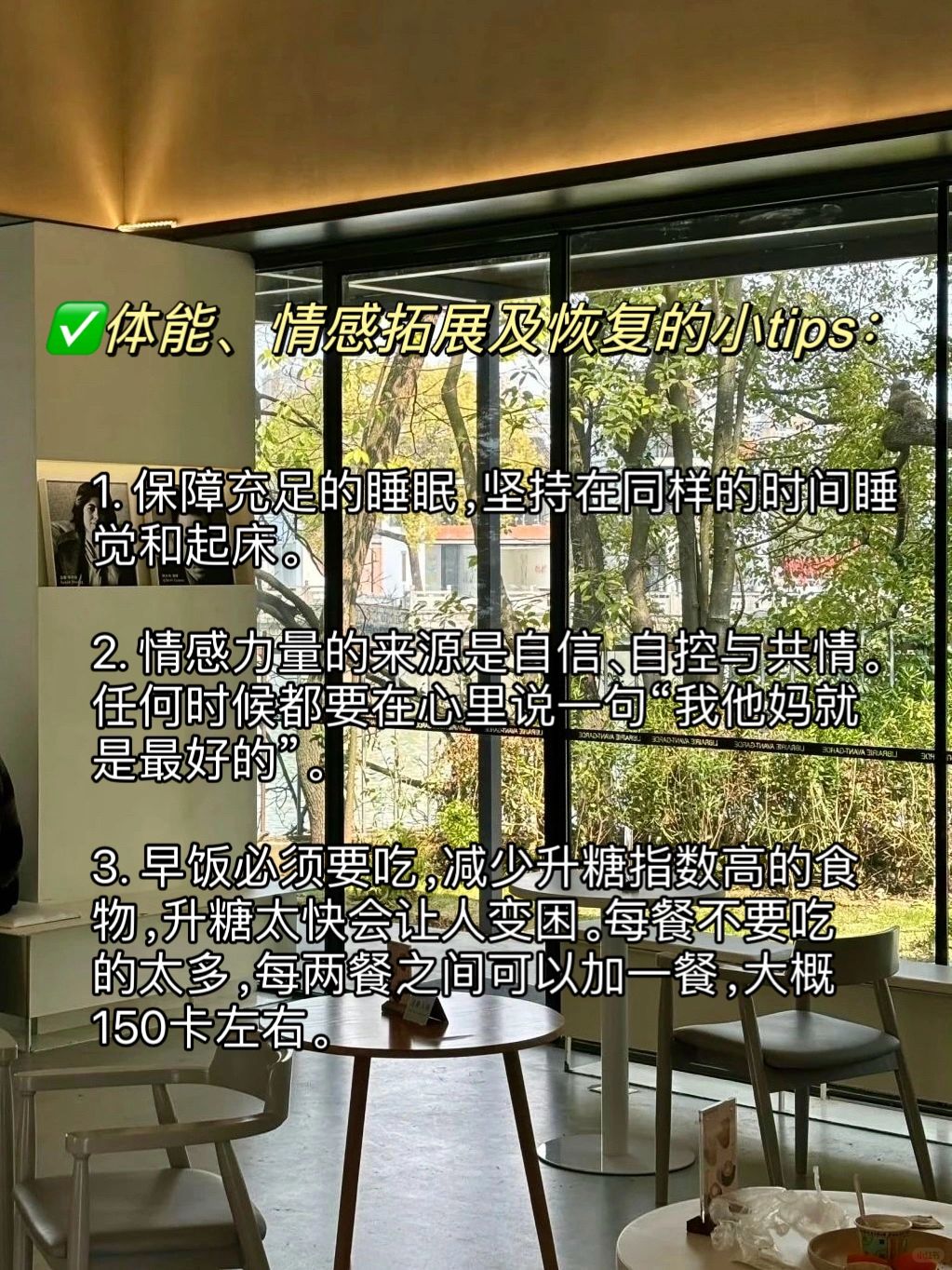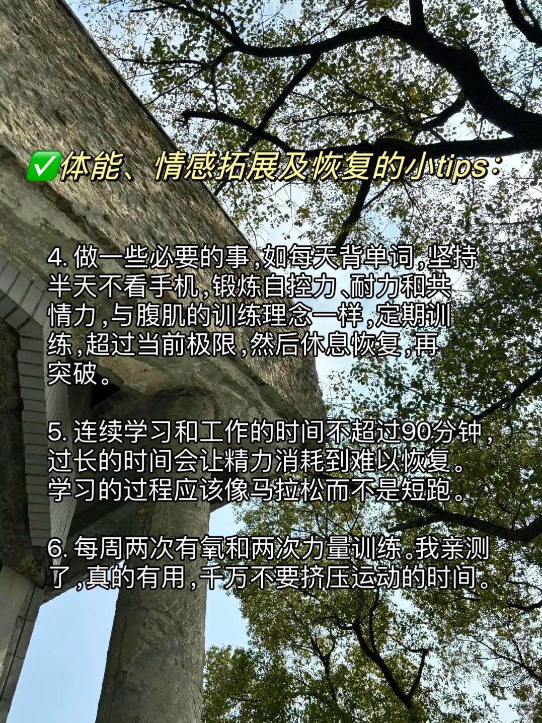 4. 做一些必要的事,如每天背单词,坚持半天不看手机,锻炼自控力、耐力和共情力,与腹肌的训练理念一样,定期训练,超过当前极限,然后休息恢复,再突破。