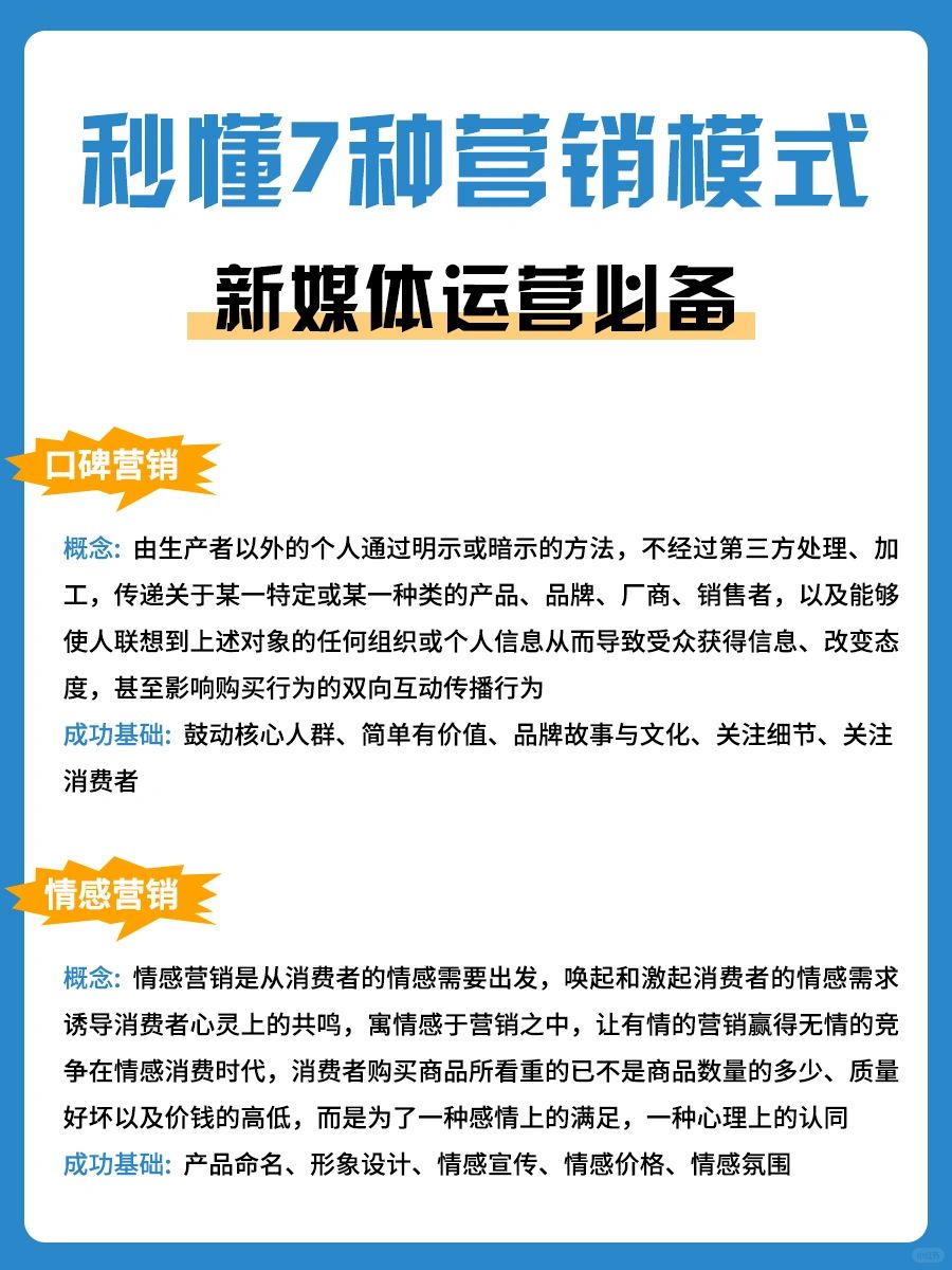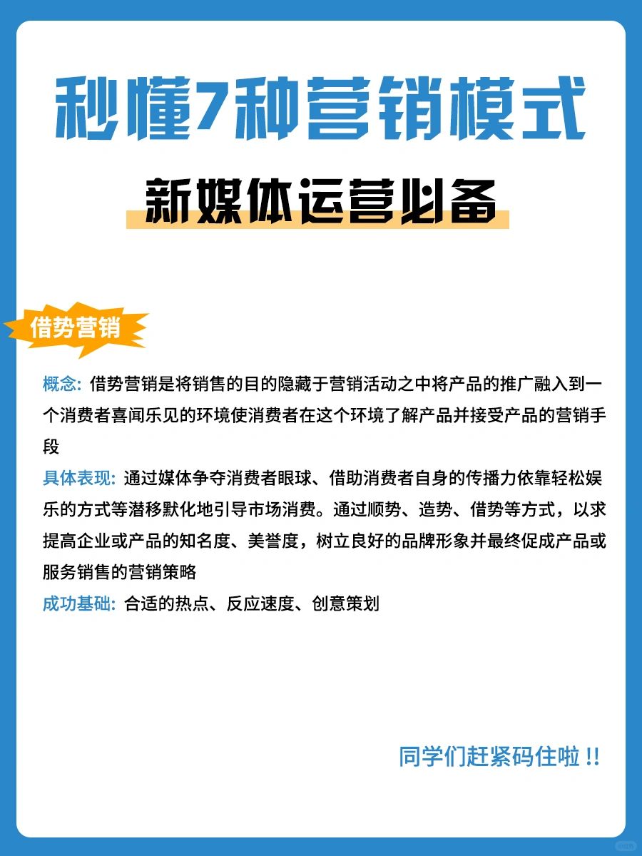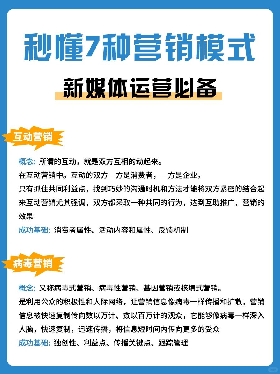 ‼新媒体运营必备 1️⃣饥饿营销 2️⃣事件营销 3️⃣口碑营销 4️⃣情感营销 5️⃣互动营销 6️⃣病毒营销 7️⃣借势营销 🏆同学们赶紧码住吧✅