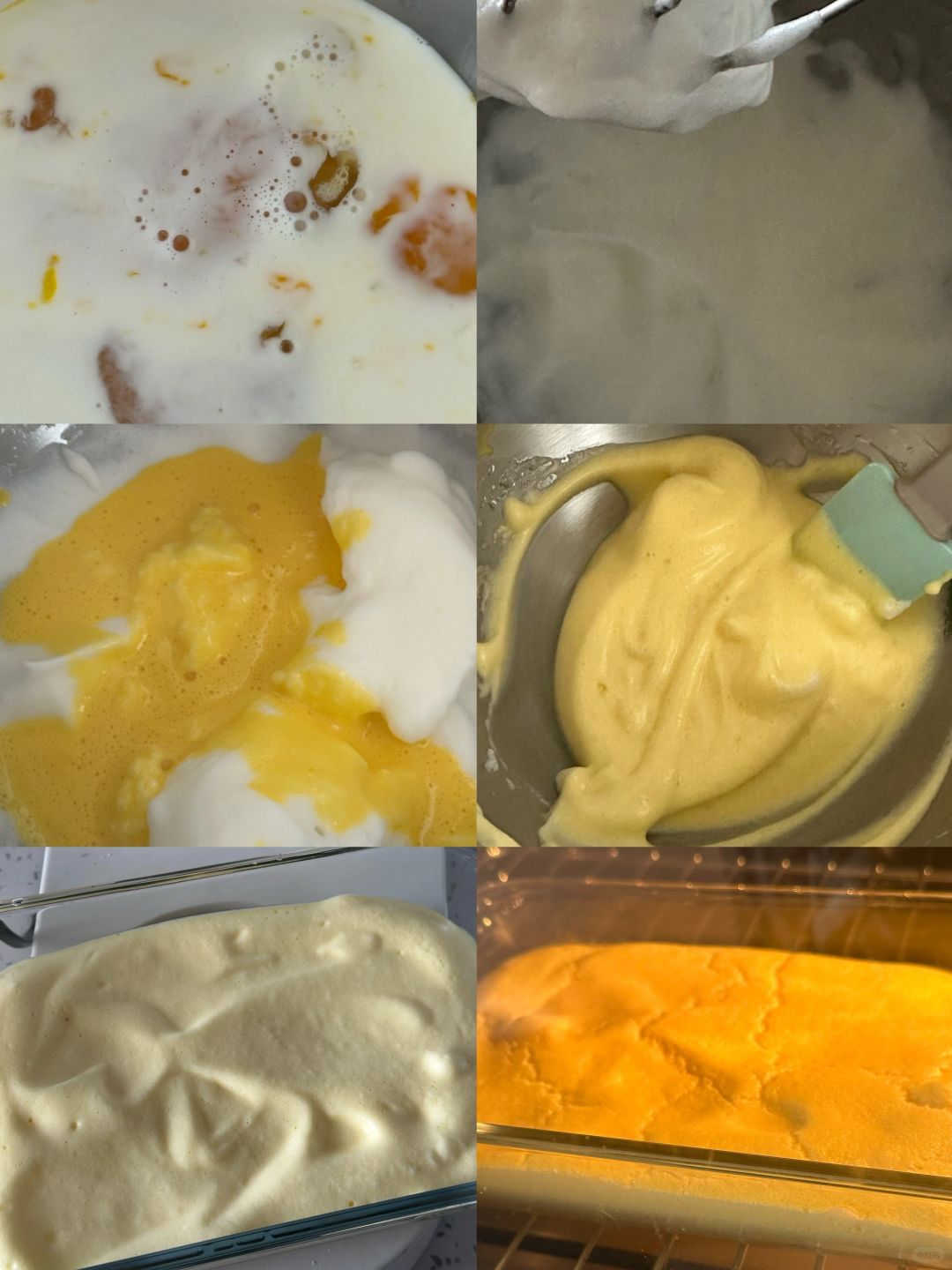 1.烤箱提前预热150度,蛋黄加入牛奶和淀粉泡打粉拌匀,加入打发好的蛋白均匀,加入烤盘中(如果要换容器装记得垫上烘焙纸防粘)大致铺匀,150度烤30分钟