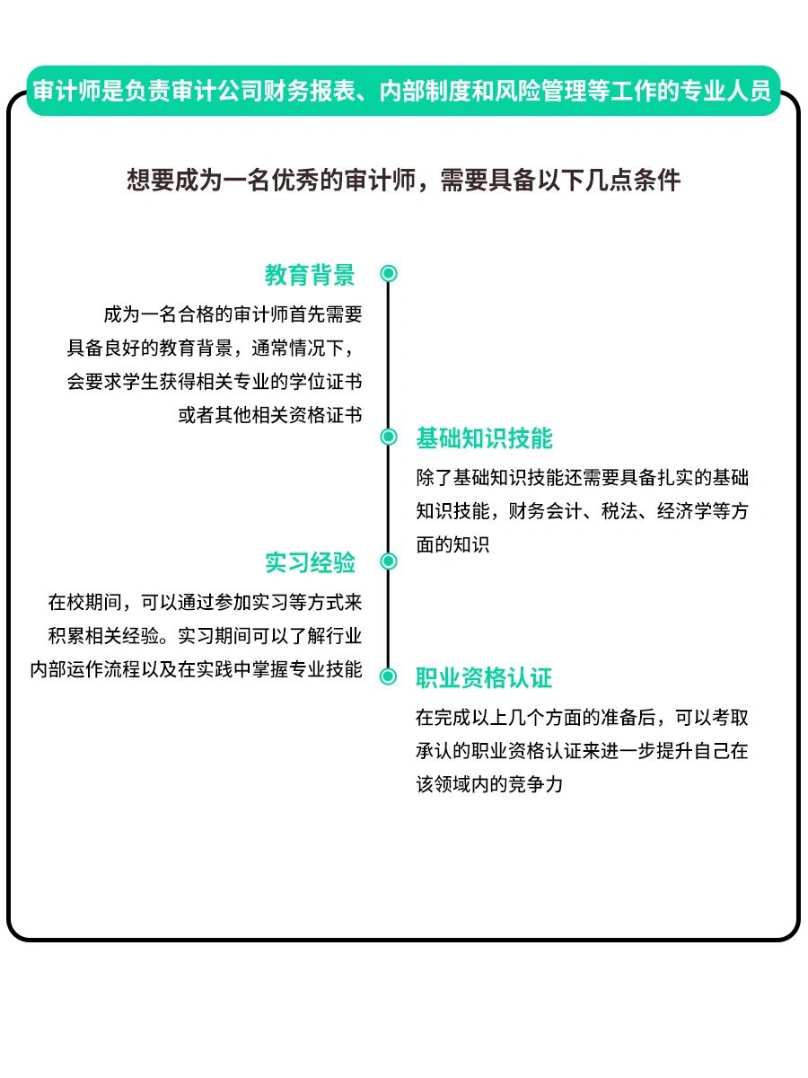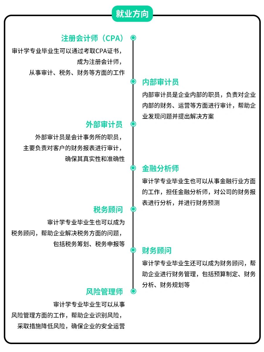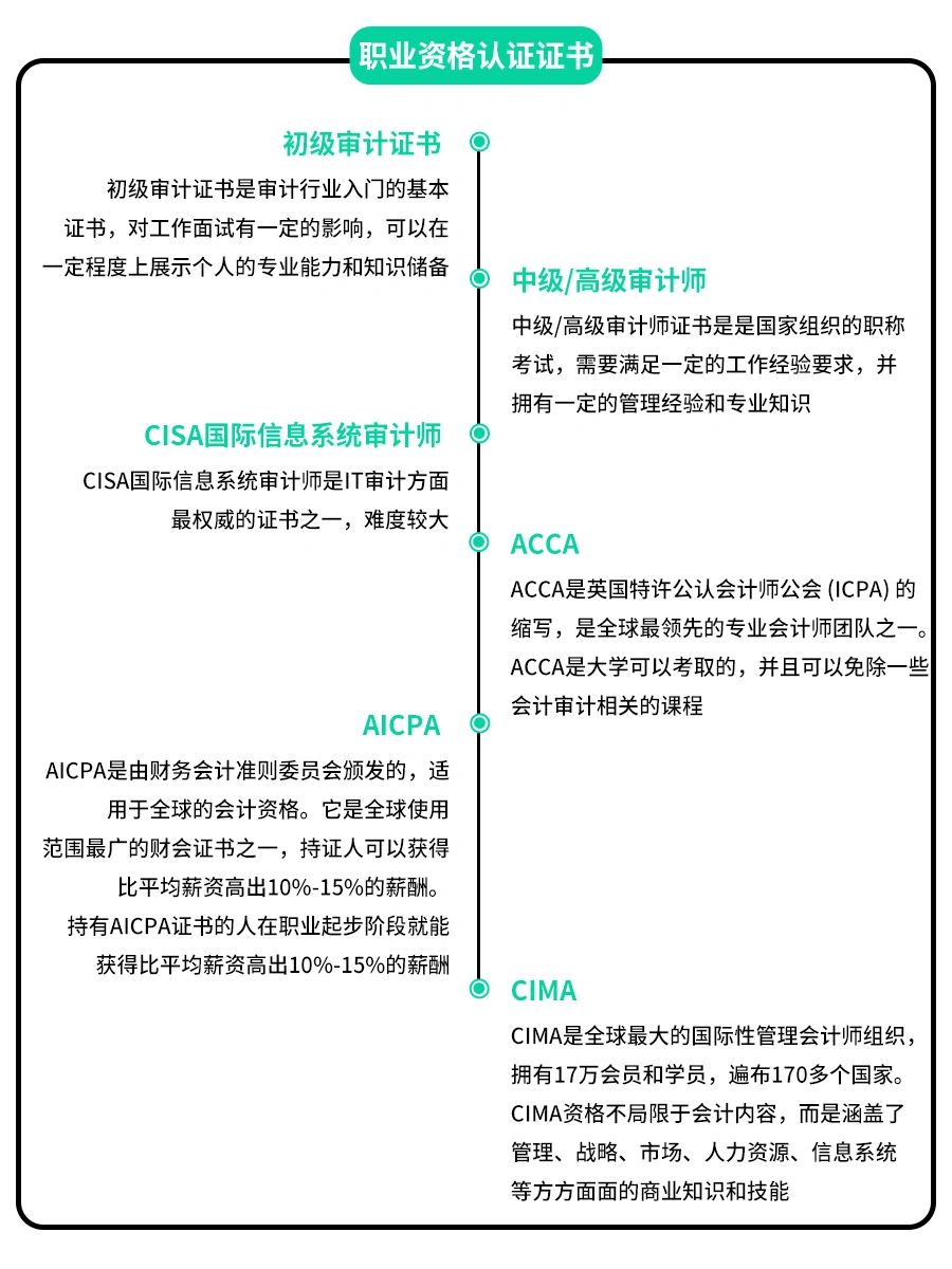 👉审计学专业是一个非常重要的职业方向,随着经济的发展和治理体系的完善,审计学专业的需求在不断增加。 ‼当前,我国对于企事业单位的监管力度越来越严格,对于财务数据的真实性和合规性要求也越来越高,这为审计人员提供了广阔的就业机会。 🔔同时,在全球化进程中,跨国企业也需要通过审计来保证其财务数据的真实性和合规性。 📍就业方向 ⭕需要考取的证书 🎓需要的同学们赶紧码住吧‼