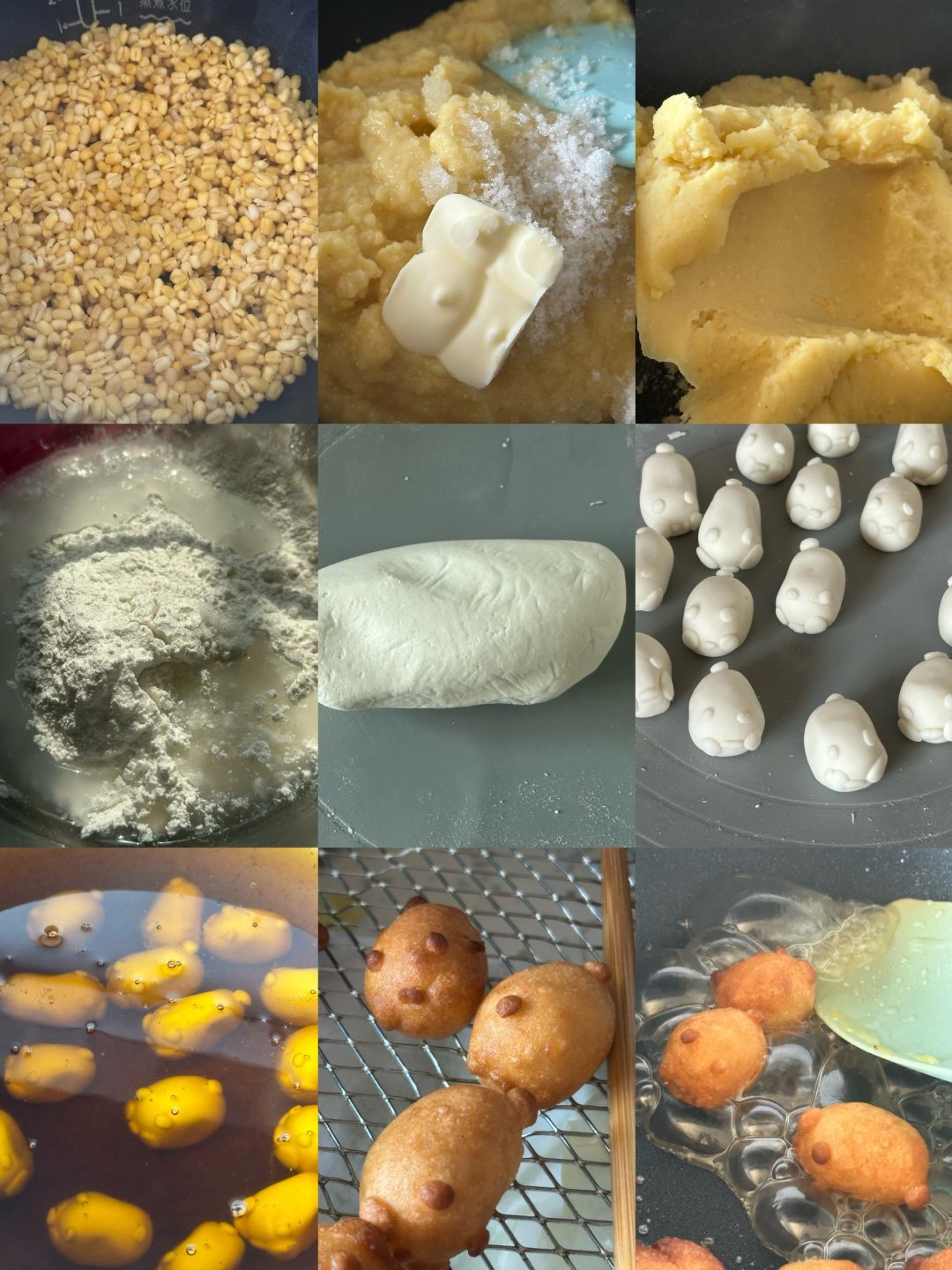 1.脱皮绿豆蒸熟,加入牛奶打烂,倒入锅中加入黄油和糖炒,冷却后造型
