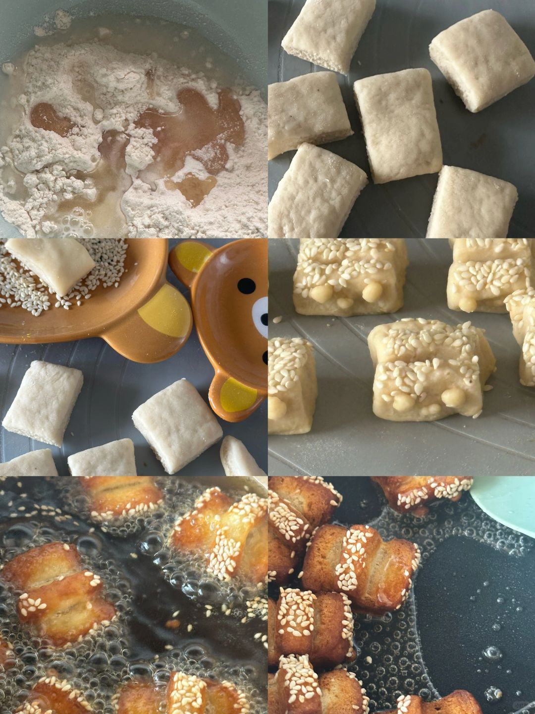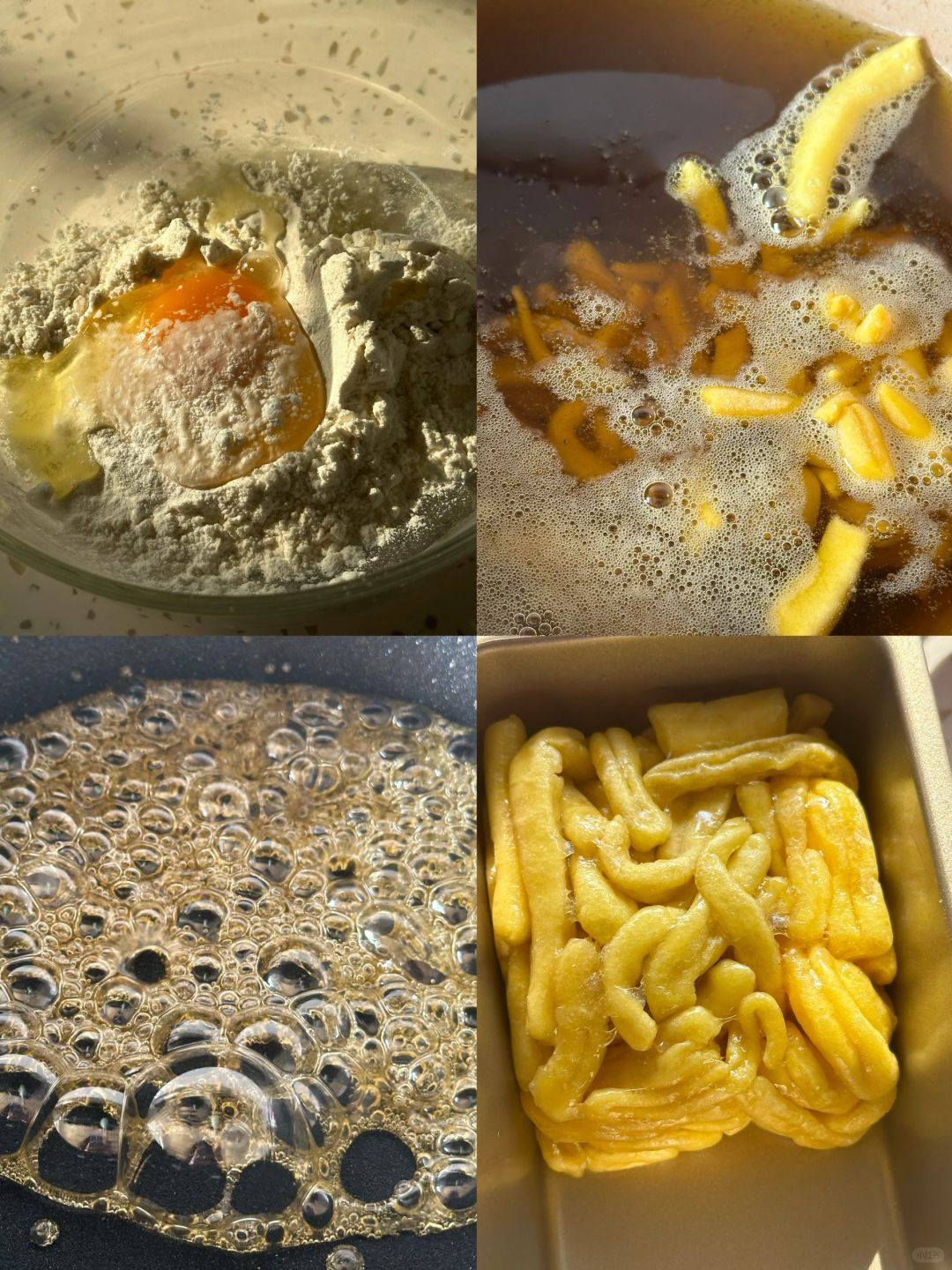 面团配料混合均匀,造型后冷油下锅炸至表面金黄(一定要冷油,漂浮后边搅边炸让受热均匀,小心油溅出来)捞出控油,糖浆炒浓后关火加入炸好后到江米条翻滚至裹上糖霜