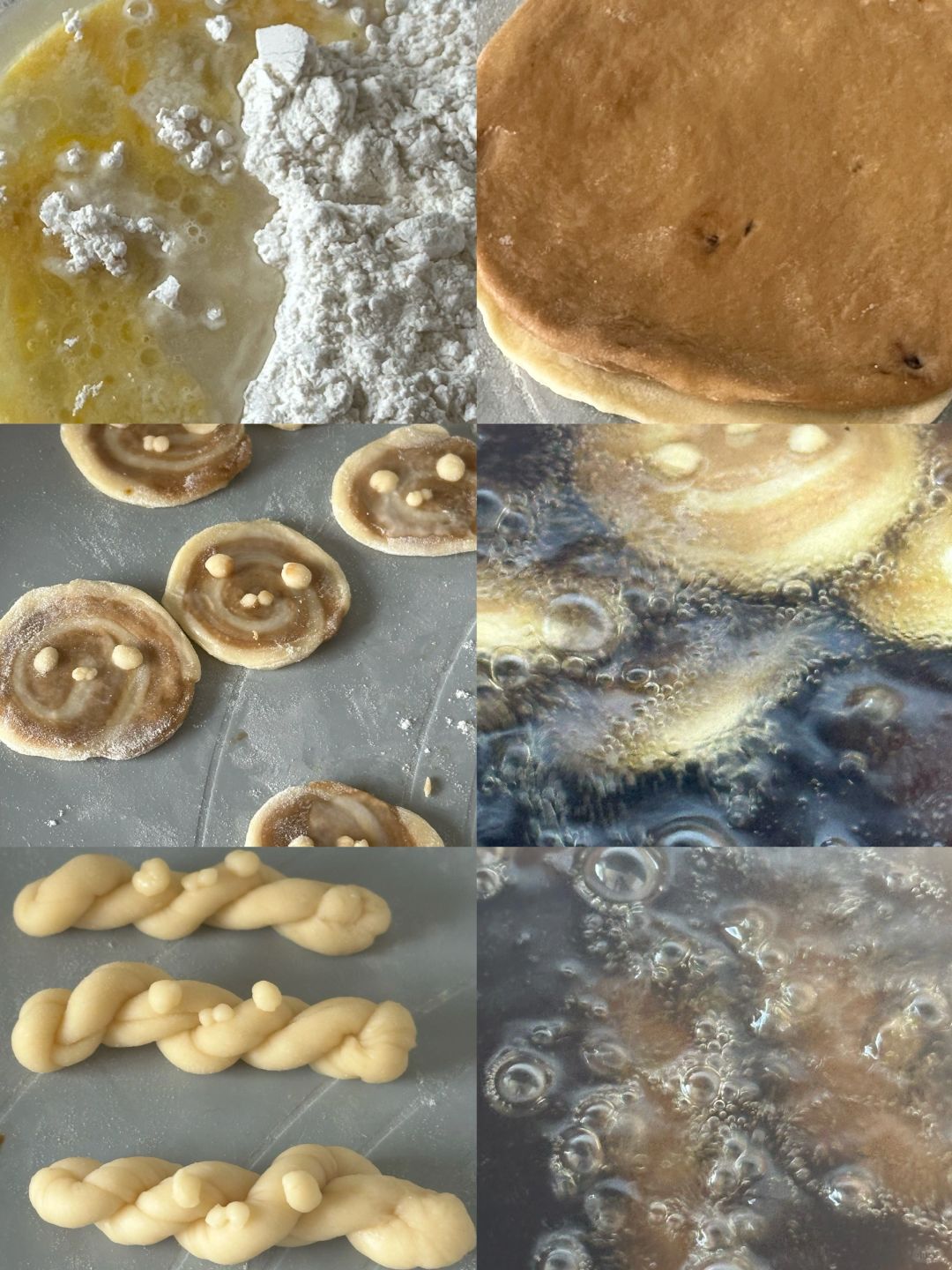 配料混合均匀包上保鲜膜松弛1小时,分份搓成条,手拿两头,一边向前搓一边向后搓,再把两头连起,让它自由卷起来成麻花状,捏紧两头,油热下锅炸至金黄捞出