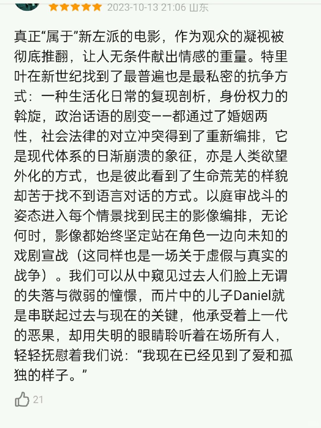 👉🏻特里叶在新世纪找到了最普遍也是最私密的抗争方式:一种生活化日常的复现剖析,身份权力的斡旋,它是现代体系的日渐崩溃的象征,亦是人类欲望外化的方式,也是彼此看到了生命荒芜的样貌却苦于找不到语言对话的方式。
