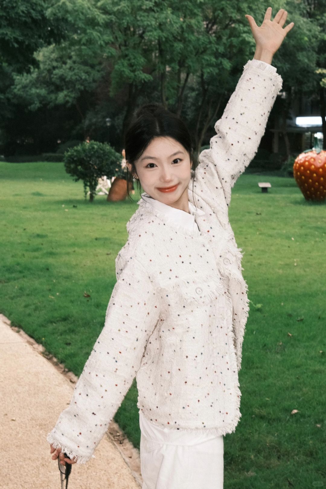 粉衫映夏草木香粉色T恤如撷取的夏花般明媚,白裤衬着茵茵草坪,静坐于绿意间的