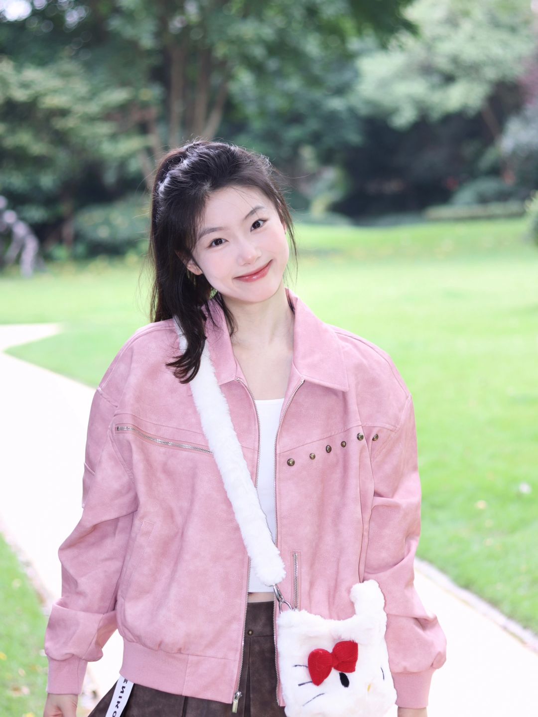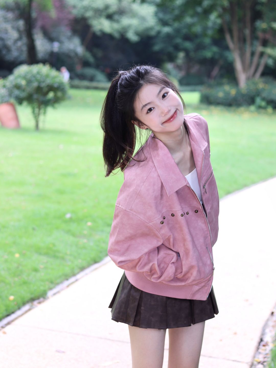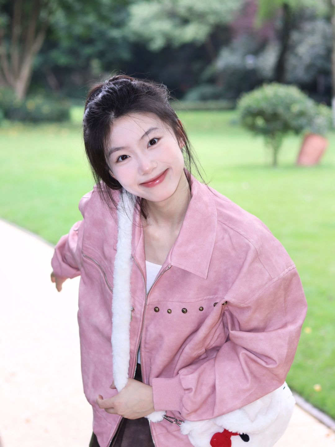 粉衫映夏草木香粉色T恤如撷取的夏花般明媚,白裤衬着茵茵草坪,静坐于绿意间的