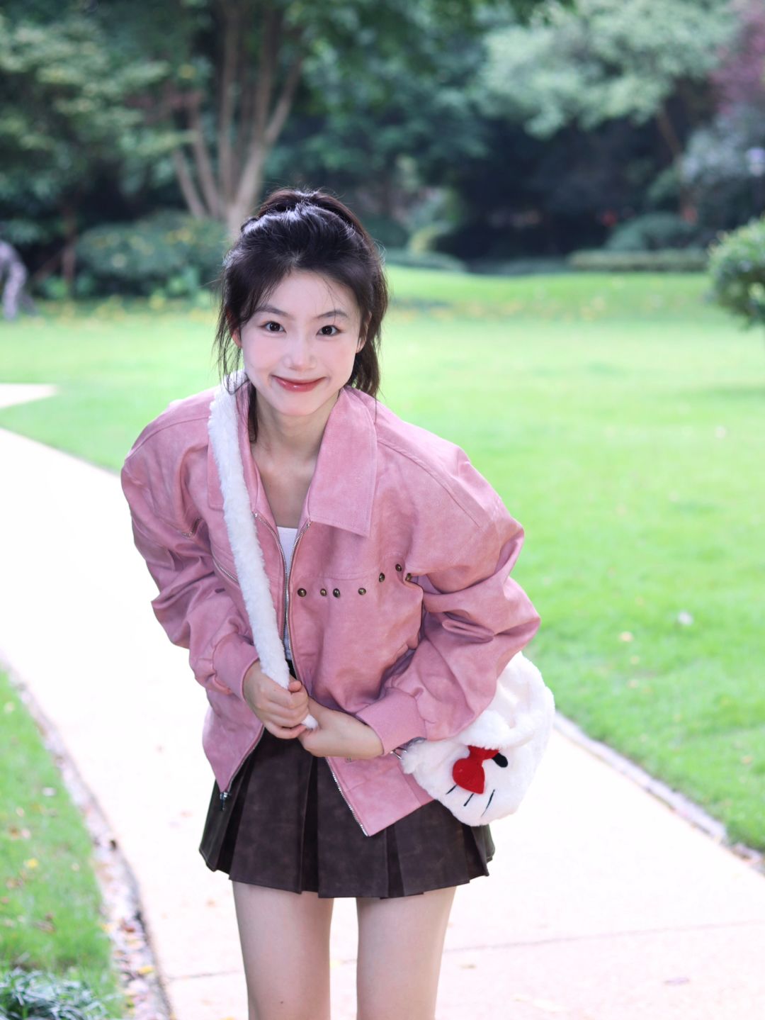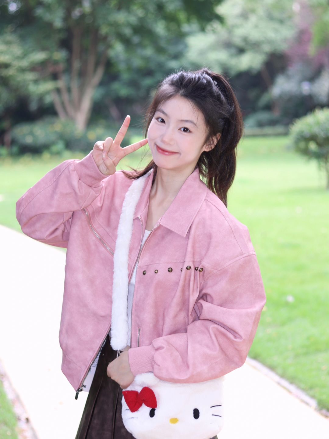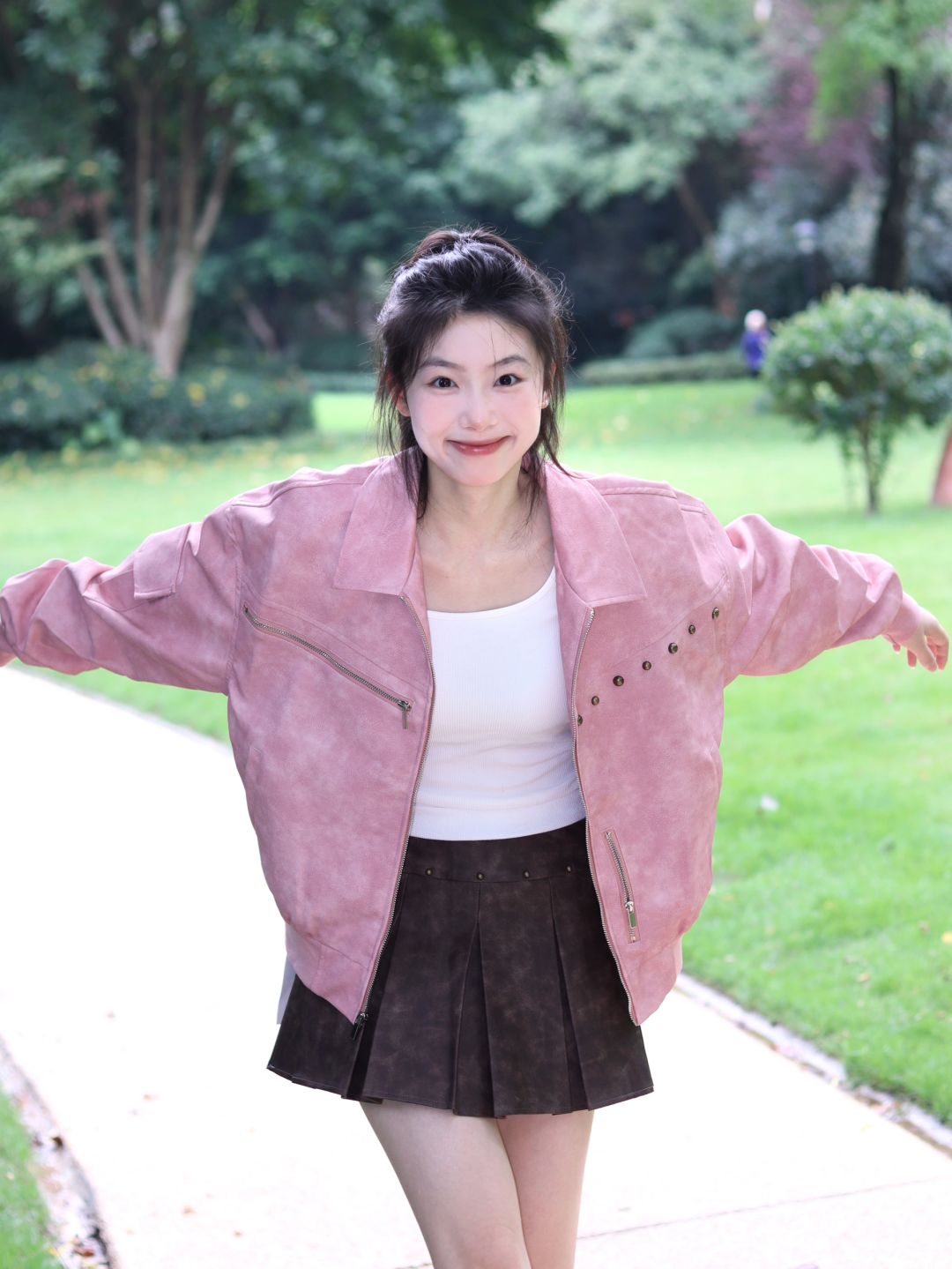 粉衫映夏草木香粉色T恤如撷取的夏花般明媚,白裤衬着茵茵草坪,静坐于绿意间的