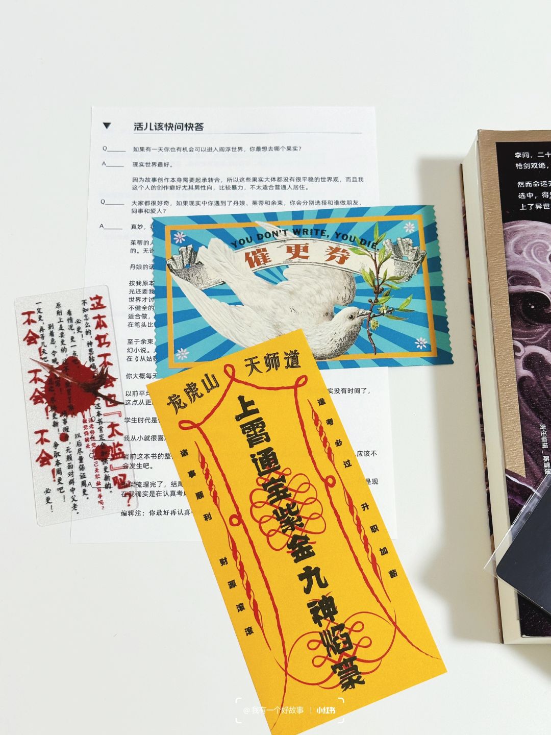 小说的整体框架有点类似单元剧的形式,整本书分4卷,看似独立,可相互之间有着密不可分的联系,随书附赠的东西也特别多,奇奇怪怪很有意思,虽然是个男频爽文吧,可我一个女孩子也看的不亦乐乎!