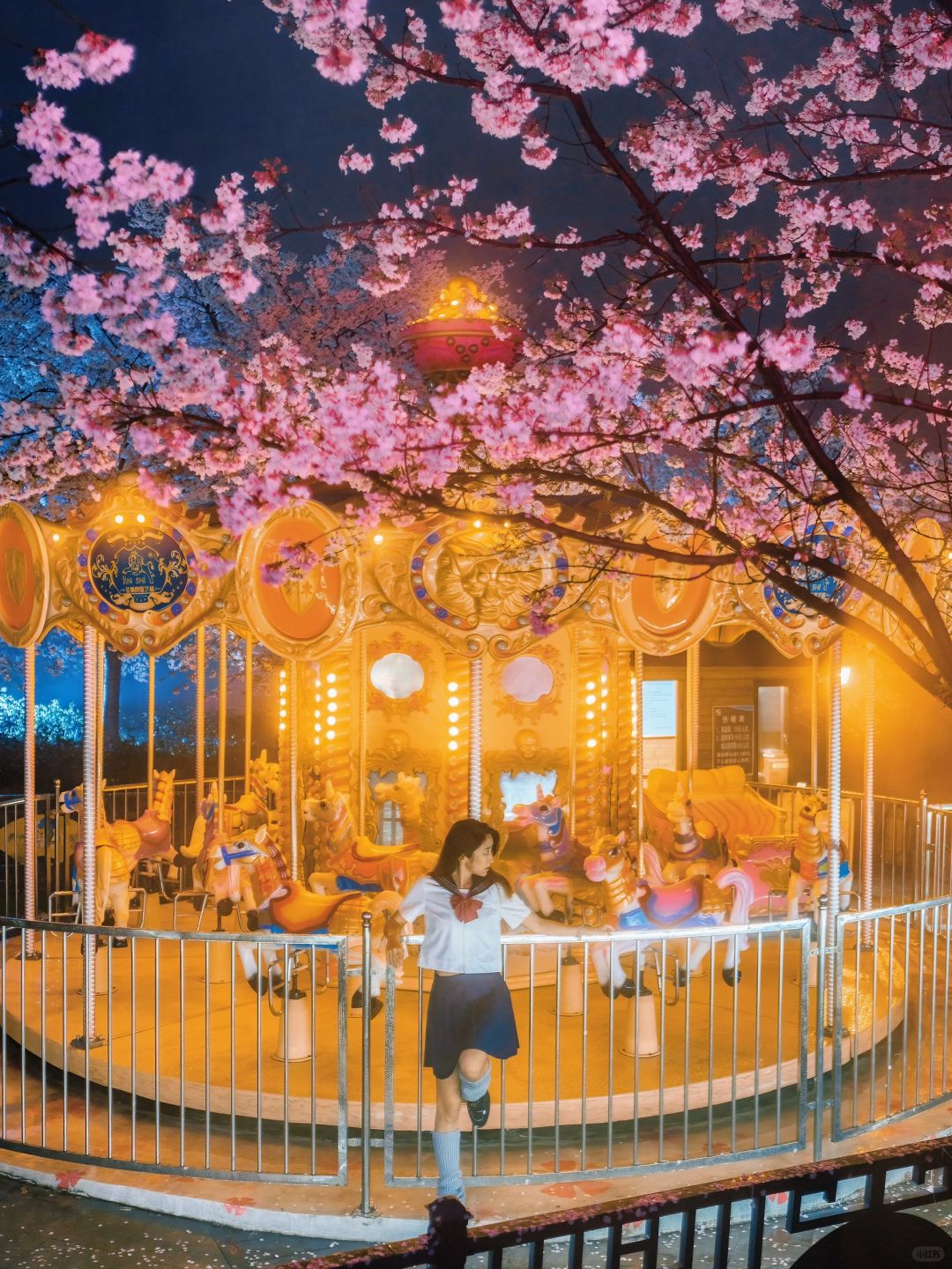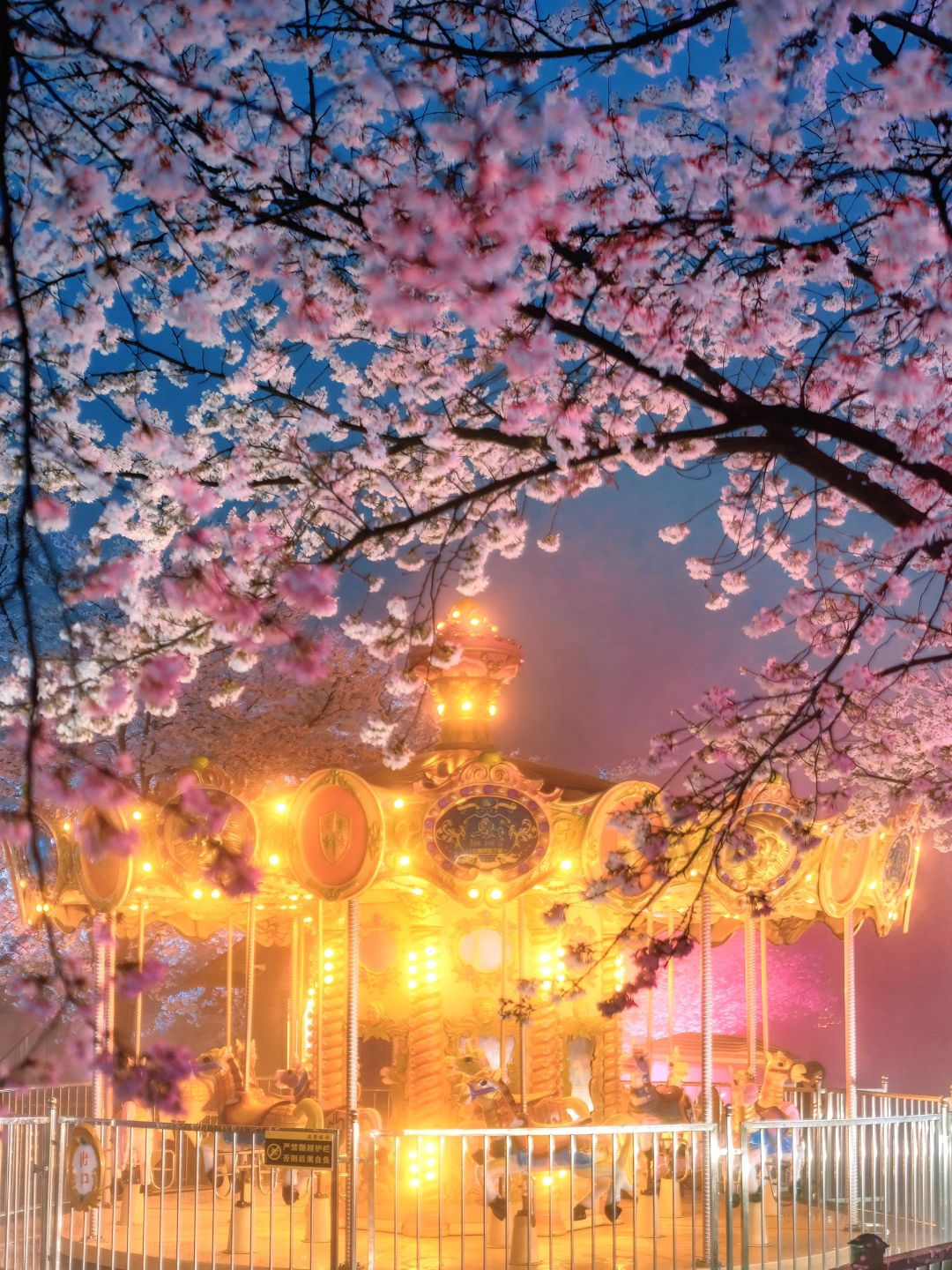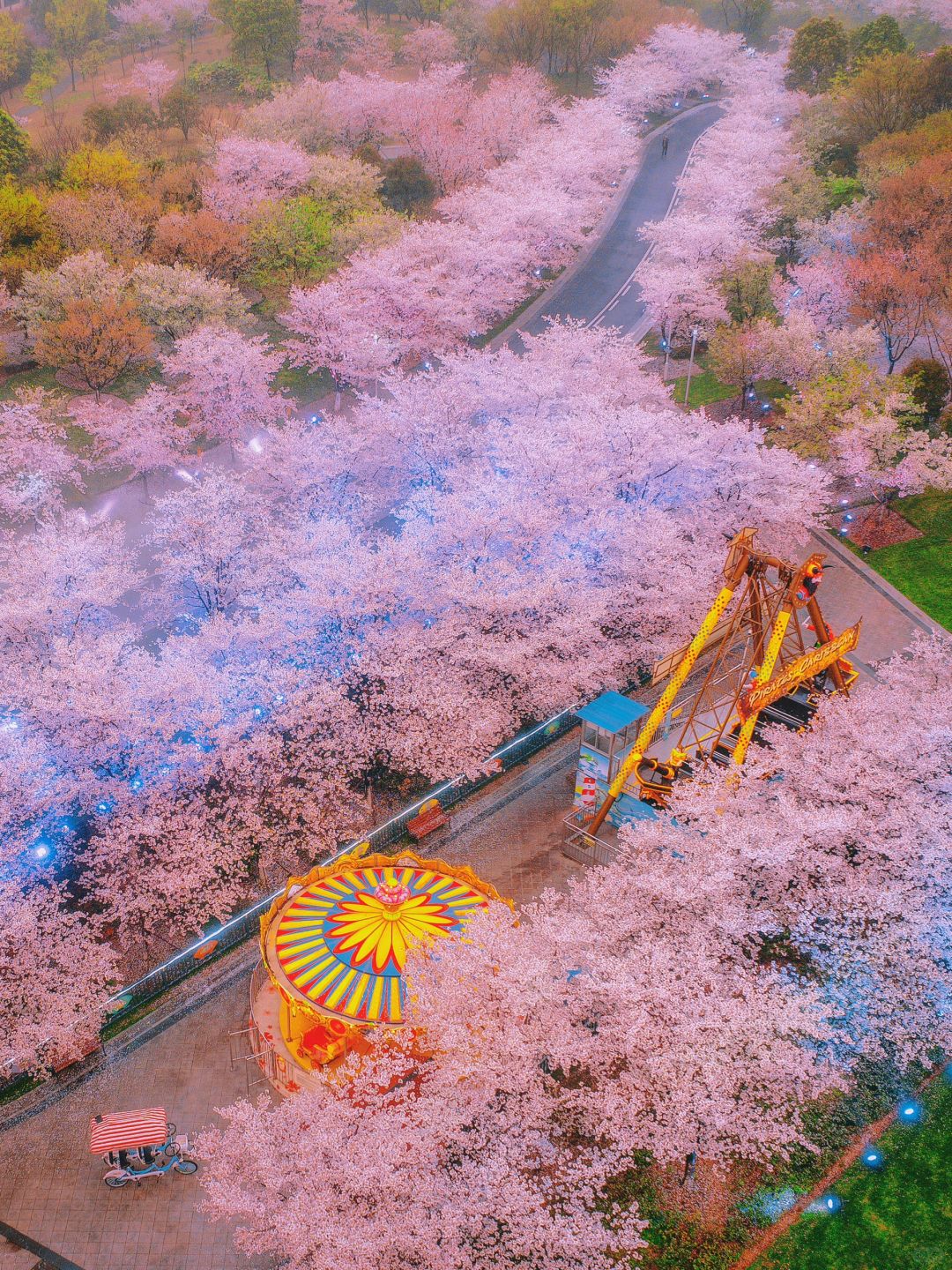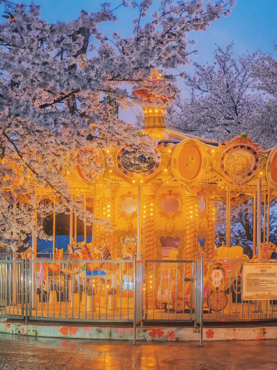 继续沿着灯走 到达樱花海棠园,旋转木马和海盗船也在这边