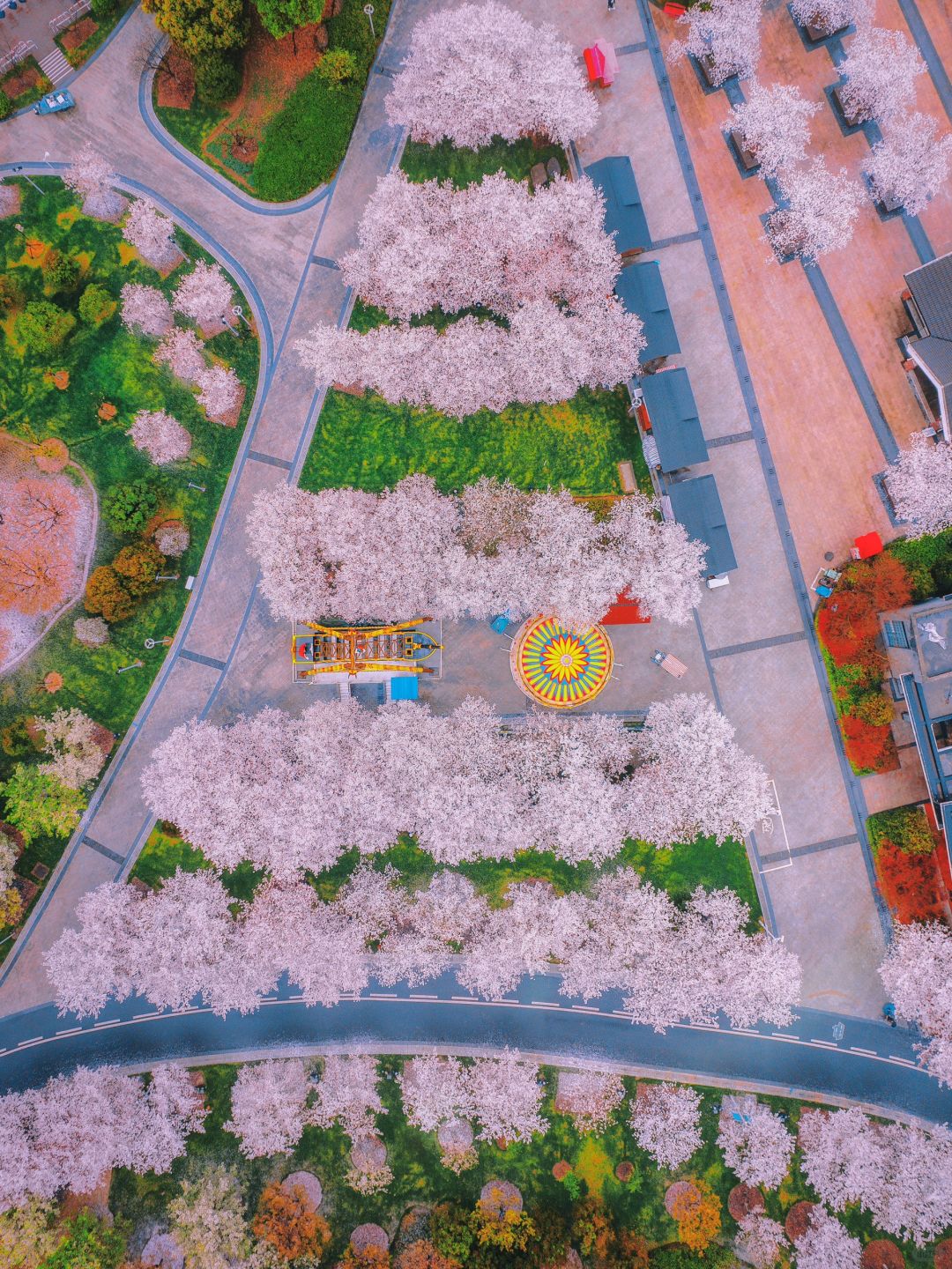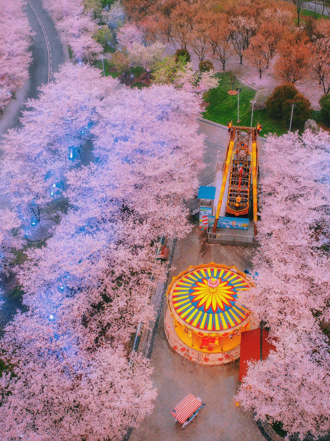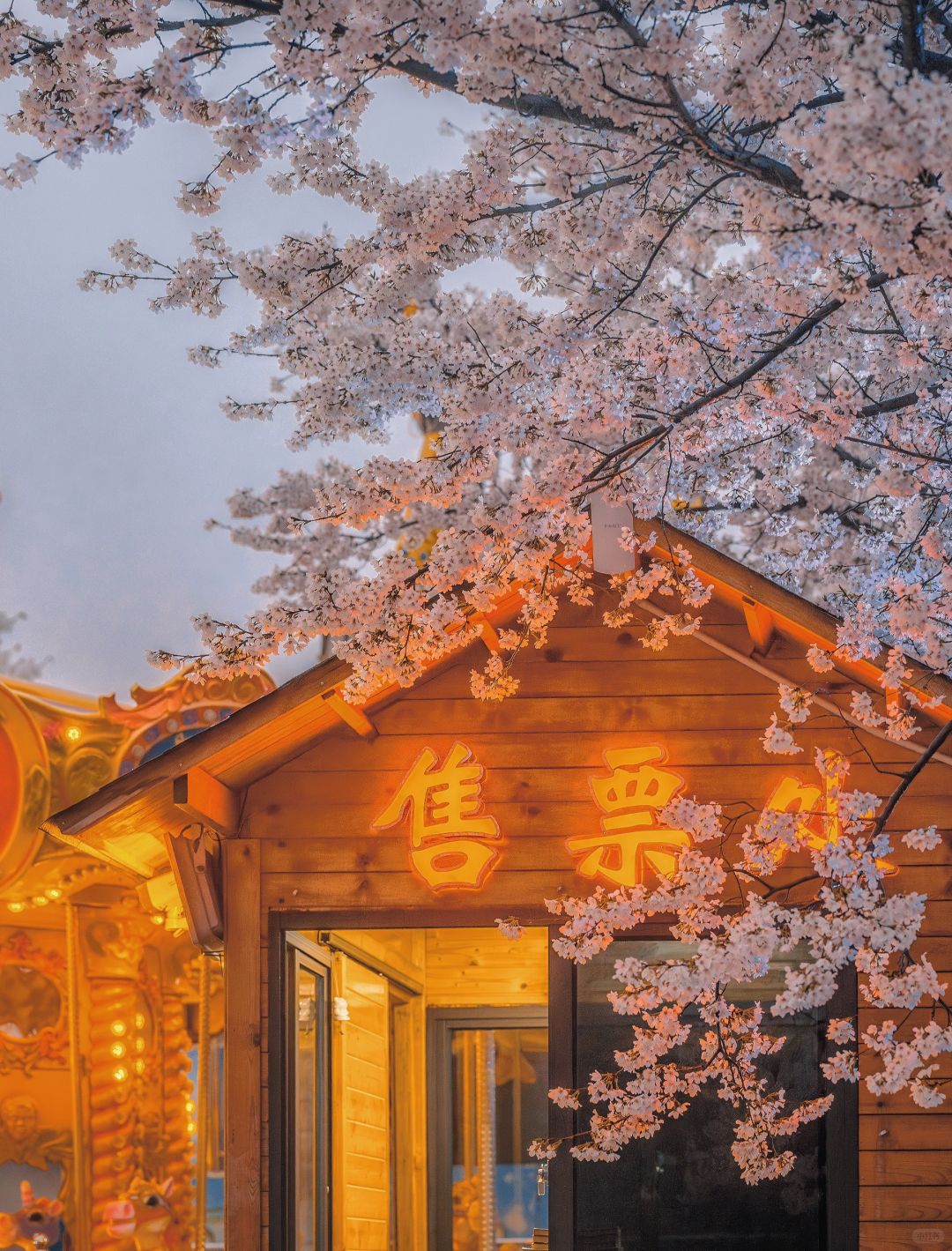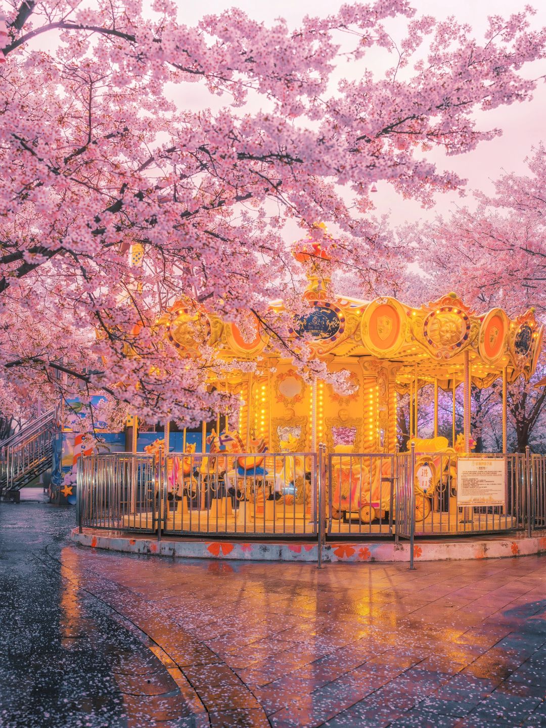 继续沿着灯走 到达樱花海棠园,旋转木马和海盗船也在这边