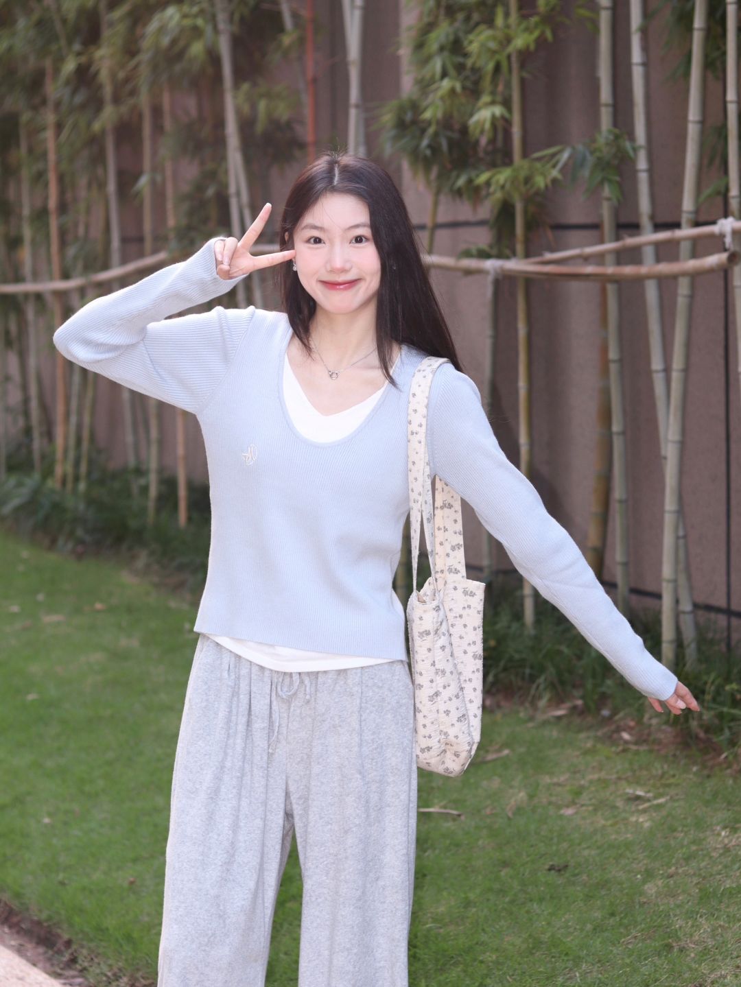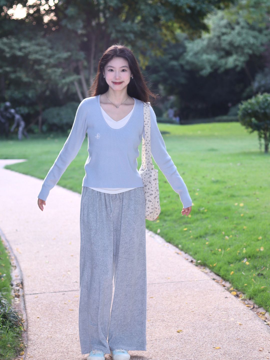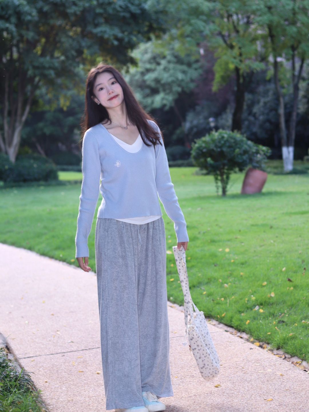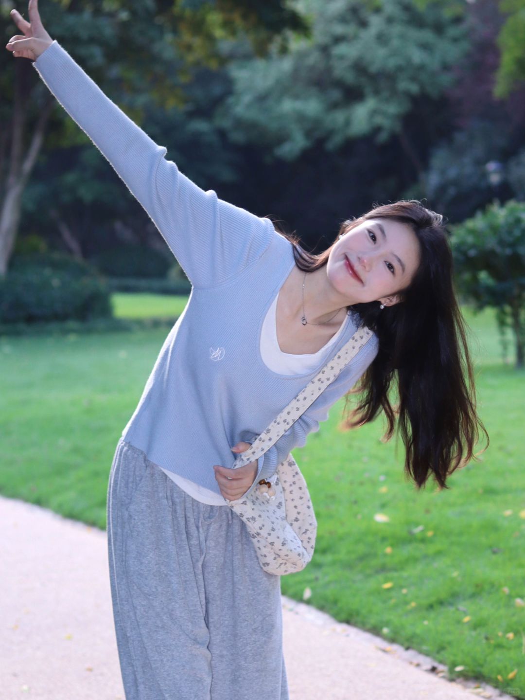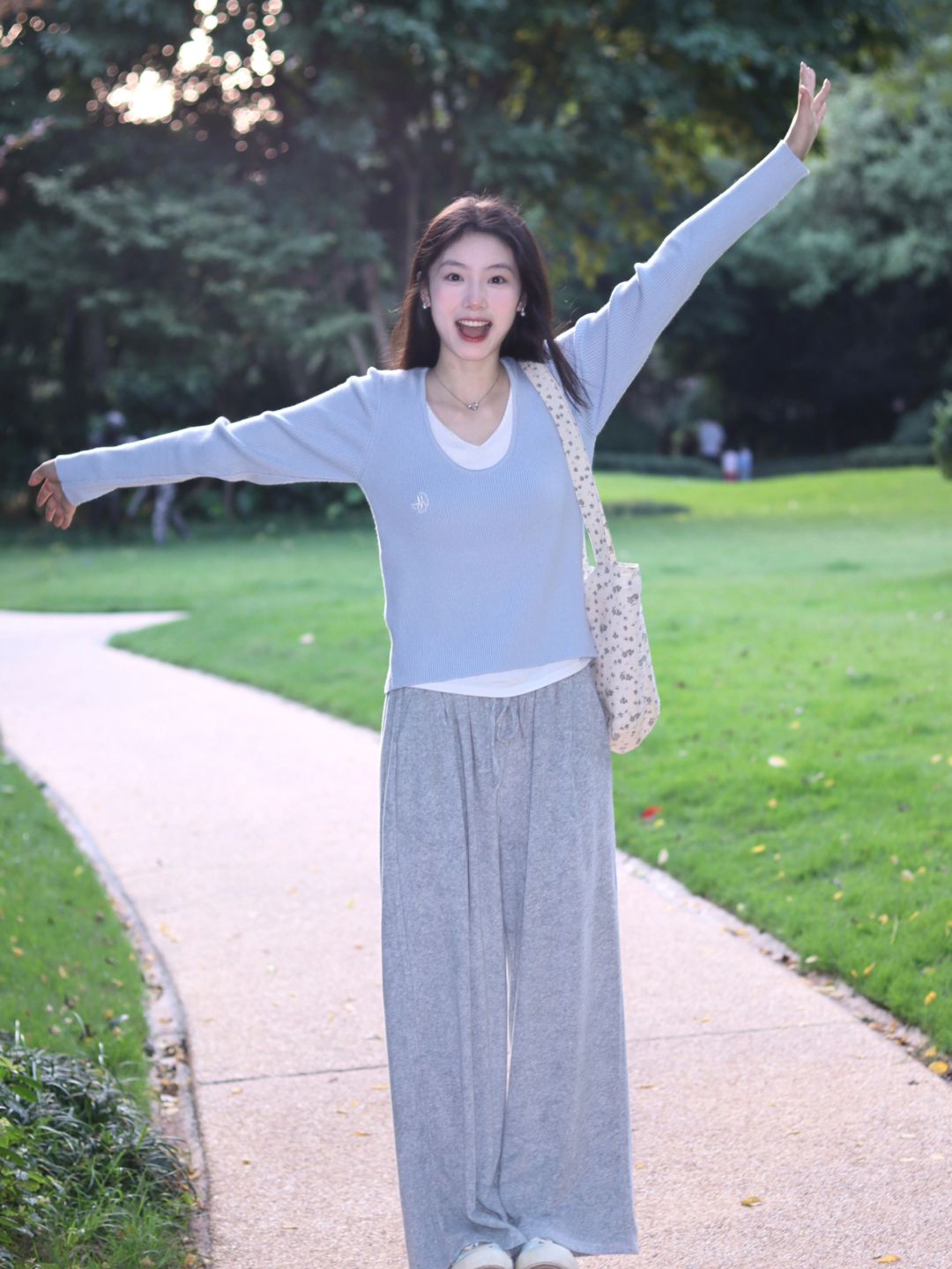 粉衫映夏草木香粉色T恤如撷取的夏花般明媚,白裤衬着茵茵草坪,静坐于绿意间的