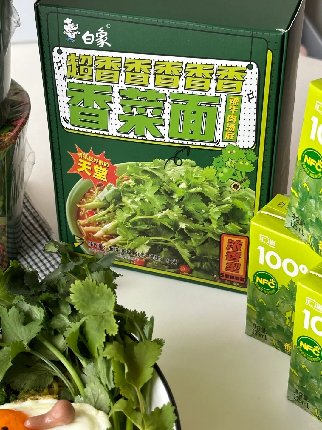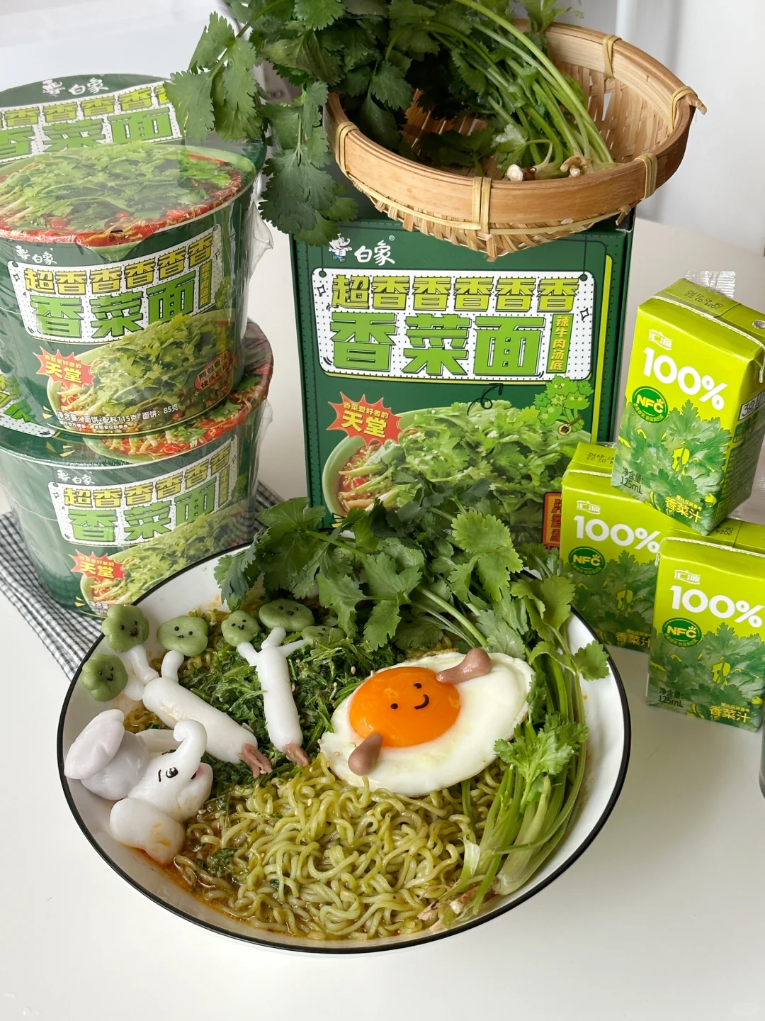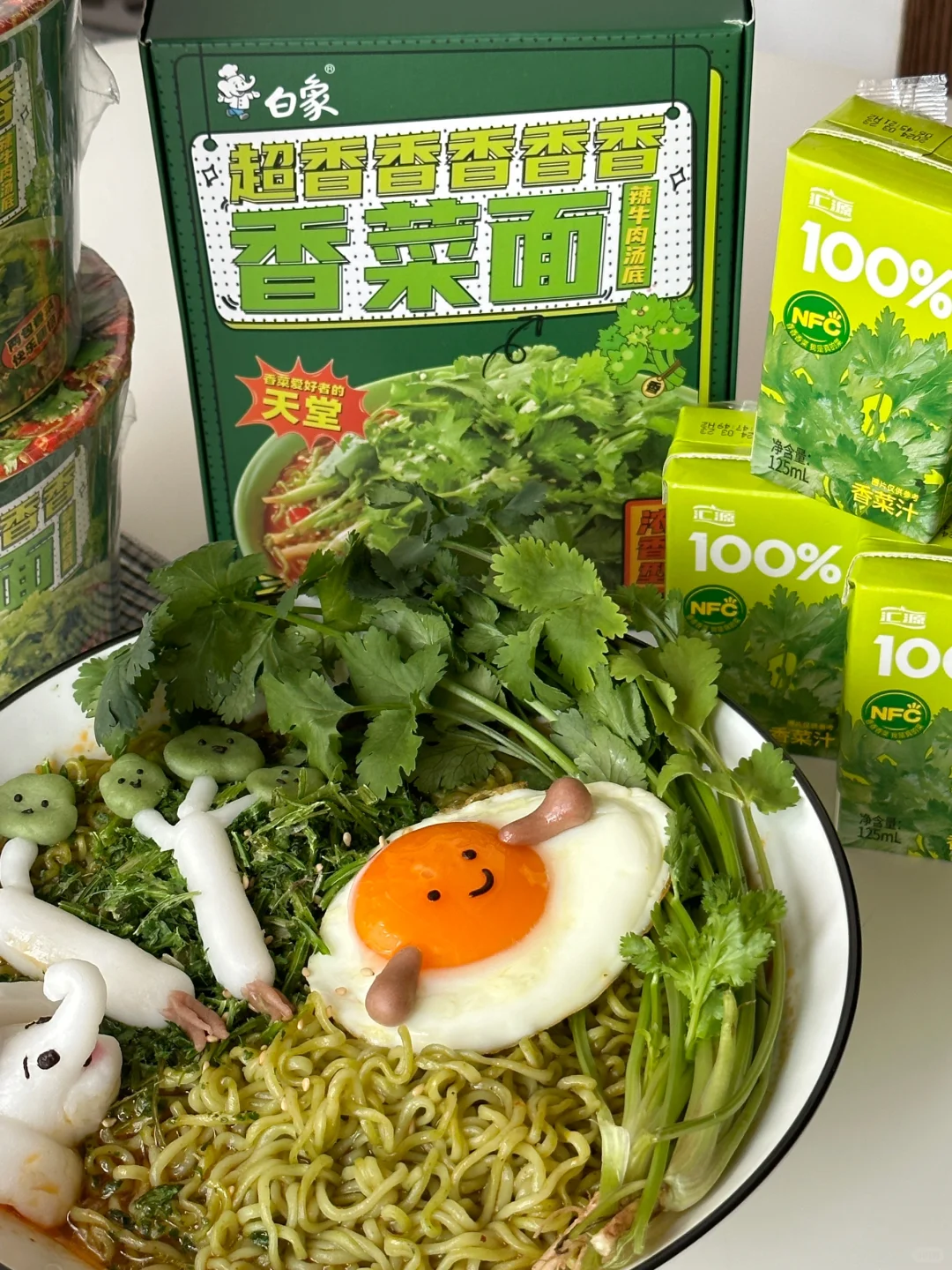 香菜🥬脑袋总有那么几天想要豪爽的享用香菜宴,今日就做一份可可爱爱的香菜面套餐吧![害羞R][害羞R] 所需材料: 白象香菜面,溏心煎蛋,冰皮预拌粉50g,沸水50g,新鲜香菜 制作步骤: ①冰皮粉中加入沸水,搅拌均匀揉成团,用抹茶粉,可可粉,仙人掌果粉调色,捏出可爱的jellycat香菜形象,小白象,以及jellycat煎蛋的小手。 ②把面饼放入600ml沸水中,2分钟时搅拌一下,使其松散并均匀受热 ③煮至三分钟加入汤包,继续煮至4分钟关火 ④呈出到碗中,铺上满满的香菜碎 ⑤点缀上可爱的jellycat香菜煎蛋以及小白象。接下来请仙女王子们尽情享用!! 💚香门永存!💚本香菜星人已经完全离不开白象香香香香香香菜面了~任何时候,泡碗这绿色的面条,香气四溢,劲道入味儿。每根面条上都挂满了香菜,搭配微辣的牛肉汤底,简直神清气爽,一口入魂!! 快来一起实现香菜自由吧~