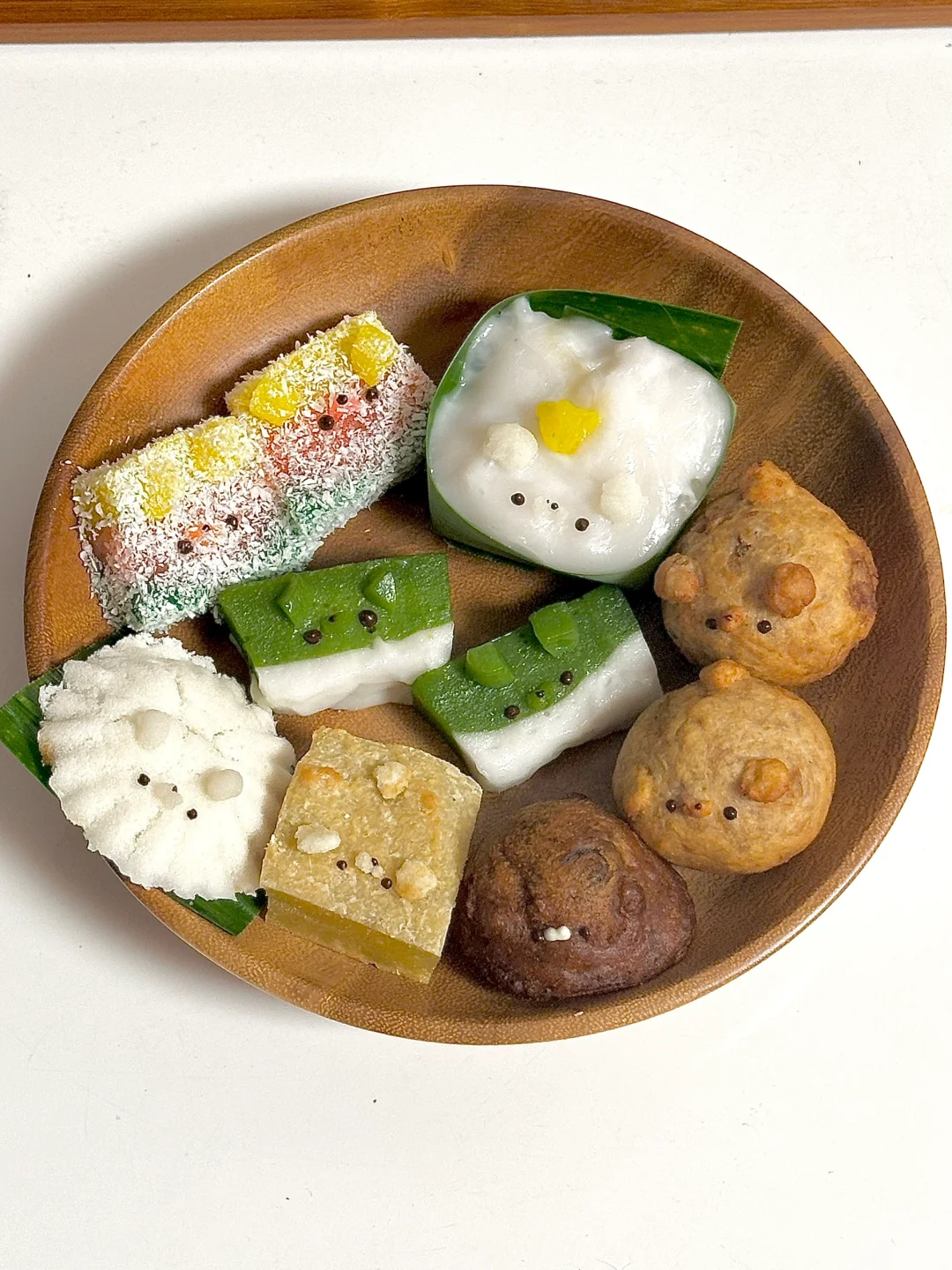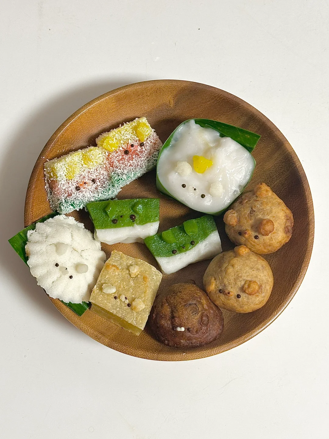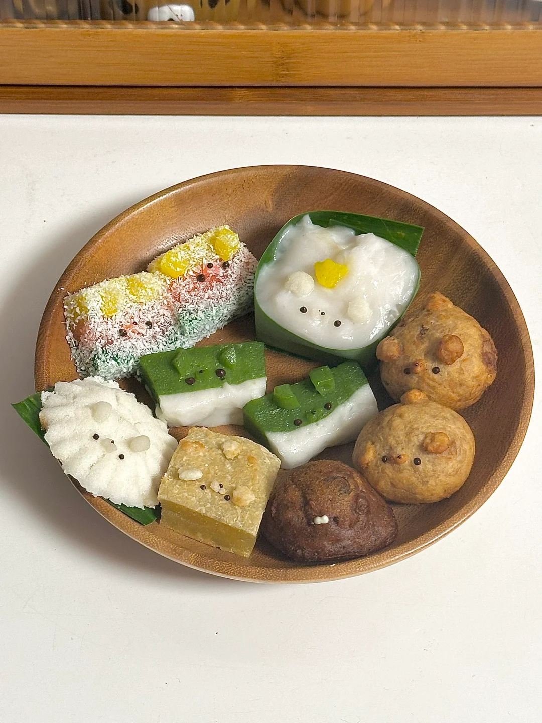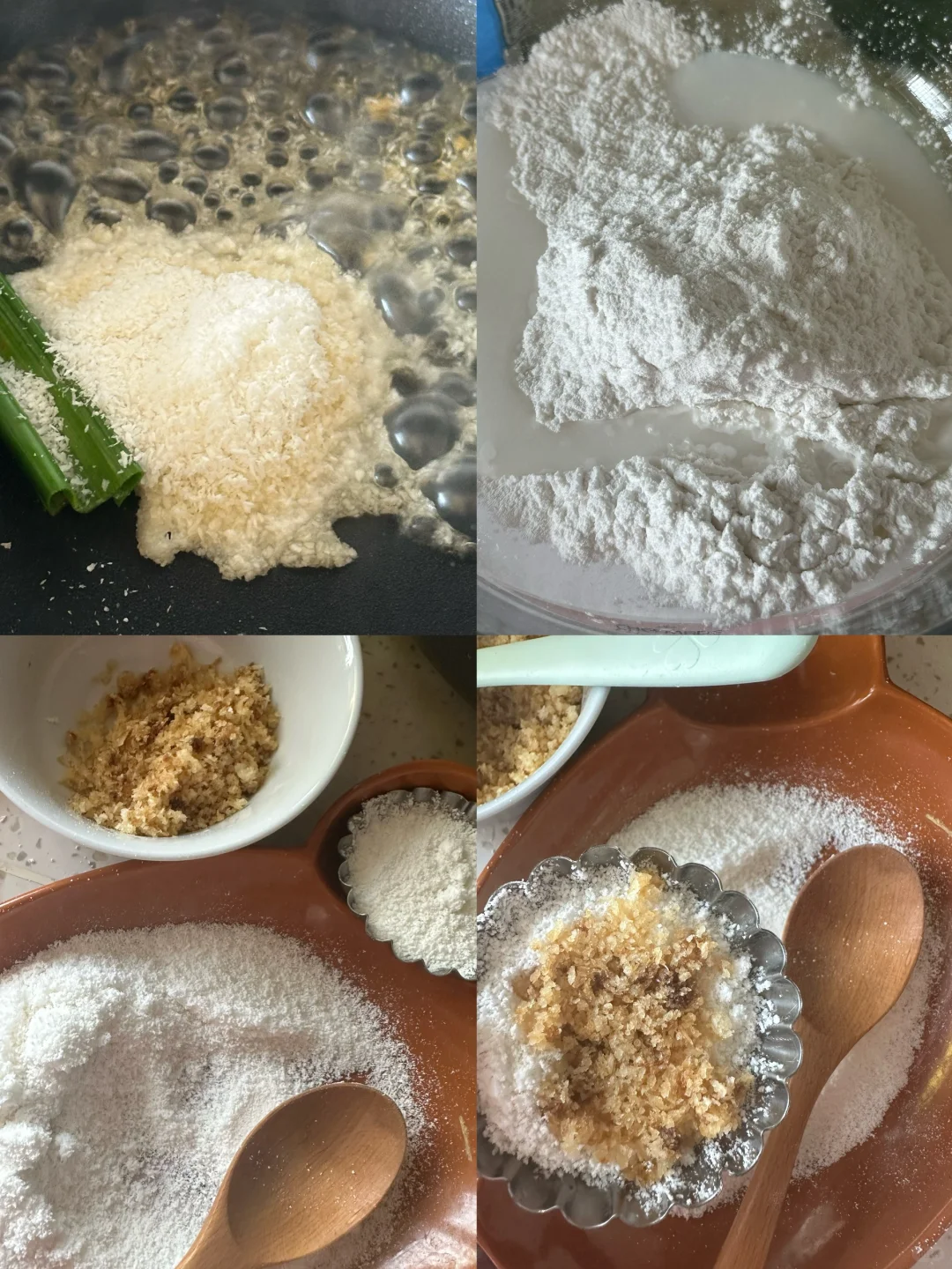 70g生木薯泥、8g糖、10g椰浆、一撮盐、10g木薯淀粉、(好像还得加点油,但是我忘了,表面有点坚硬)