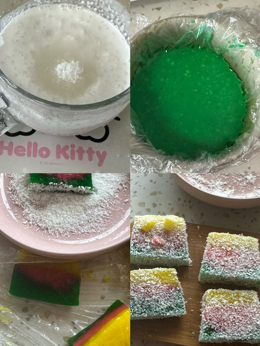 西米泡发加入椰浆、盐和糖拌匀,均分成三份调色,模具垫烘焙纸四面抹油,每层蒸13分钟左右(一层蒸熟再倒上第二层蒸),冷藏至完全冷却后切割并沾上椰蓉