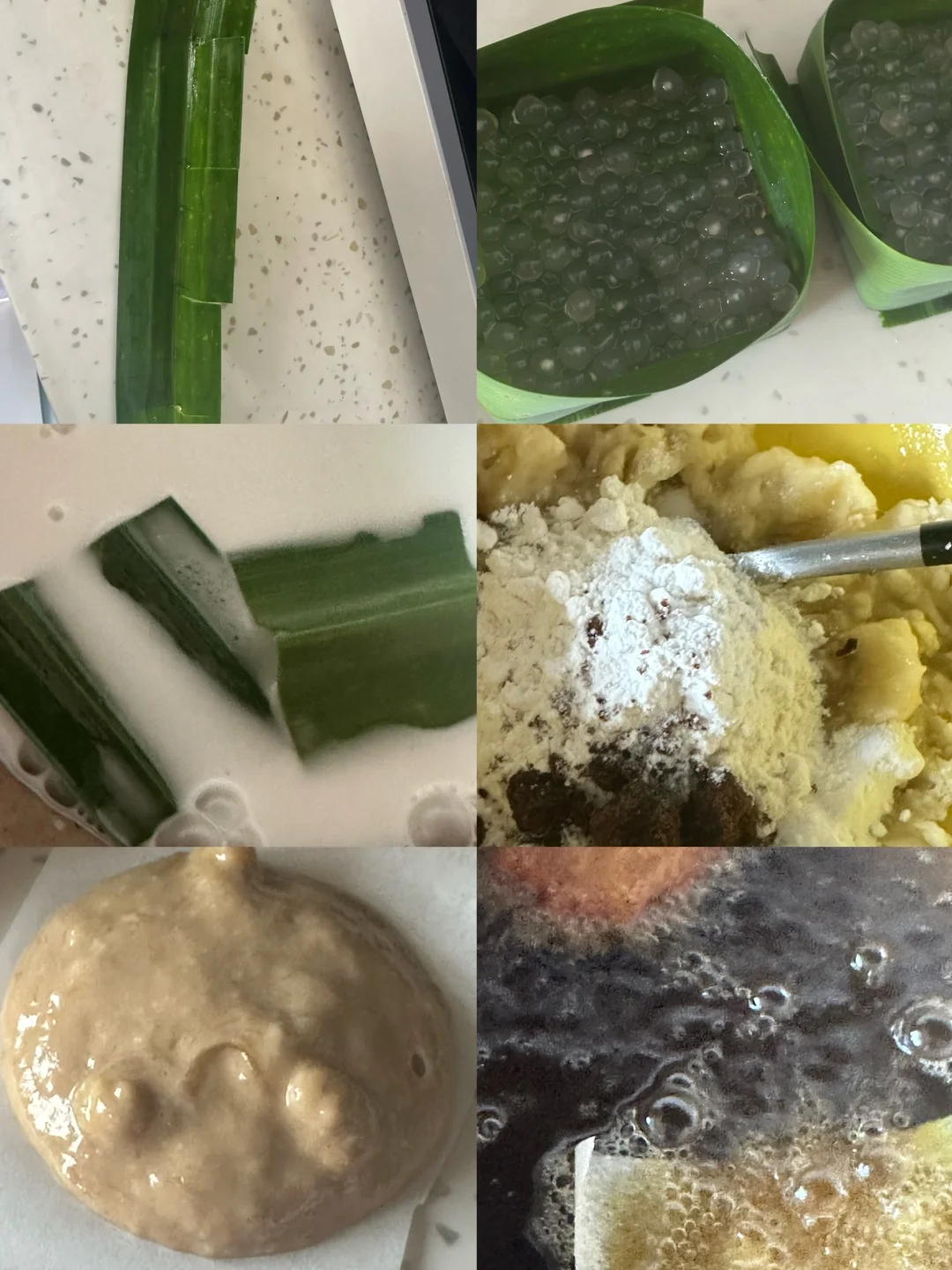 香蕉压烂,加入剩下所有配料搅匀,用勺子舀入锅中(或裱花袋挤)炸至熟透