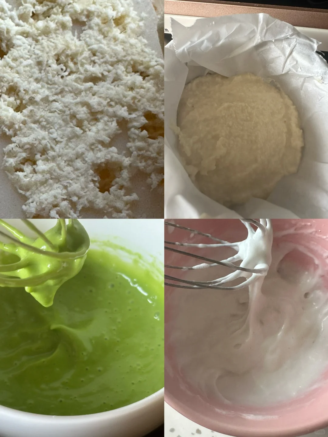 两种配料分别和匀,隔水加热至浓稠,模具垫上烘焙纸(我用的保鲜膜,因为我不想洗碗,感觉这个行为不是很健康,但是我还是这样做了),一层绿色一层白色倒入后蒸15分钟(因为我煮浓了,就一起倒进去蒸了,如果比较稀就先蒸一层再倒第二层),冷藏后切割