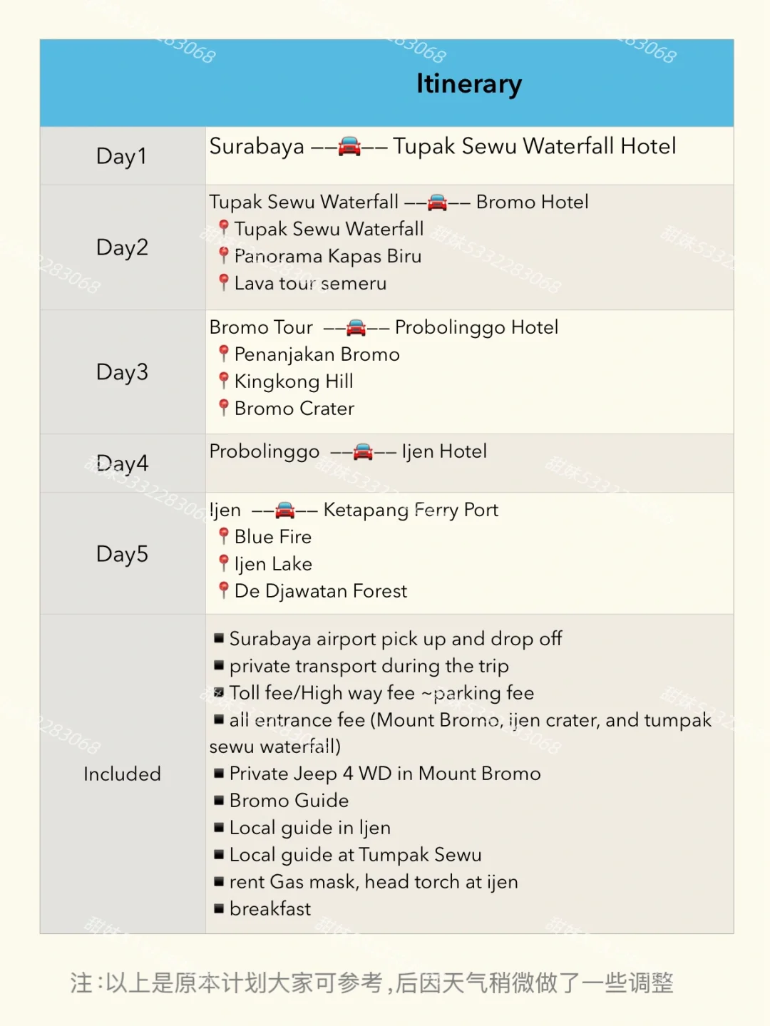 包含:泗水机场接机、去Bromo🌋的吉普车、Sewu瀑布向导、Ijen🌋向导、头灯、防du面具、护目镜🥽、去巴厘岛船票,及全部景区门票