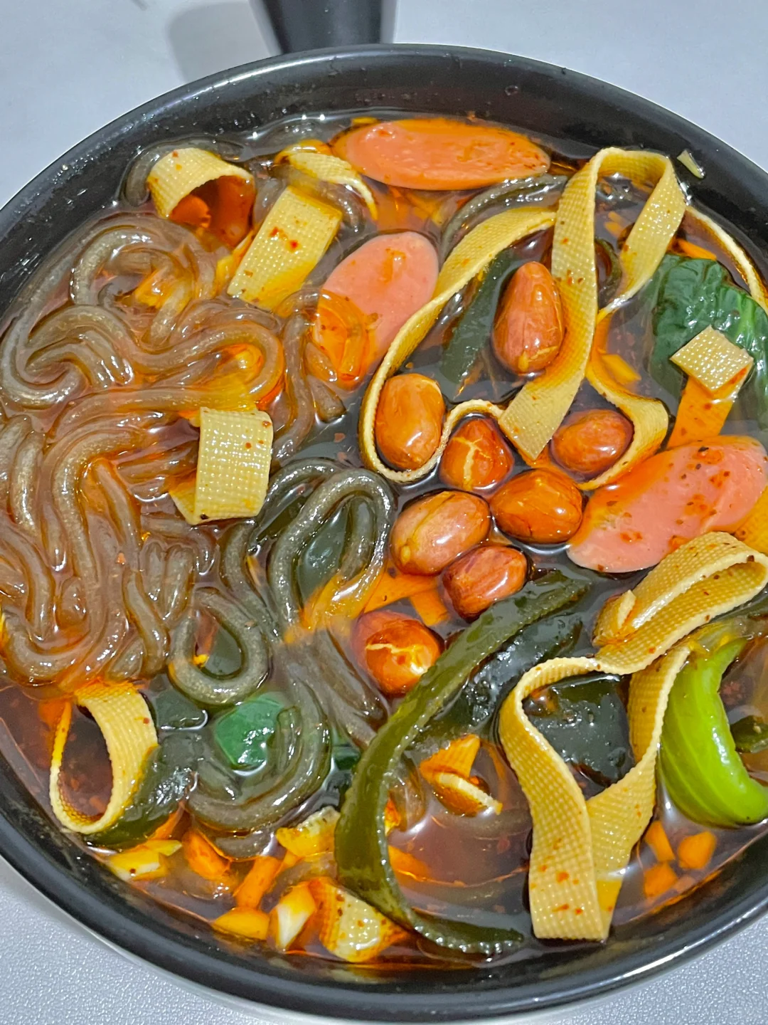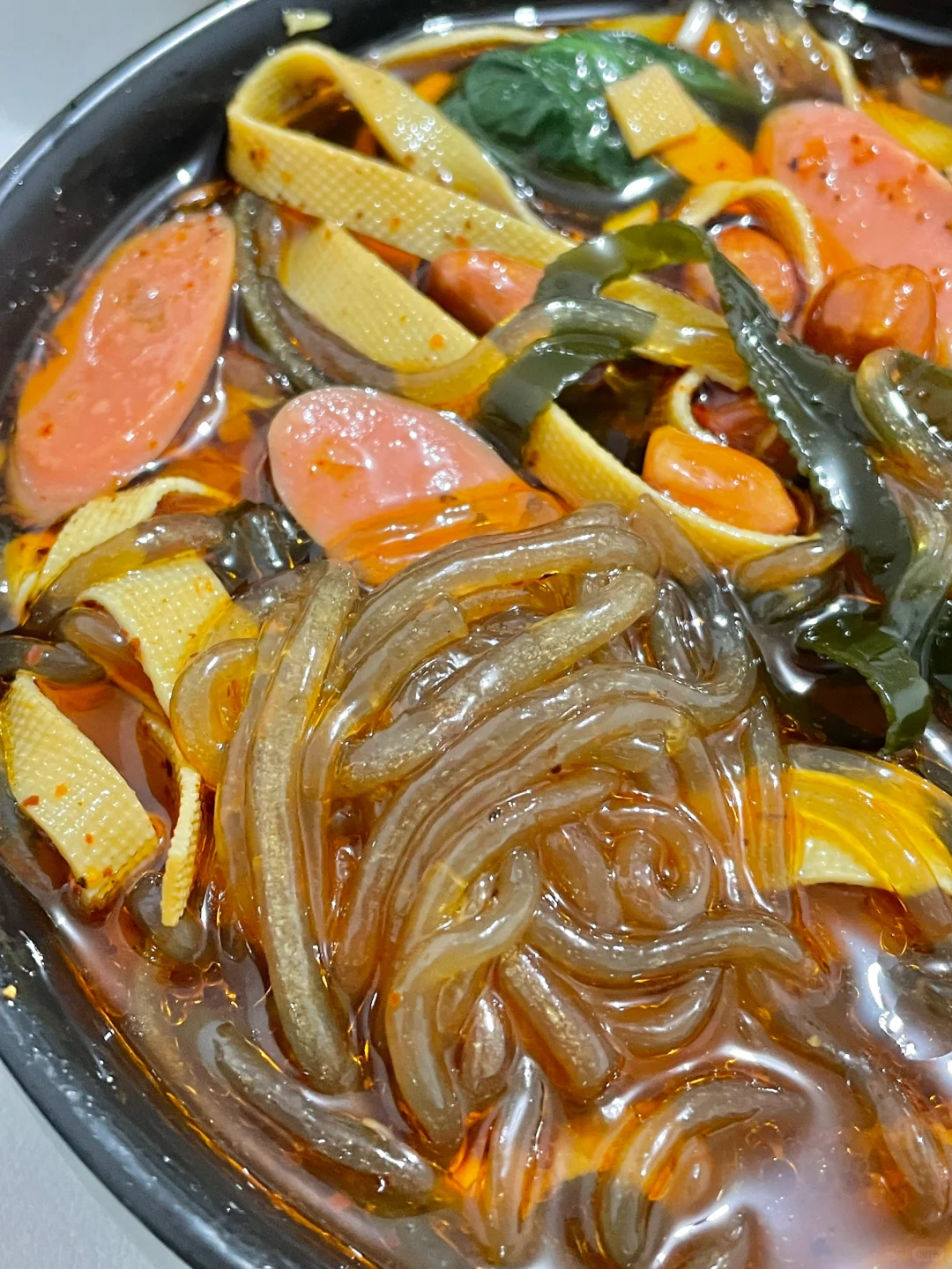 1️⃣红薯粉煮熟备用,配菜(海带、千张、生菜、火腿)烫熟备用。