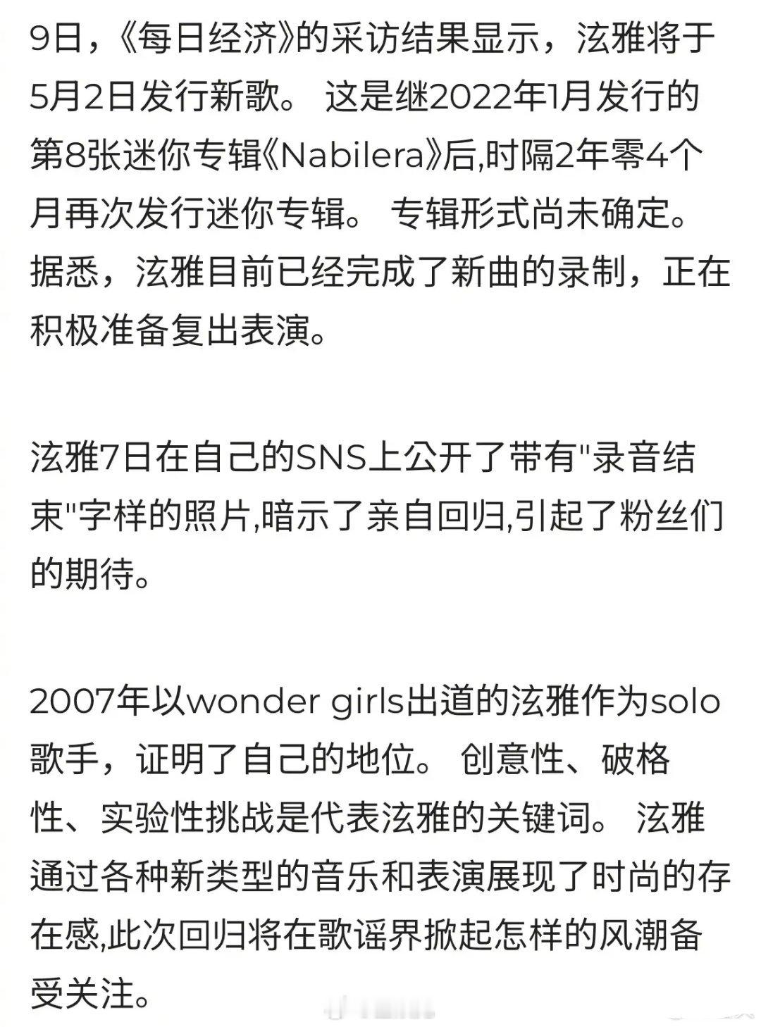 据韩媒报道,泫雅确定将于5月2号回归。目前已完成了新歌的录制,正在积极准备回归舞