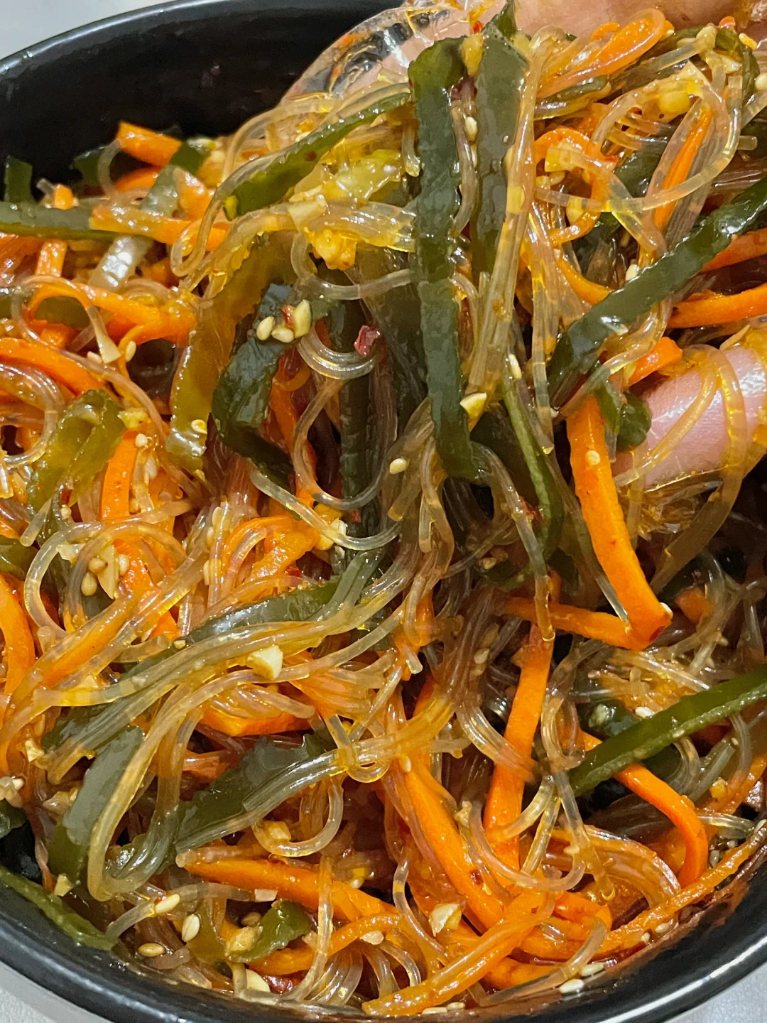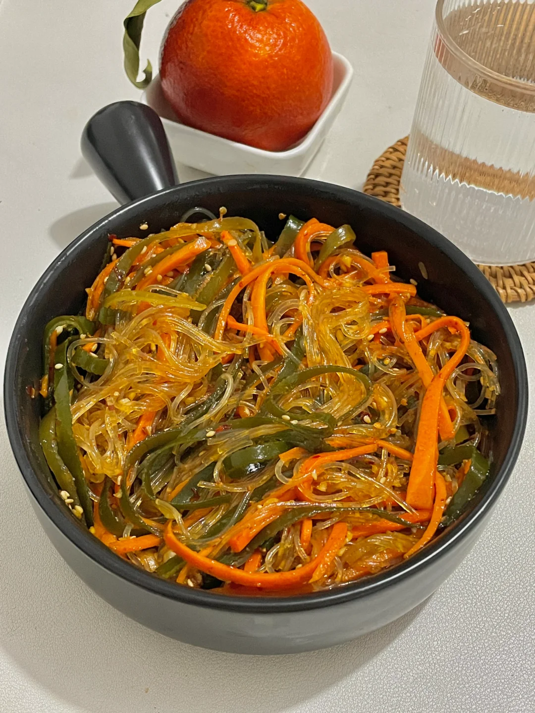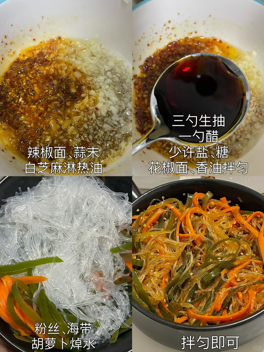 1️⃣辣椒面、蒜末、白芝麻淋热油。加三勺生抽、一勺醋、少许盐、糖、花椒面、香油拌匀2️⃣粉丝、海带、胡萝卜焯水,倒入酱汁拌匀即可。