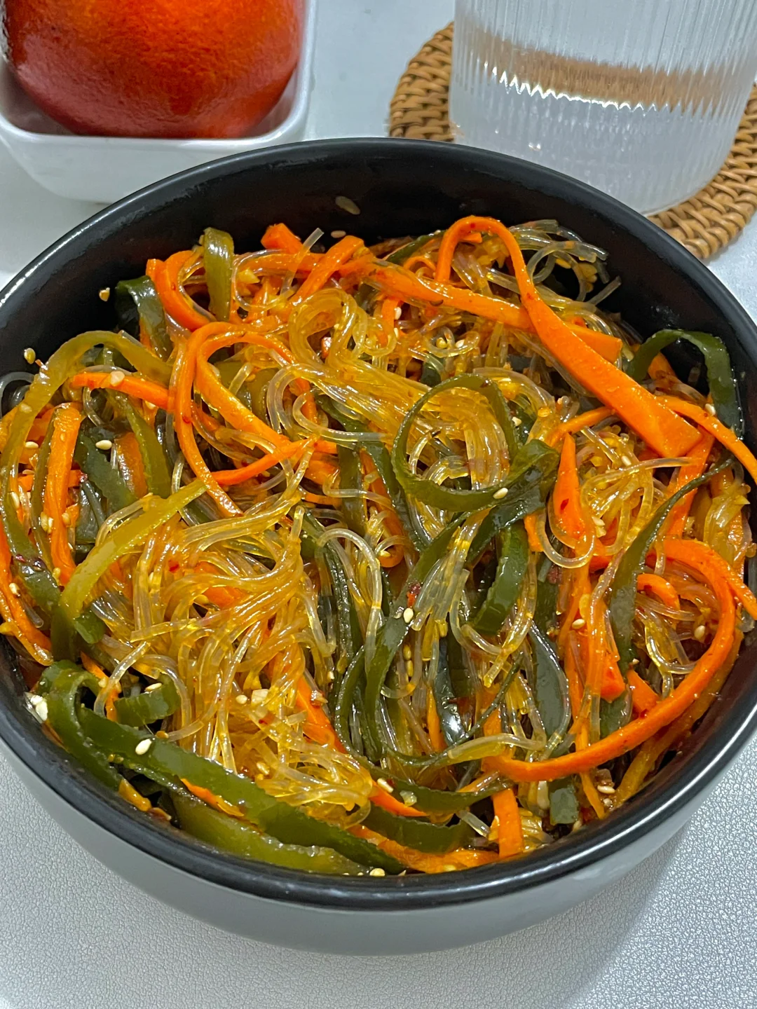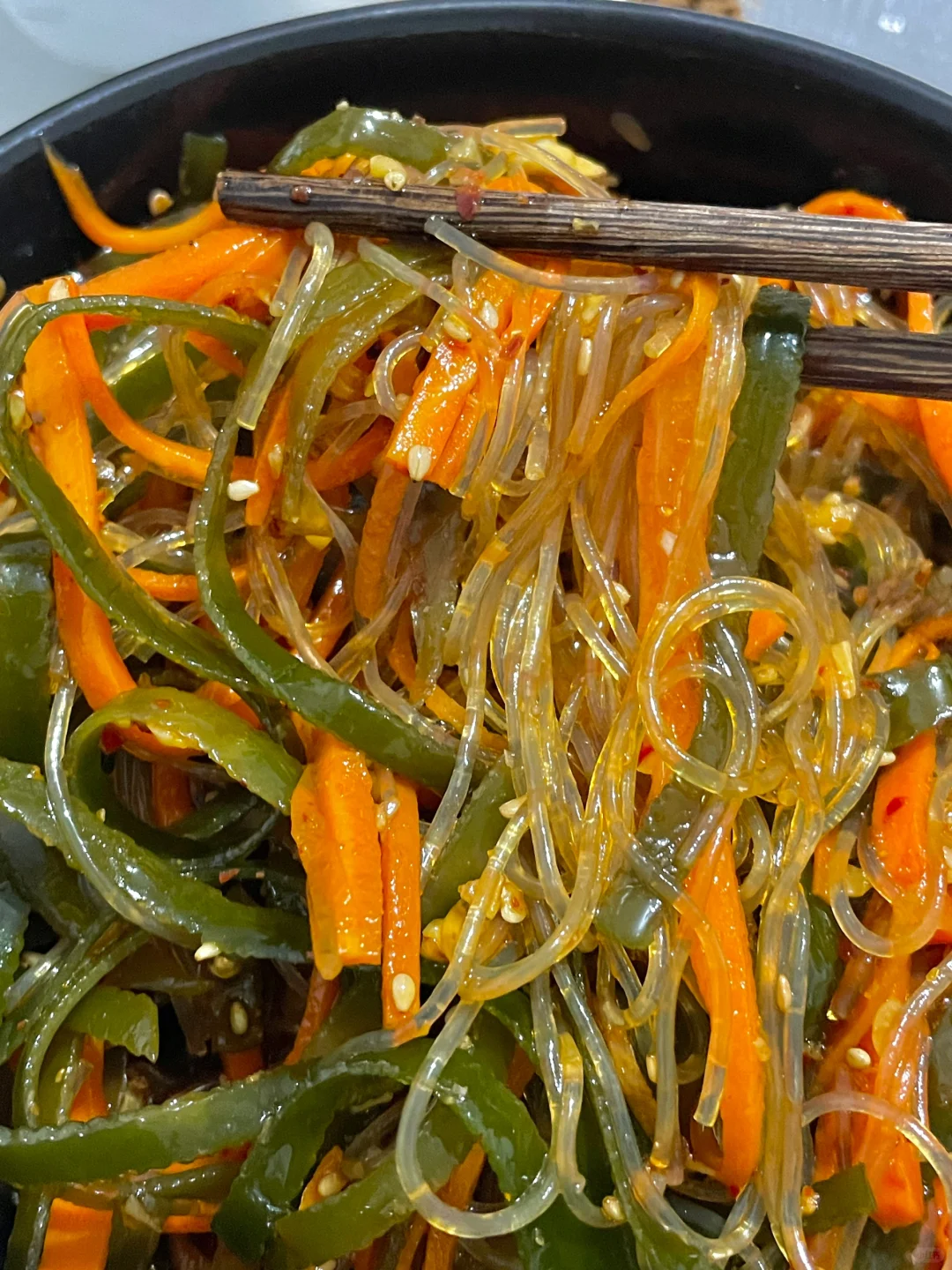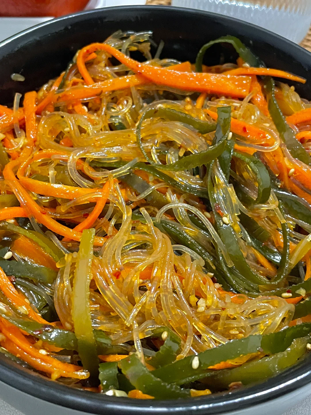 1️⃣辣椒面、蒜末、白芝麻淋热油。加三勺生抽、一勺醋、少许盐、糖、花椒面、香油拌匀2️⃣粉丝、海带、胡萝卜焯水,倒入酱汁拌匀即可。