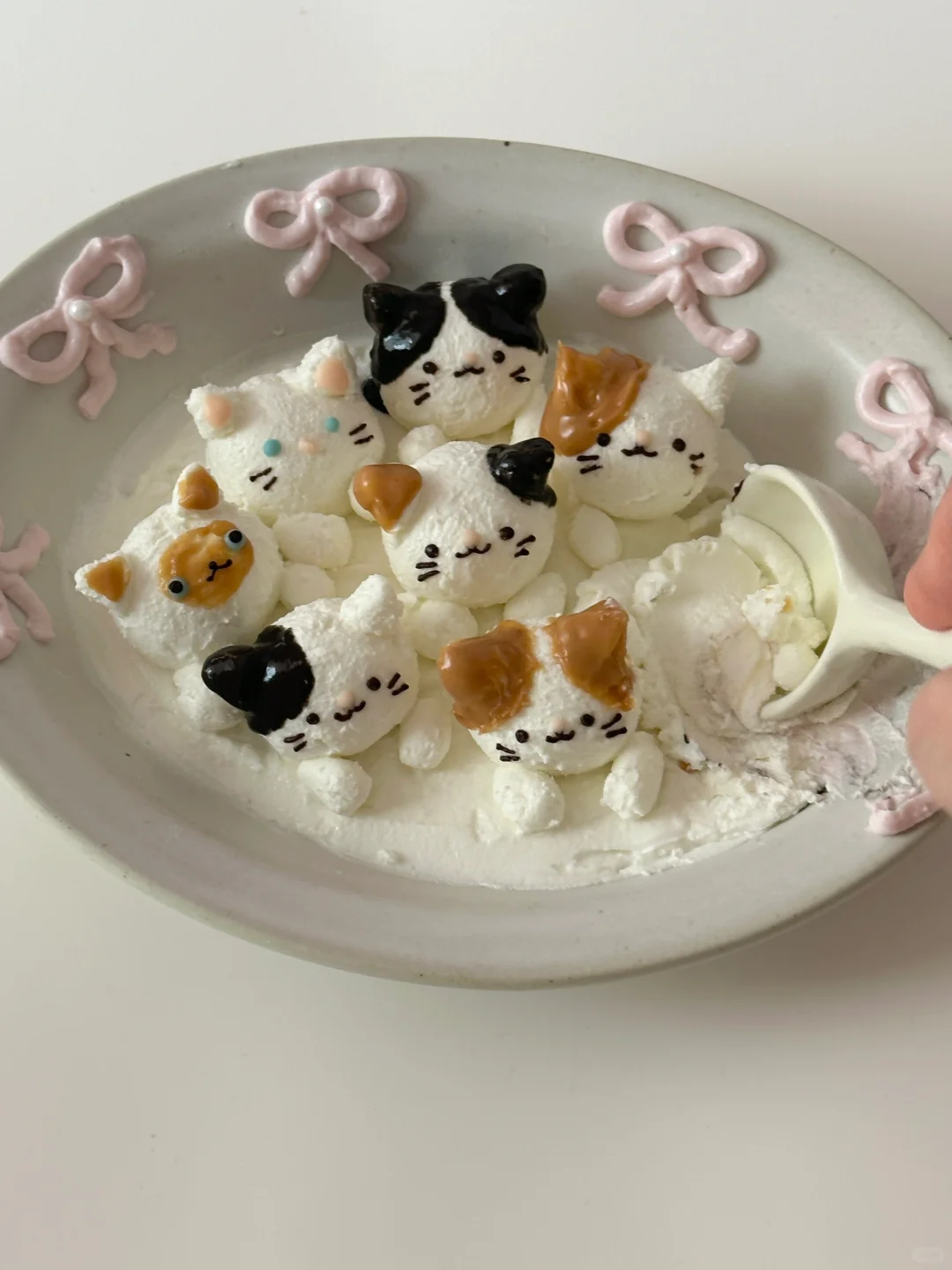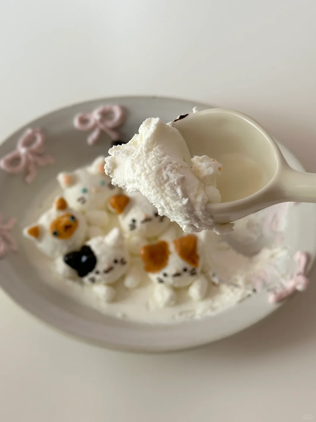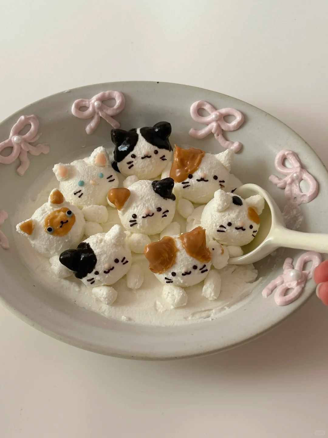 我又来捏猫啦,这次当然不能错过春日减肥必备的干噎希腊酸奶碗,绵密的乳酪状酸奶,像冰淇淋一样奶香浓郁呀~ 制作步骤: ①希腊式酸奶装在纱布中用酸奶过滤器或者直接挂起来过滤乳清一晚 ②碗中放入麦片,过滤好的酸奶平铺碗底,剩余的捏成一碗小猫造型 ③用给芝麻酱,花生酱,彩色巧克力笔画出小猫花纹五官 ④少许酸奶混合仙人掌果粉调成粉色,装入裱花袋在碗边画出蝴蝶结造型 每一口都可以吃掉一个猫猫头😎 快来交作业吧~[害羞R][害羞R]