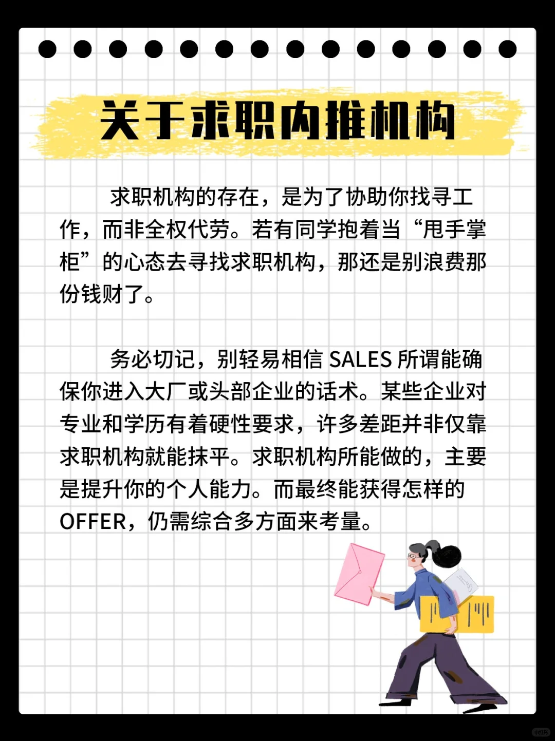 求职机构的存在,是为了协助你找寻工作,而非全权代劳。若有同学抱着当“甩手掌柜”的心态去寻找求职机构,那还是别浪费那份💵了。