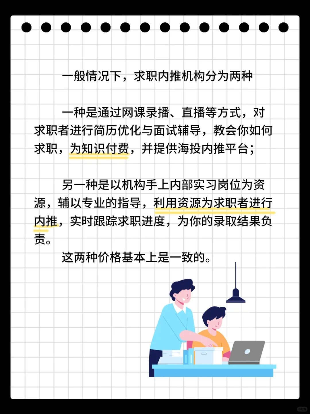 🤨一般情况下,求职内推机构分为两种,➡️一种是通过网课录播、直播等方式,对求职者进行简历优化与面试辅导,教会你如何求职,为知识付费,并提供海投内推平台;➡️另一种是以手上内部实习岗位为资源,辅以专业的指导,利用资源为求职者进行内推,实时跟踪求职进度,为你的录取结果负责。这两种价格基本上是一致的。