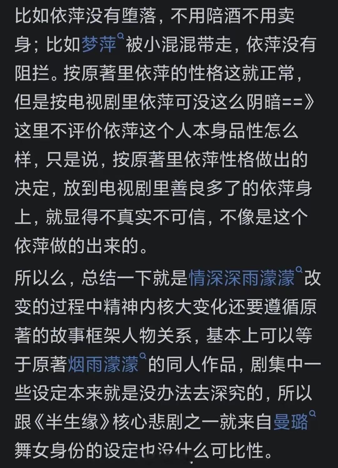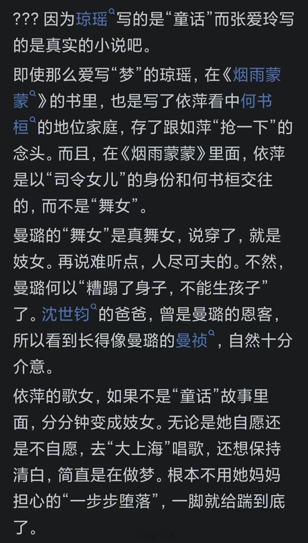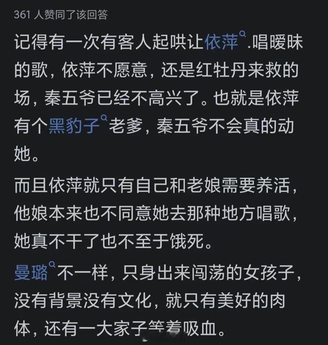 曼璐一家子就是吸血鬼,大女儿卖,儿子女儿都心高气傲地读书工作,家里的老娘奶奶还一副大户人家的样子,啥家庭不知道啊还请保姆,最后还一个个一脸恨铁不成钢地怪大女儿丢了他们家的人!其实什么半生缘,她妹妹爱而不得相比她姐能有多可怜,曼璐最可恨的一点至多也就是把她妹妹推给了祝鸿才,除此之外,我觉得曼璐一点儿错都没有