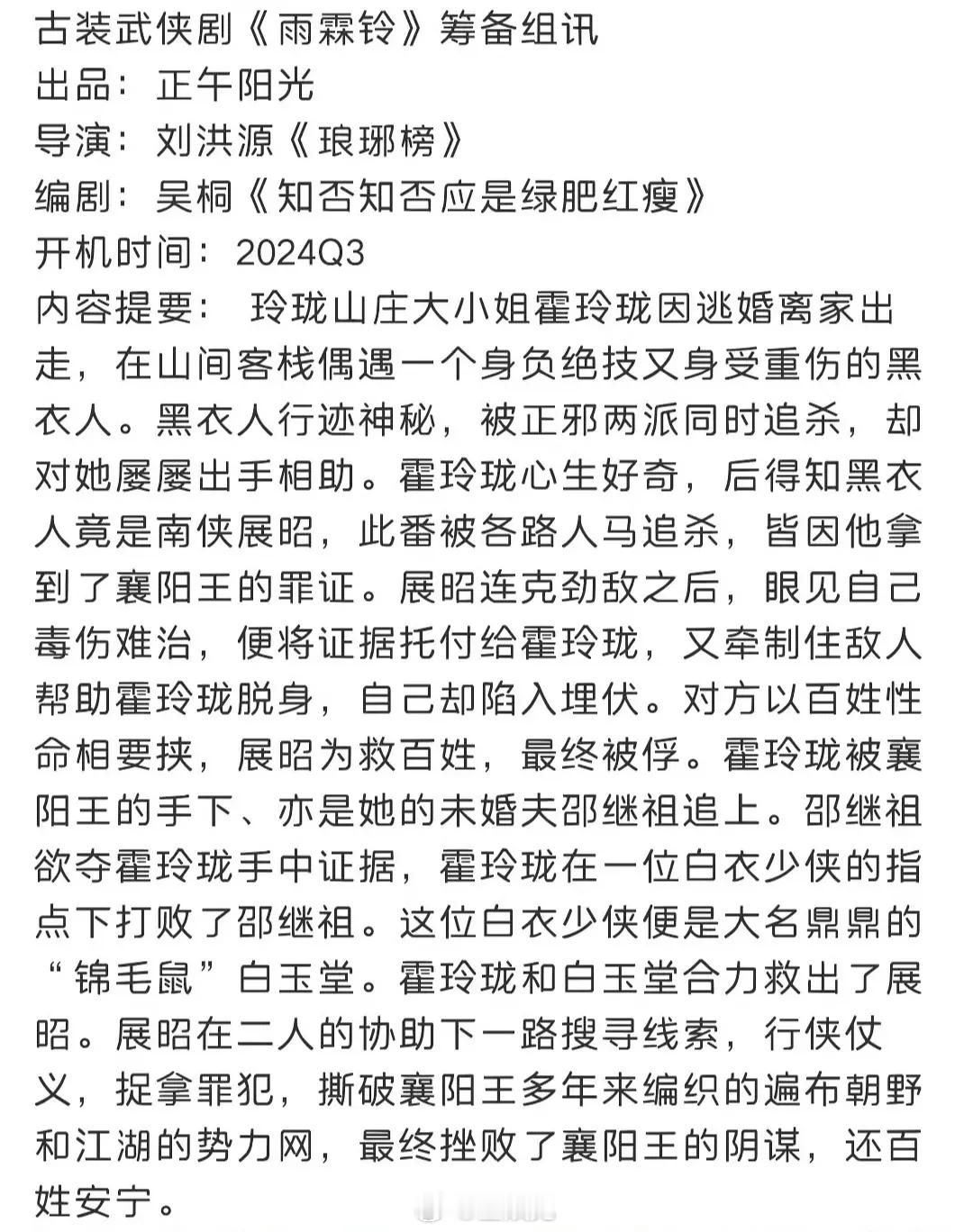 网传正午阳光《雨霖铃》九月开机,主演是杨洋~
