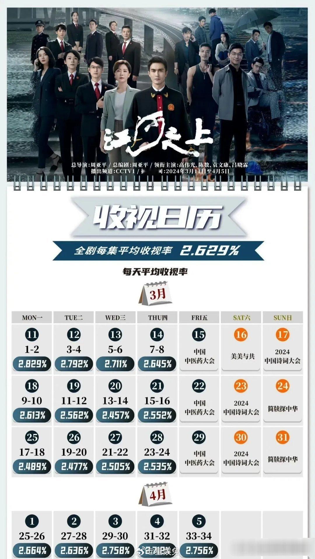 3.高伟光、陈数主演的《江河之上》央一平均2.629,最高是开播当日的2.829。