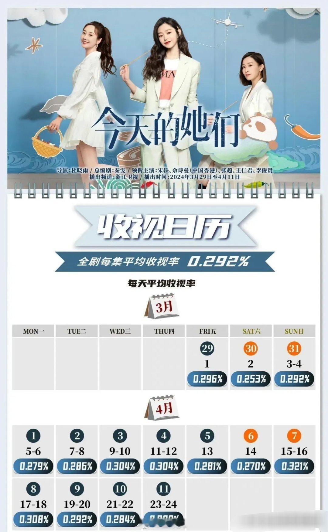 2.宋轶、佘诗曼主演的《今天的她们》浙江卫视平均0.292,最高是0.321。