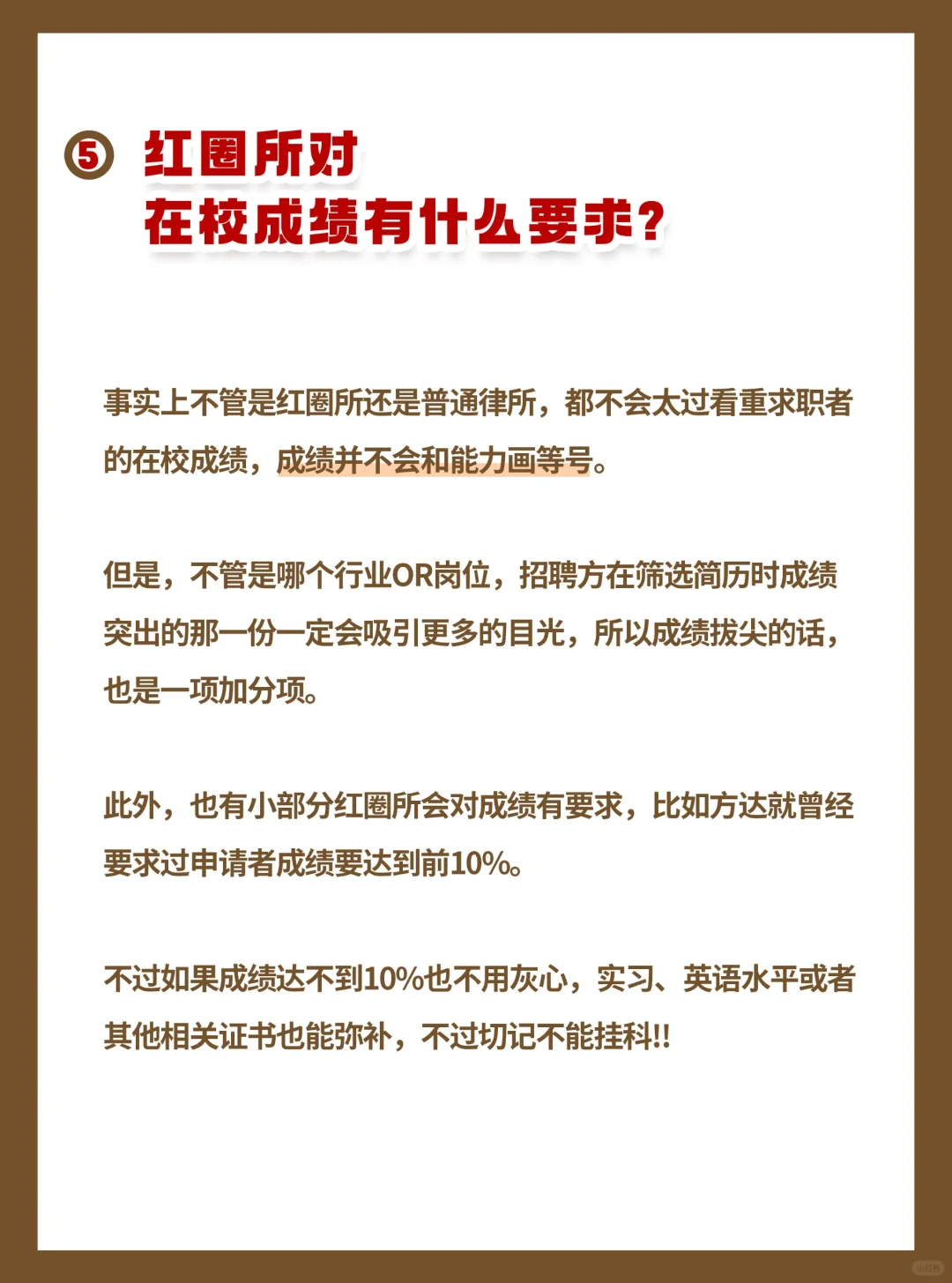 事实上不管是红圈所还是普通律所,都不会太过看重求职者的在校成绩,成绩并不会和能力画等号😅。不过也有小部分红圈所会对成绩有要求,比如方达就曾经要求过申请者成绩要达到前 10%🙄。