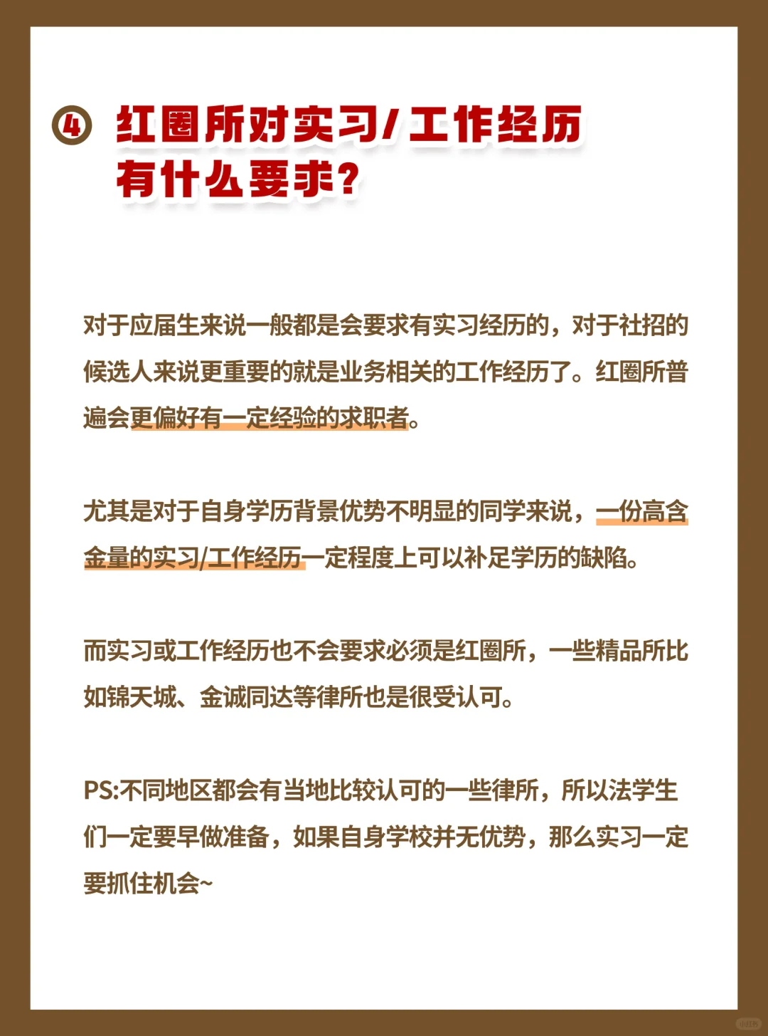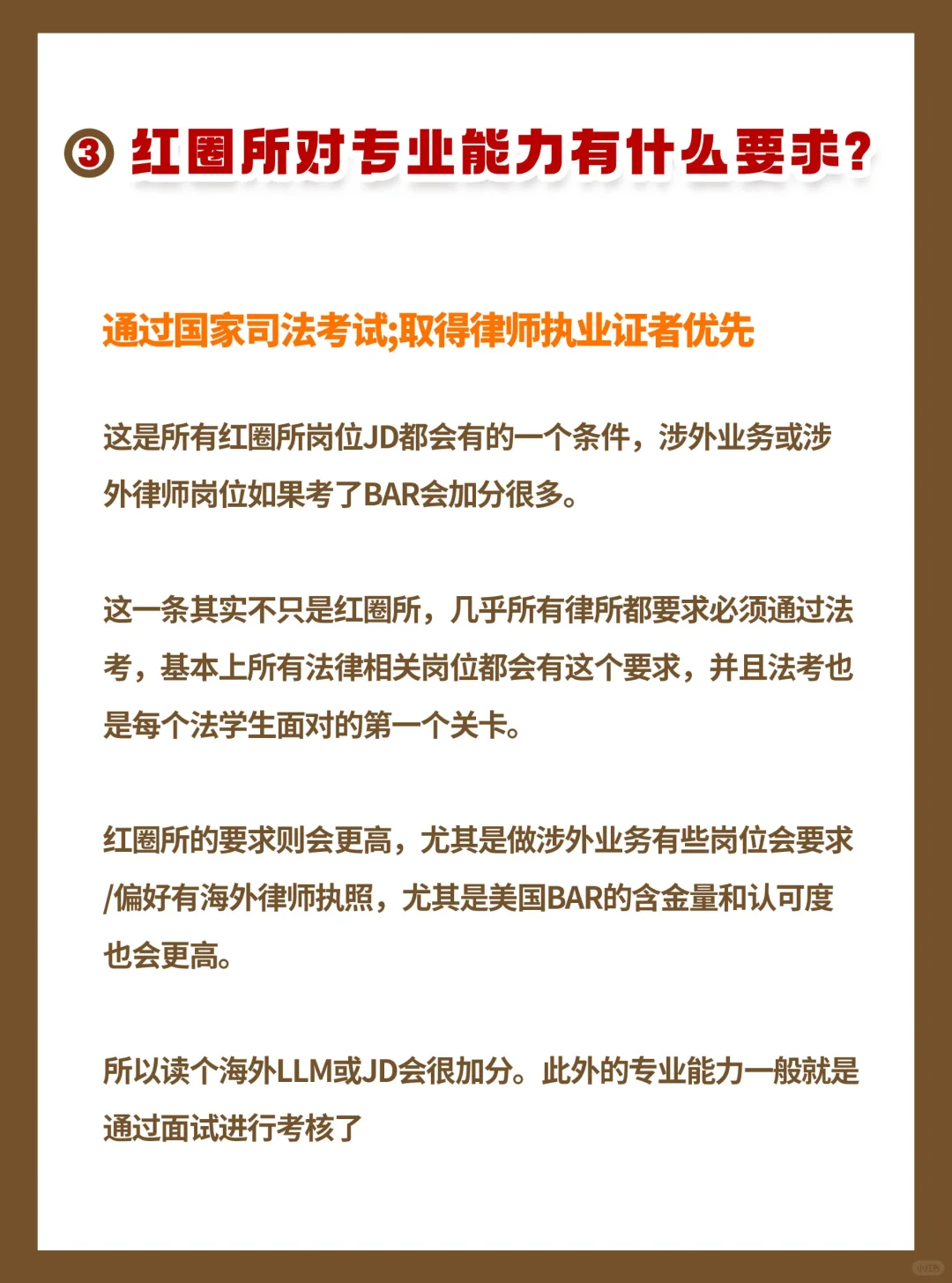 通过国家司法考试🎯;取得律师执业证者优先。不只是红圈所,几乎所有律所都要求必须通过法考,基本上所有法律相关岗位都会有这个要求,红圈所的要求则会更高,尤其是美国 bar 的含金量和认可度也会更高🤓。